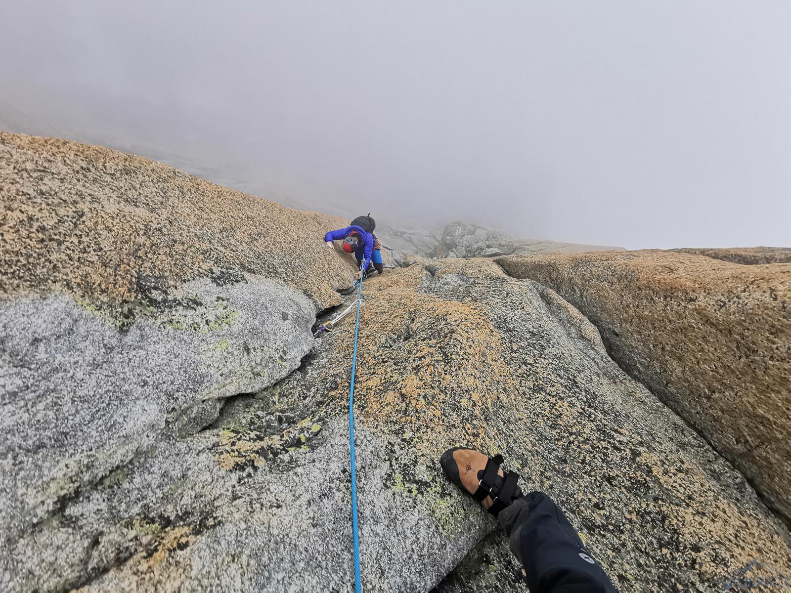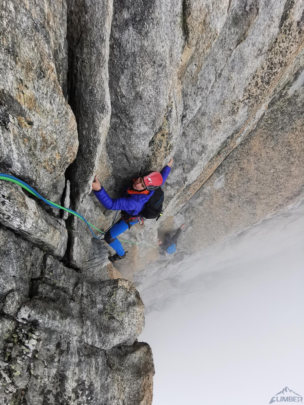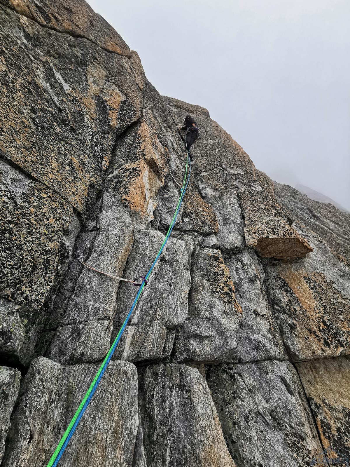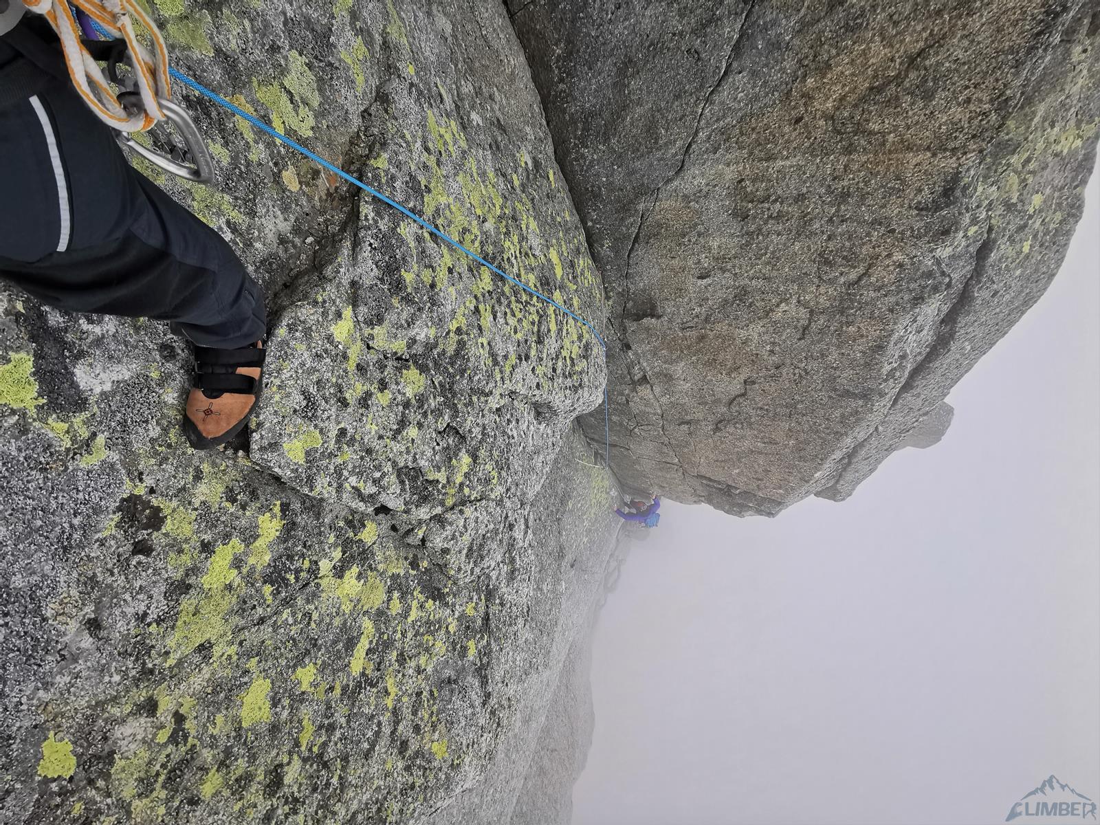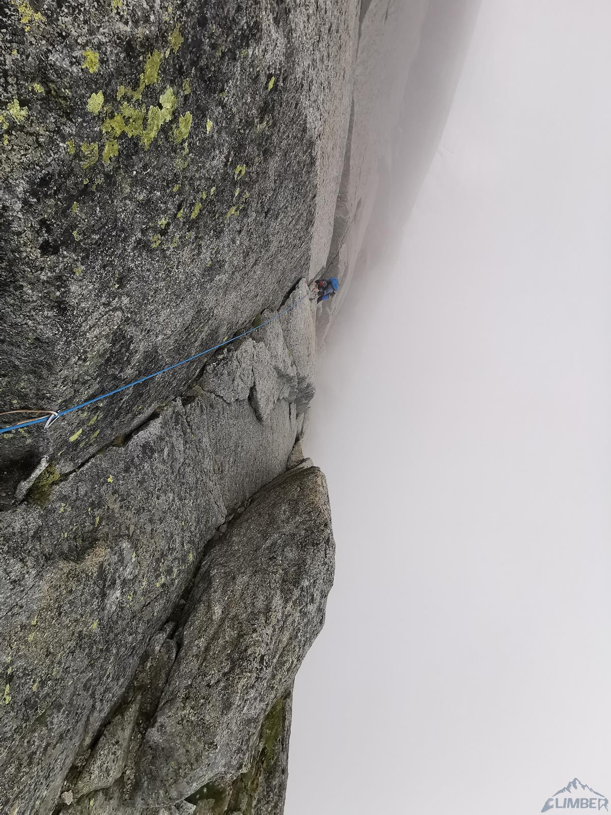 Naradzamy się kilka minut co robić – zgodnie z prognozami pogoda pogarsza się, jednak ponieważ jesteśmy powyżej punktu izotermy z nieba nie leci deszcz, lecz delikatny śnieg, który nie moczy ściany – poza odrętwiałymi palcami jest więc ok 😊. W końcu podejmujemy decyzję by wspinać się tak wysoko jak damy radę – wycofamy się od razu gdy zacznie mocniej padać lub po prostu nie będziemy w stanie trzymać się skały. Na wyciągu 18-tym idę niestety za bardzo w prawo, co powoduje, że na kolejnym wyciągu czeka nas niespodziewana trudność – przewieszony fragment doprowadzający do właściwej drogi, na którym dość mocno się wypompowuję. Szymon przejmuje prowadzenie – czas nas wyciąg nr. 22 (6b), wg mnie najładniejszy na całej drodze – na 40 metrach mamy do przejścia ryskę z dilfrem, połogą płytę i ciasne zacięcie – bellissima! Po takim odcinku kolejny, z rysą za V+, to już formalność, wyżej czeka nas jednak stresujący wyciąg nr. 22 z przerysą (6b). Zbieram się kilka minut, rozgrzewam palce i głośno narzekam, że wbrew opisom nie zdublowaliśmy cama nr 4 – psycha przy pakowaniu dopisywała, teraz jest gorzej 😉. Ostrożnie wspinam się metr po metrze, a gdy już nie da się wyżej przesuwać mojego największego przyjaciela, przychodzi pora na kilka odważnych ruchów i jestem przy stanie. Ściągam kolegów i ruszamy dalej – kolejne 50 metrów prowadzi łatwymi (V-) zacięciami i rysami, nie zatrzymuję na stanowisku i ostatni odcinek wyprowadzający na grań dociągamy na lotnej – nie było to zbyt rozsądny pomysł bo na wyciąganiu liny tracę mnóstwo siły.
