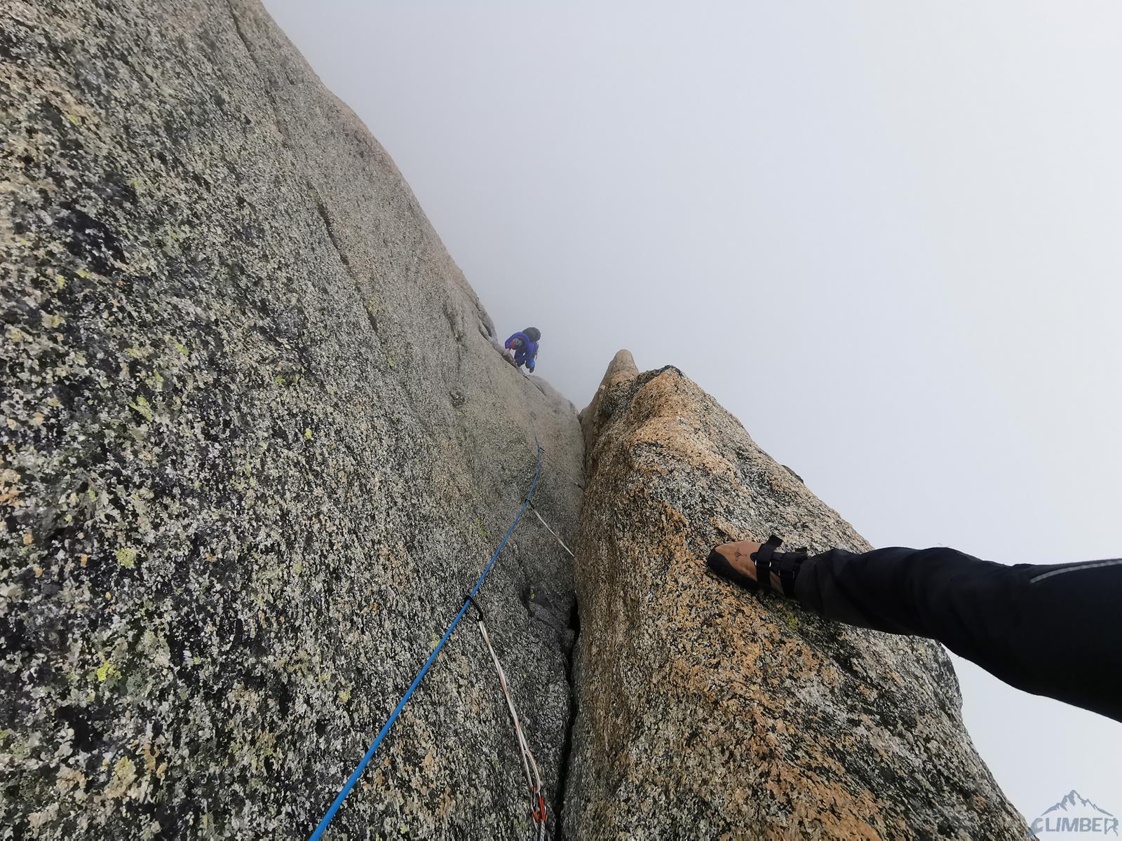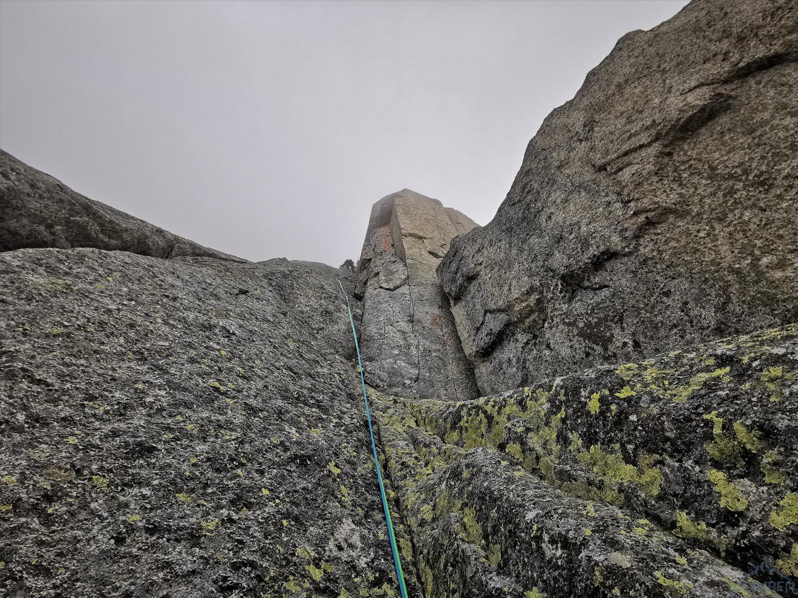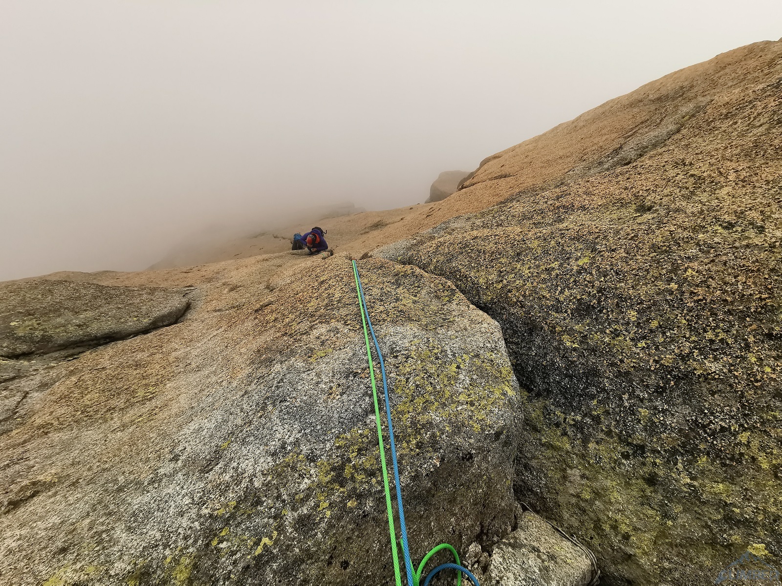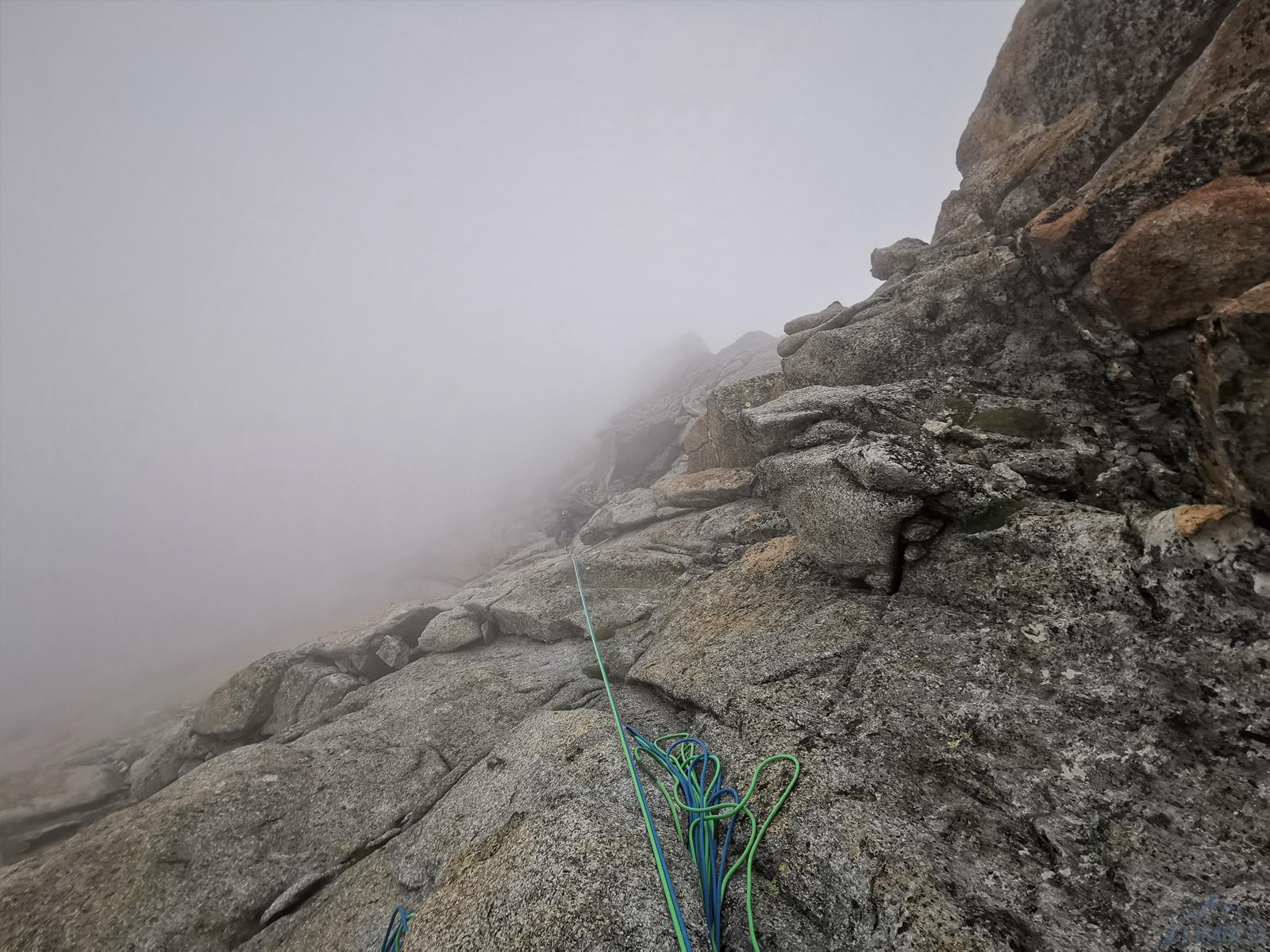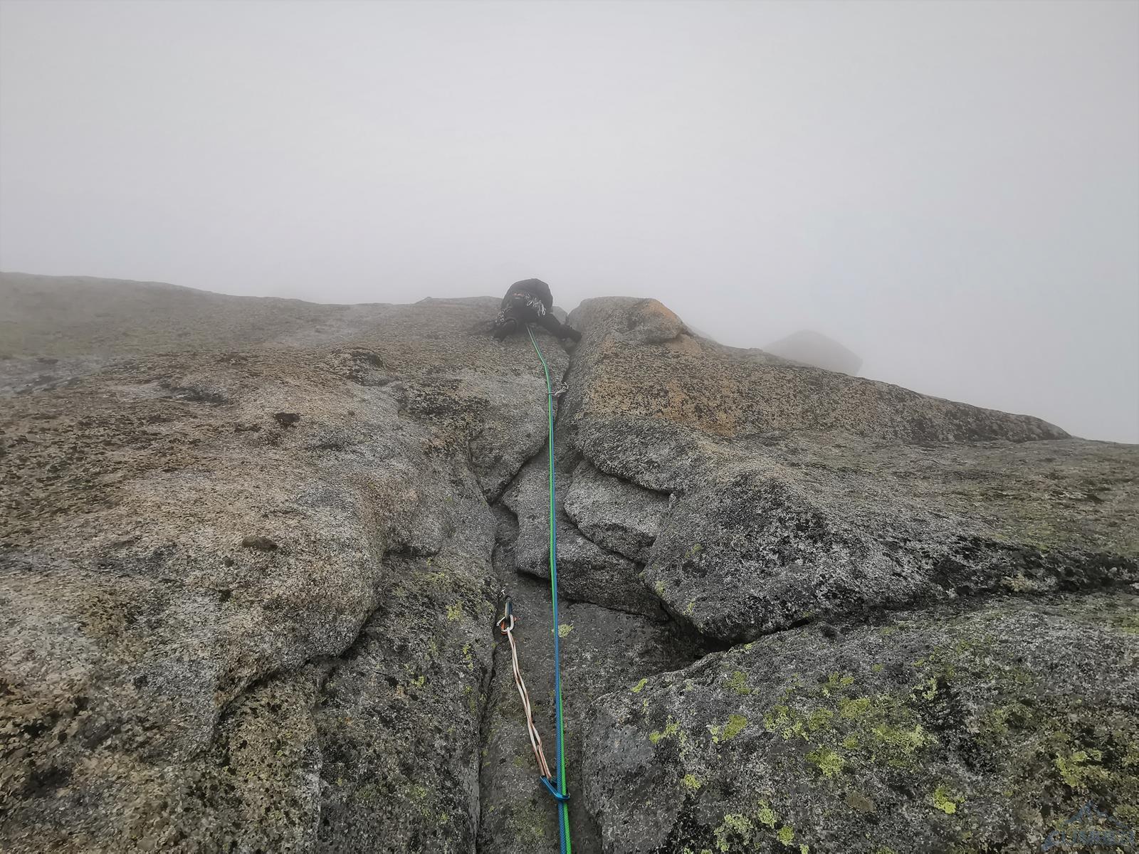 Naradzamy się kilka minut co robić – zgodnie z prognozami pogoda pogarsza się, jednak ponieważ jesteśmy powyżej punktu izotermy z nieba nie leci deszcz, lecz delikatny śnieg, który nie moczy ściany – poza odrętwiałymi palcami jest więc ok 😊. W końcu podejmujemy decyzję by wspinać się tak wysoko jak damy radę – wycofamy się od razu gdy zacznie mocniej padać lub po prostu nie będziemy w stanie trzymać się skały. Na wyciągu 18-tym idę niestety za bardzo w prawo, co powoduje, że na kolejnym wyciągu czeka nas niespodziewana trudność – przewieszony fragment doprowadzający do właściwej drogi, na którym dość mocno się wypompowuję. Szymon przejmuje prowadzenie – czas nas wyciąg nr. 22 (6b), wg mnie najładniejszy na całej drodze – na 40 metrach mamy do przejścia ryskę z dilfrem, połogą płytę i ciasne zacięcie – bellissima! Po takim odcinku kolejny, z rysą za V+, to już formalność, wyżej czeka nas jednak stresujący wyciąg nr. 22 z przerysą (6b). Zbieram się kilka minut, rozgrzewam palce i głośno narzekam, że wbrew opisom nie zdublowaliśmy cama nr 4 – psycha przy pakowaniu dopisywała, teraz jest gorzej 😉. Ostrożnie wspinam się metr po metrze, a gdy już nie da się wyżej przesuwać mojego największego przyjaciela, przychodzi pora na kilka odważnych ruchów i jestem przy stanie. Ściągam kolegów i ruszamy dalej – kolejne 50 metrów prowadzi łatwymi (V-) zacięciami i rysami, nie zatrzymuję na stanowisku i ostatni odcinek wyprowadzający na grań dociągamy na lotnej – nie było to zbyt rozsądny pomysł bo na wyciąganiu liny tracę mnóstwo siły.