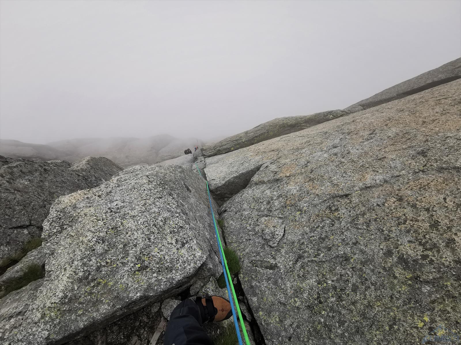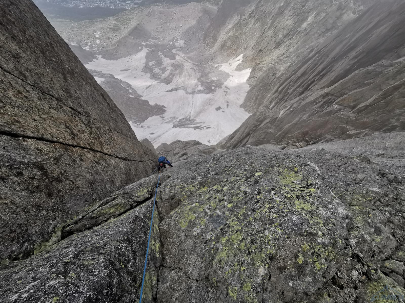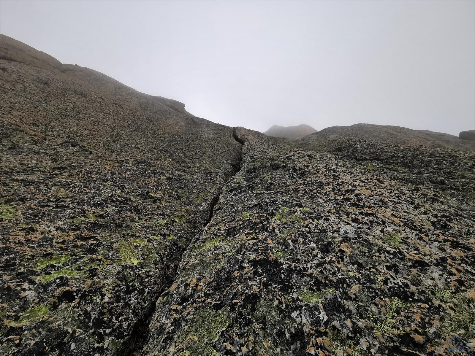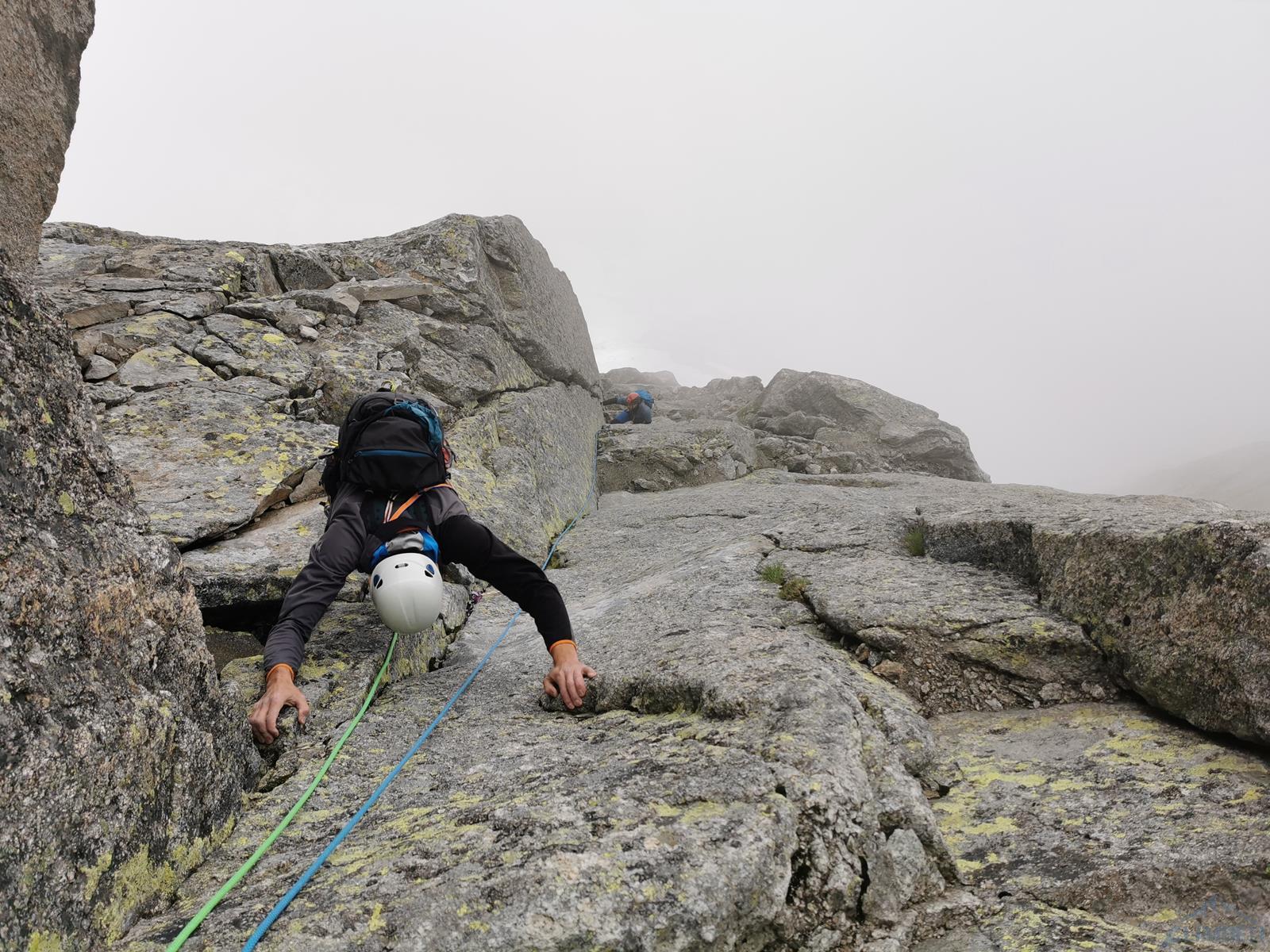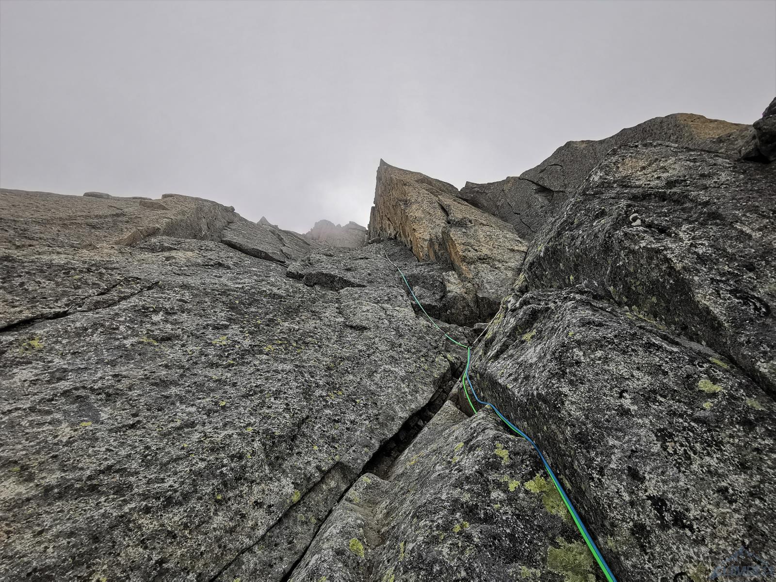 Naradzamy się kilka minut co robić – zgodnie z prognozami pogoda pogarsza się, jednak ponieważ jesteśmy powyżej punktu izotermy z nieba nie leci deszcz, lecz delikatny śnieg, który nie moczy ściany – poza odrętwiałymi palcami jest więc ok 😊. W końcu podejmujemy decyzję by wspinać się tak wysoko jak damy radę – wycofamy się od razu gdy zacznie mocniej padać lub po prostu nie będziemy w stanie trzymać się skały. Na wyciągu 18-tym idę niestety za bardzo w prawo, co powoduje, że na kolejnym wyciągu czeka nas niespodziewana trudność – przewieszony fragment doprowadzający do właściwej drogi, na którym dość mocno się wypompowuję. Szymon przejmuje prowadzenie – czas nas wyciąg nr. 22 (6b), wg mnie najładniejszy na całej drodze – na 40 metrach mamy do przejścia ryskę z dilfrem, połogą płytę i ciasne zacięcie – bellissima! Po takim odcinku kolejny, z rysą za V+, to już formalność, wyżej czeka nas jednak stresujący wyciąg nr. 22 z przerysą (6b). Zbieram się kilka minut, rozgrzewam palce i głośno narzekam, że wbrew opisom nie zdublowaliśmy cama nr 4 – psycha przy pakowaniu dopisywała, teraz jest gorzej 😉. Ostrożnie wspinam się metr po metrze, a gdy już nie da się wyżej przesuwać mojego największego przyjaciela, przychodzi pora na kilka odważnych ruchów i jestem przy stanie. Ściągam kolegów i ruszamy dalej – kolejne 50 metrów prowadzi łatwymi (V-) zacięciami i rysami, nie zatrzymuję na stanowisku i ostatni odcinek wyprowadzający na grań dociągamy na lotnej – nie było to zbyt rozsądny pomysł bo na wyciąganiu liny tracę mnóstwo siły.