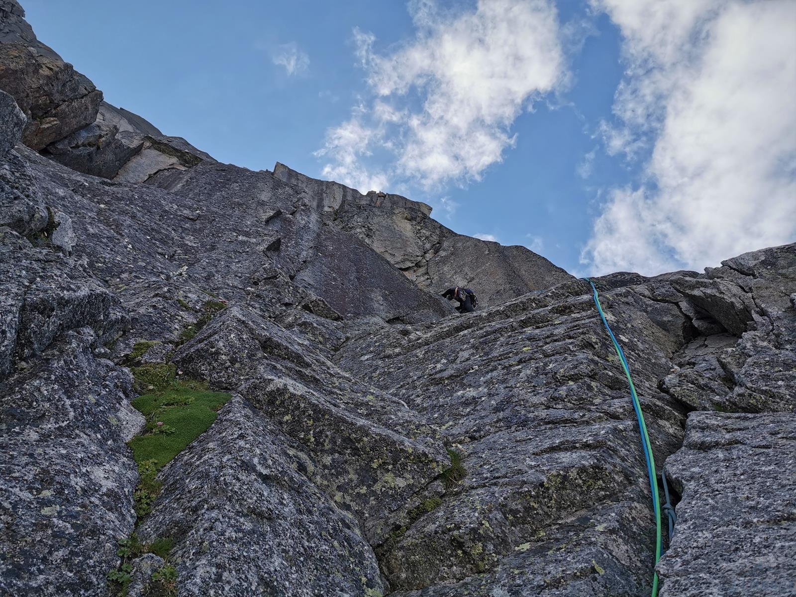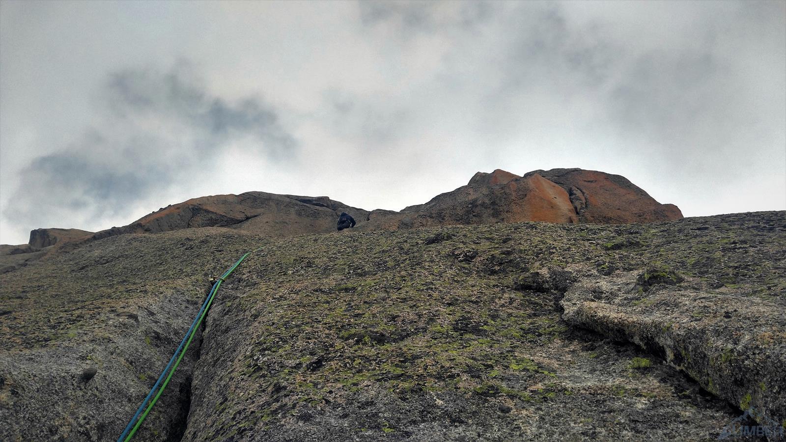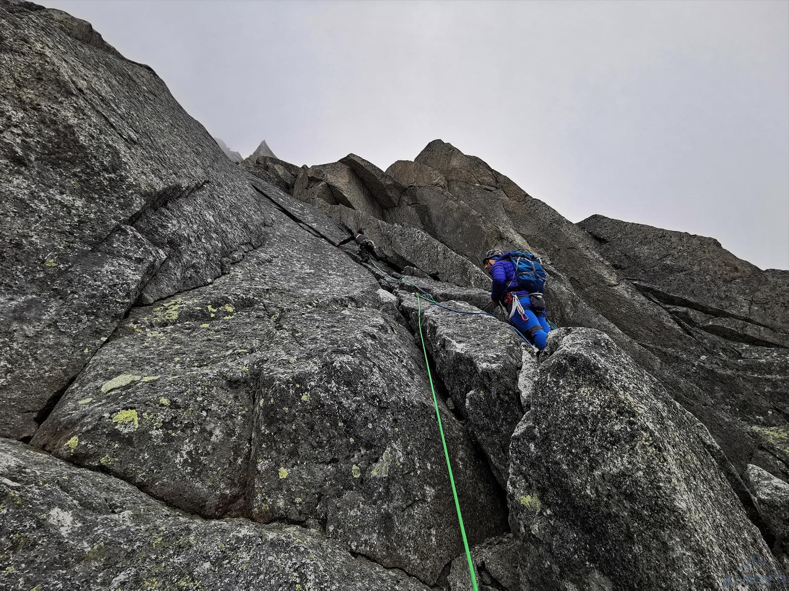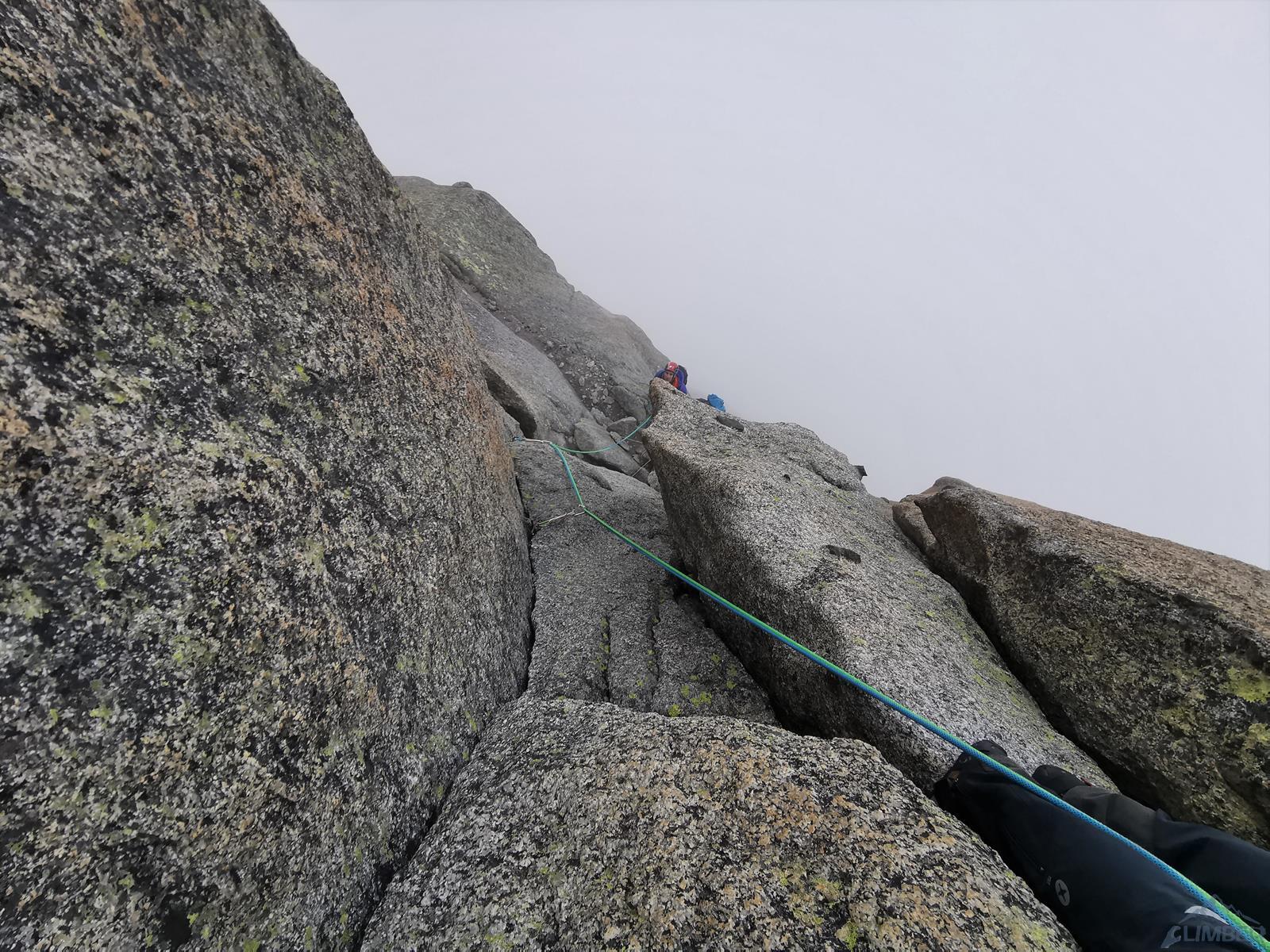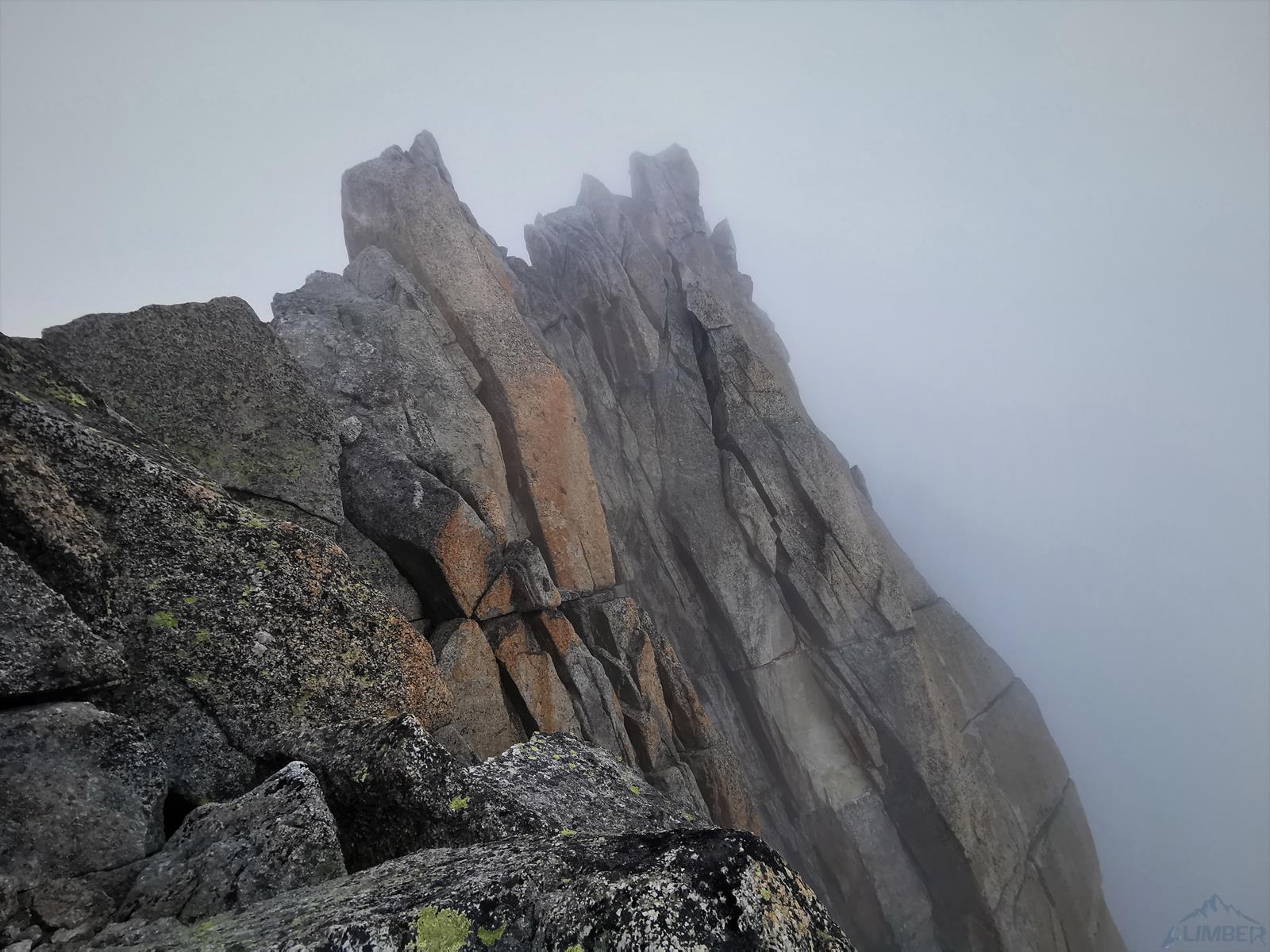 Naradzamy się kilka minut co robić – zgodnie z prognozami pogoda pogarsza się, jednak ponieważ jesteśmy powyżej punktu izotermy z nieba nie leci deszcz, lecz delikatny śnieg, który nie moczy ściany – poza odrętwiałymi palcami jest więc ok 😊. W końcu podejmujemy decyzję by wspinać się tak wysoko jak damy radę – wycofamy się od razu gdy zacznie mocniej padać lub po prostu nie będziemy w stanie trzymać się skały. Na wyciągu 18-tym idę niestety za bardzo w prawo, co powoduje, że na kolejnym wyciągu czeka nas niespodziewana trudność – przewieszony fragment doprowadzający do właściwej drogi, na którym dość mocno się wypompowuję. Szymon przejmuje prowadzenie – czas nas wyciąg nr. 22 (6b), wg mnie najładniejszy na całej drodze – na 40 metrach mamy do przejścia ryskę z dilfrem, połogą płytę i ciasne zacięcie – bellissima! Po takim odcinku kolejny, z rysą za V+, to już formalność, wyżej czeka nas jednak stresujący wyciąg nr. 22 z przerysą (6b). Zbieram się kilka minut, rozgrzewam palce i głośno narzekam, że wbrew opisom nie zdublowaliśmy cama nr 4 – psycha przy pakowaniu dopisywała, teraz jest gorzej 😉. Ostrożnie wspinam się metr po metrze, a gdy już nie da się wyżej przesuwać mojego największego przyjaciela, przychodzi pora na kilka odważnych ruchów i jestem przy stanie. Ściągam kolegów i ruszamy dalej – kolejne 50 metrów prowadzi łatwymi (V-) zacięciami i rysami, nie zatrzymuję na stanowisku i ostatni odcinek wyprowadzający na grań dociągamy na lotnej – nie było to zbyt rozsądny pomysł bo na wyciąganiu liny tracę mnóstwo siły.