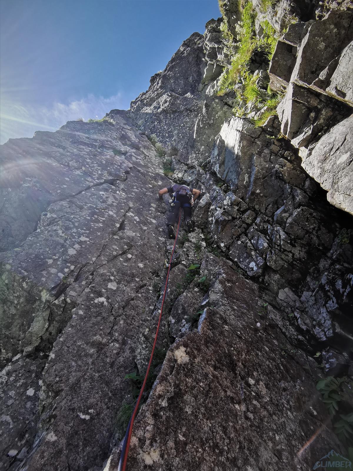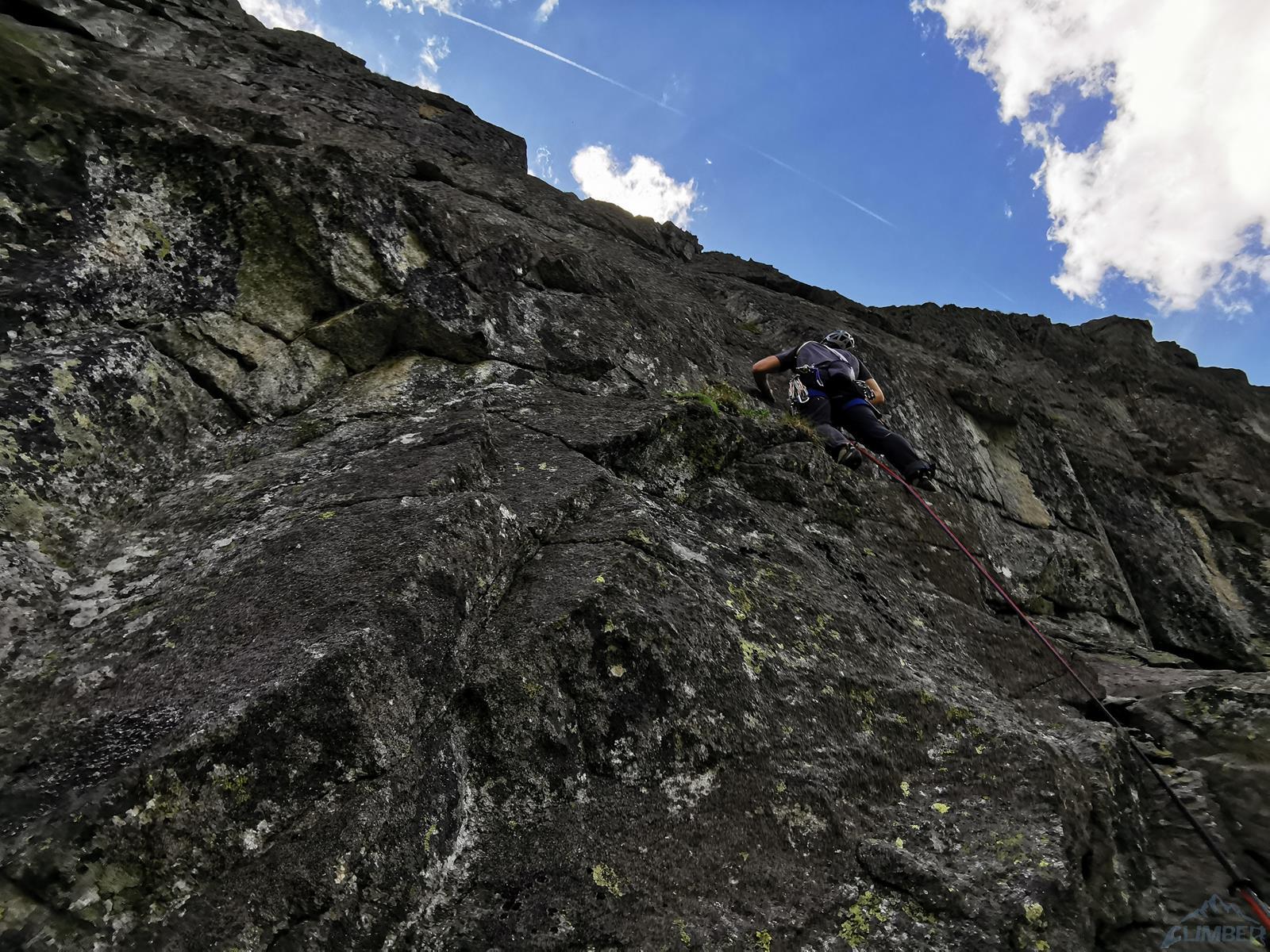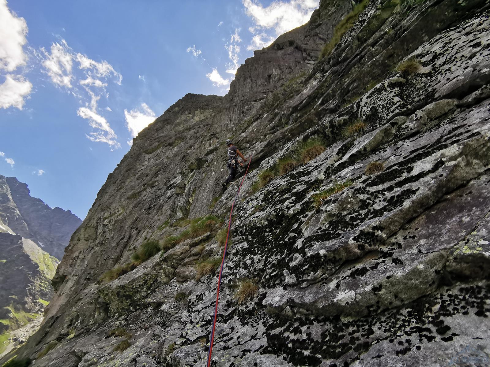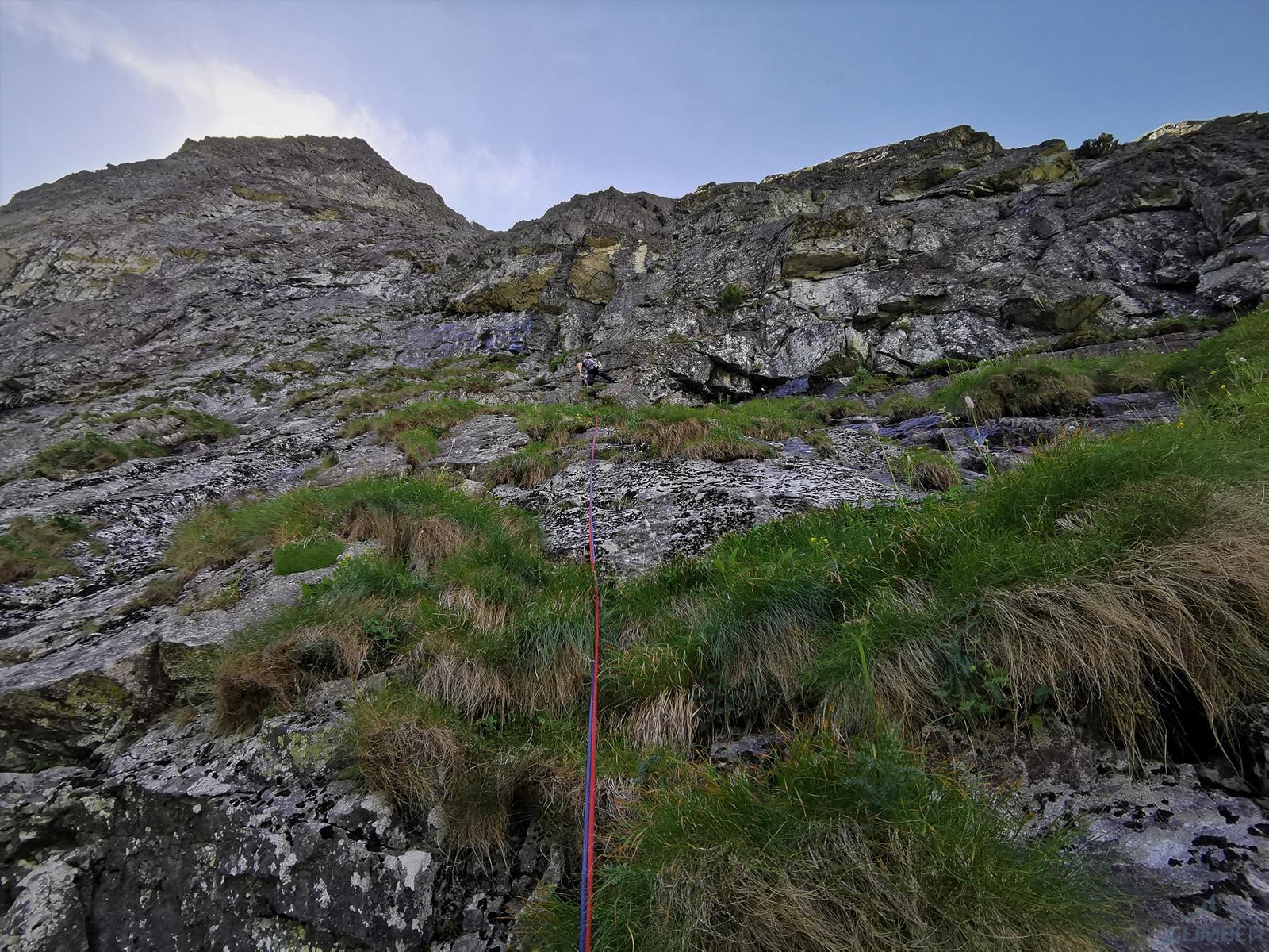 Wspinanie rozpoczynamy późno bo dopiero ok. 10, na dodatek zaczynamy od falstartu – sugerując się zdjęciem z Mastertopo idziemy zacięciem, z którego trawersuje się w lewo na płyty, podczas gdy powinniśmy wystartować tym tuż pod nimi (patrz zdjęcie) i wtedy trafimy na gotowy stan (spity). Nie jest trudno (ok. V) ale by dołączyć do drogi na drugim wyciągu trzeba wykonać nieprzyjemny trawers. Dalej wspinamy się płytami (ok. V, spit) do góry i już łatwiejszym terenem wychodzimy w trawy – kolejne stanowisko jest pod pierwszą ścianką. Na trzecim wyciągu czeka nas sporo traw i łopianów – idziemy jak puszcza, charakterystyczny okapik z pętlą mijając po prawej stronie, trochę wyżej docieramy do stanowiska z haków.