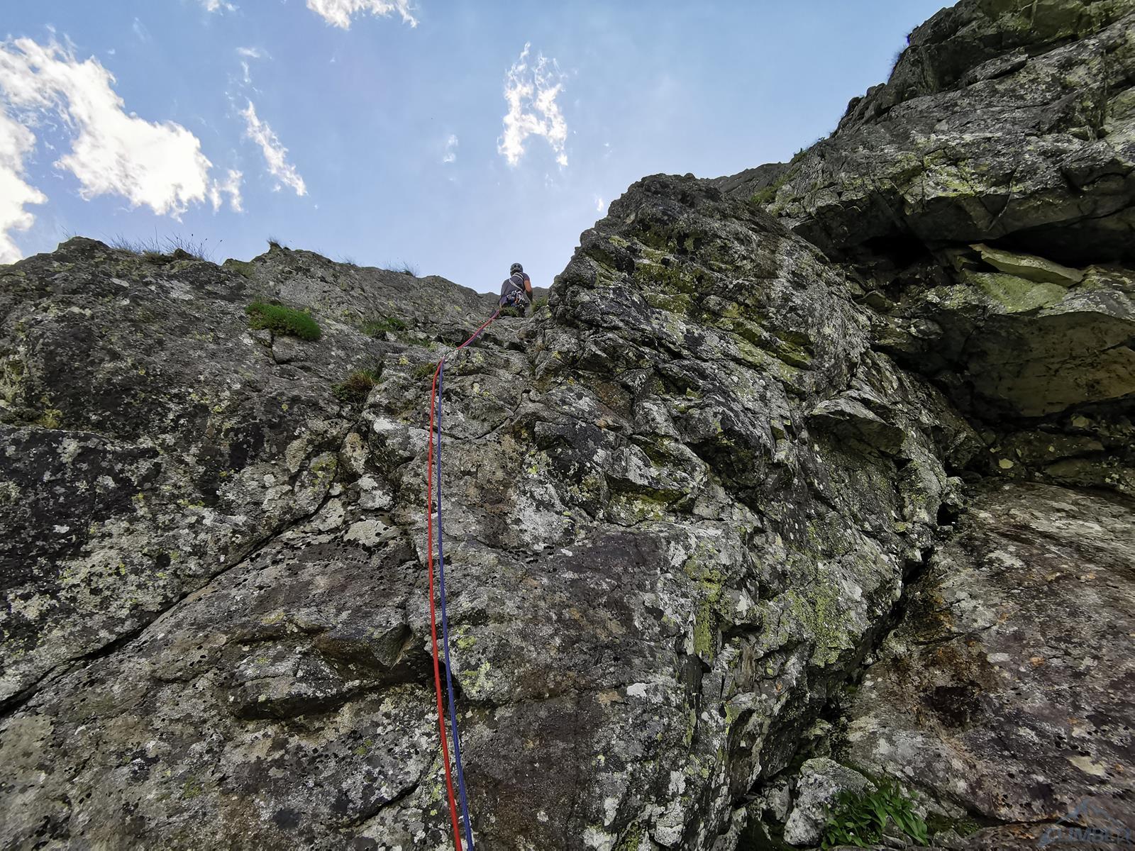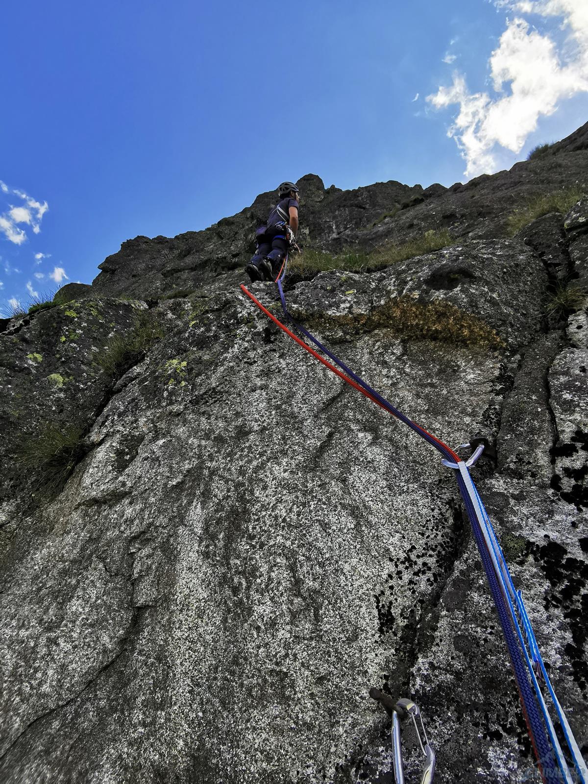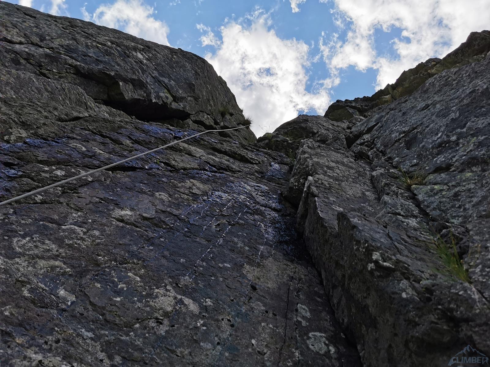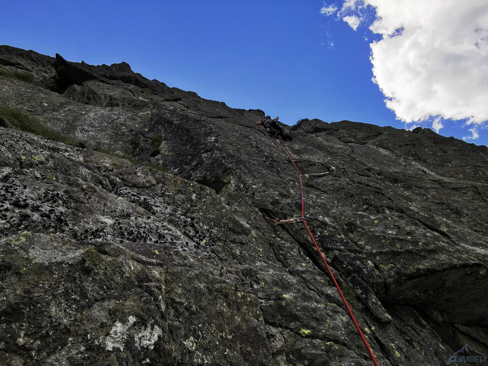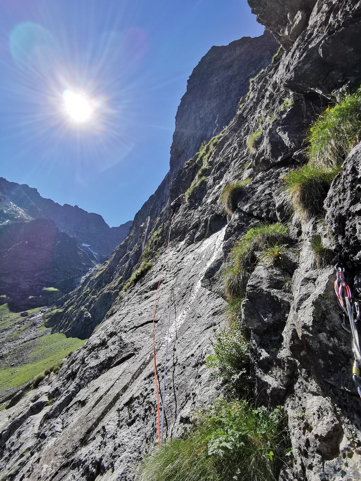 Wspinanie rozpoczynamy późno bo dopiero ok. 10, na dodatek zaczynamy od falstartu – sugerując się zdjęciem z Mastertopo idziemy zacięciem, z którego trawersuje się w lewo na płyty, podczas gdy powinniśmy wystartować tym tuż pod nimi (patrz zdjęcie) i wtedy trafimy na gotowy stan (spity). Nie jest trudno (ok. V) ale by dołączyć do drogi na drugim wyciągu trzeba wykonać nieprzyjemny trawers. Dalej wspinamy się płytami (ok. V, spit) do góry i już łatwiejszym terenem wychodzimy w trawy – kolejne stanowisko jest pod pierwszą ścianką. Na trzecim wyciągu czeka nas sporo traw i łopianów – idziemy jak puszcza, charakterystyczny okapik z pętlą mijając po prawej stronie, trochę wyżej docieramy do stanowiska z haków.