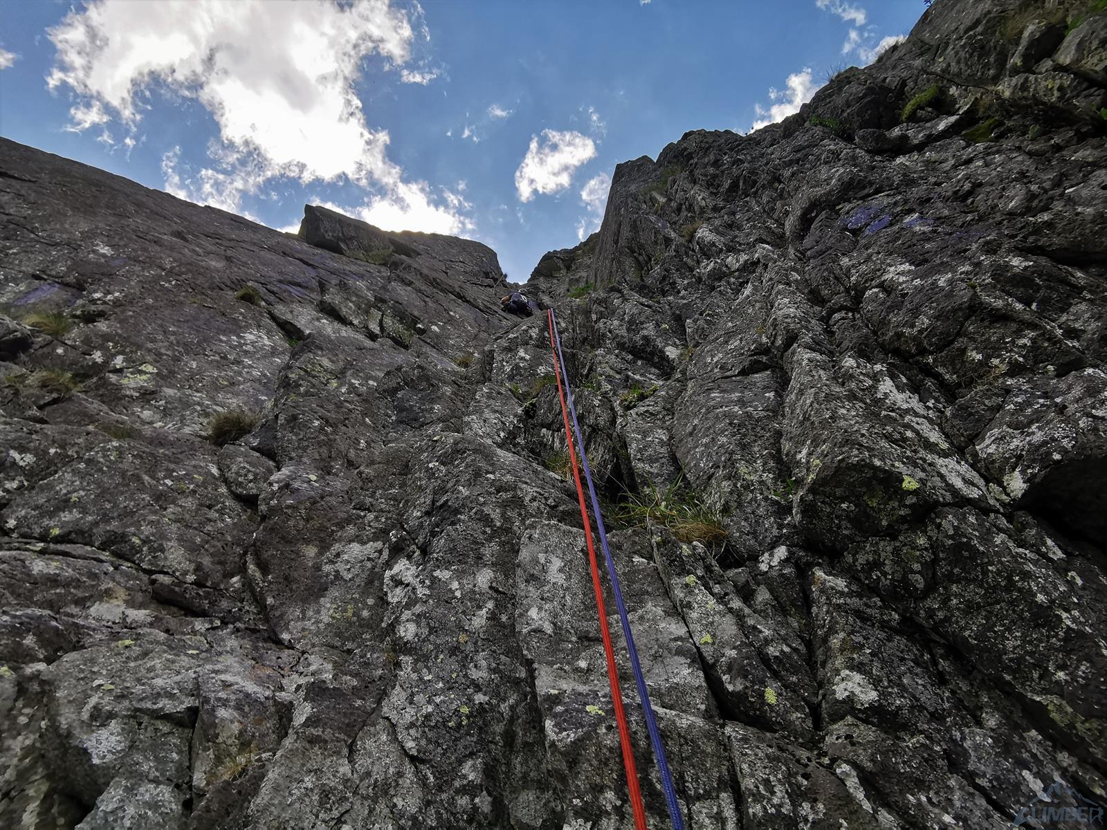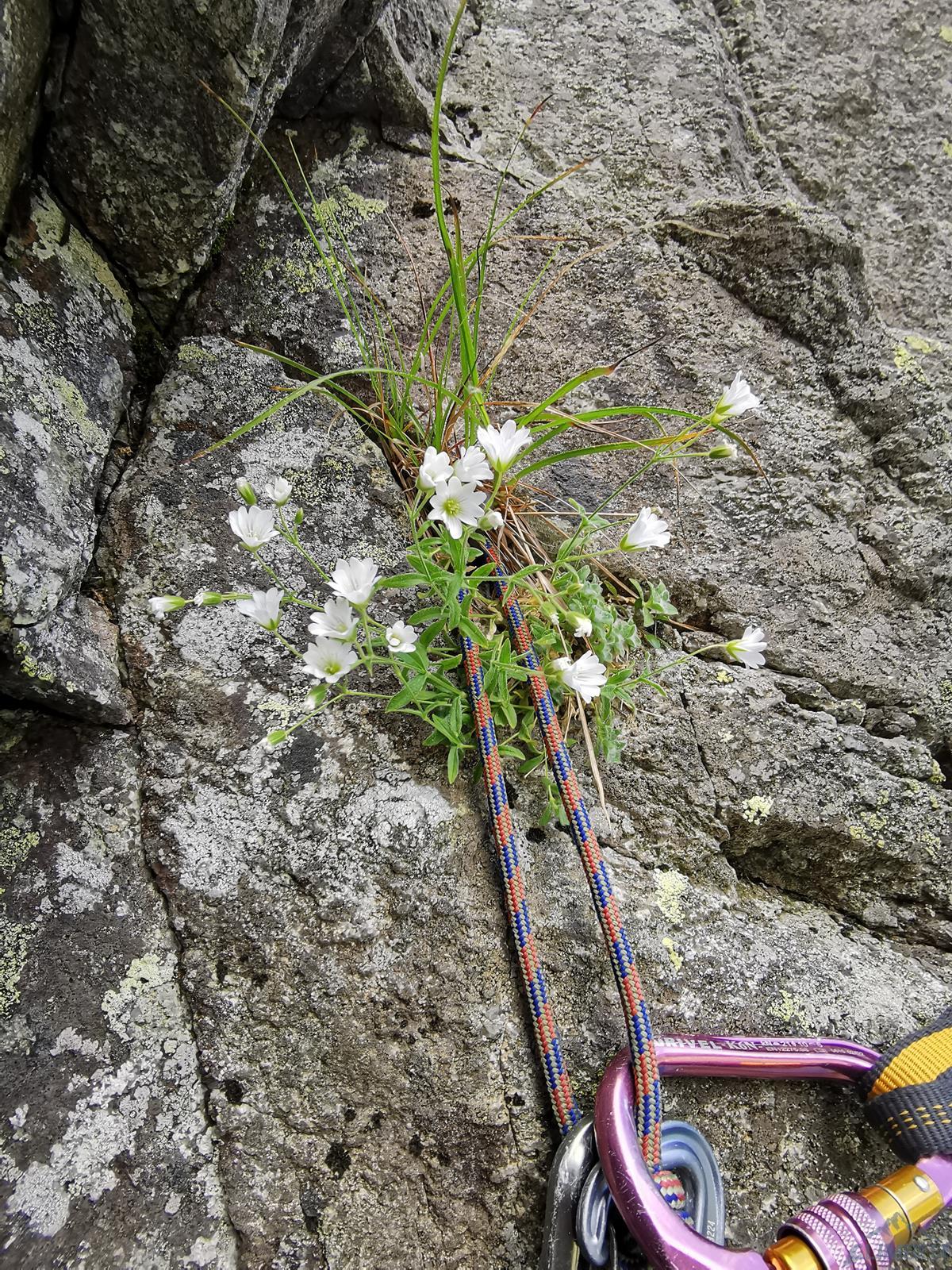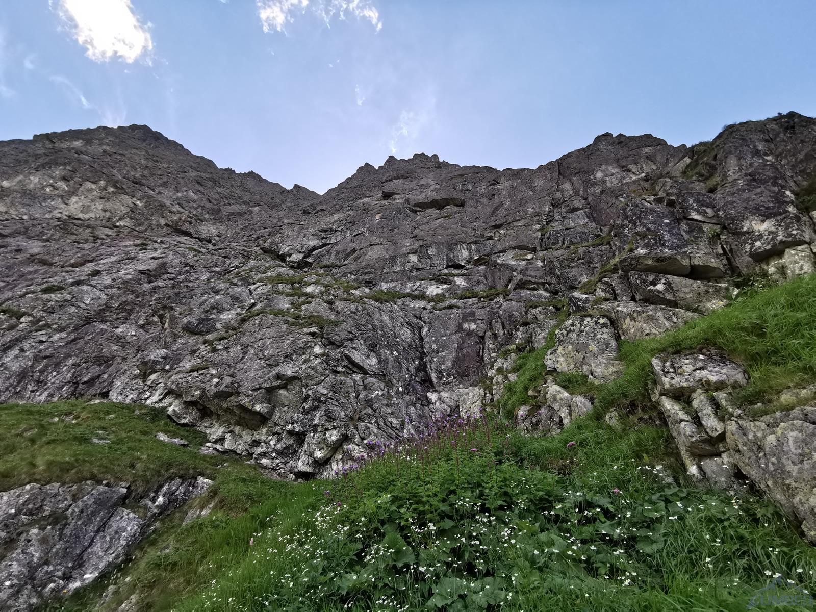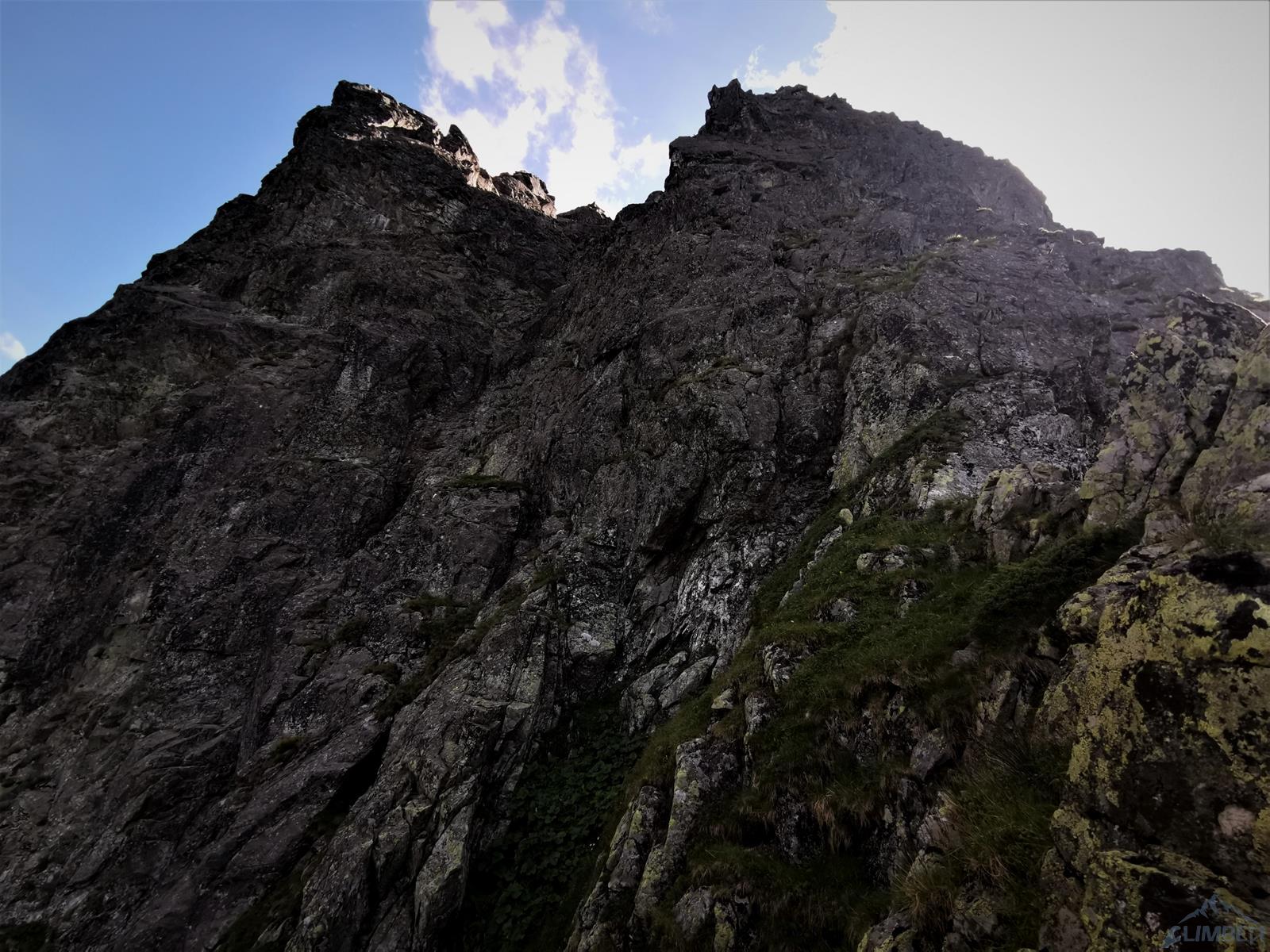 Wspinanie rozpoczynamy późno bo dopiero ok. 10, na dodatek zaczynamy od falstartu – sugerując się zdjęciem z Mastertopo idziemy zacięciem, z którego trawersuje się w lewo na płyty, podczas gdy powinniśmy wystartować tym tuż pod nimi (patrz zdjęcie) i wtedy trafimy na gotowy stan (spity). Nie jest trudno (ok. V) ale by dołączyć do drogi na drugim wyciągu trzeba wykonać nieprzyjemny trawers. Dalej wspinamy się płytami (ok. V, spit) do góry i już łatwiejszym terenem wychodzimy w trawy – kolejne stanowisko jest pod pierwszą ścianką. Na trzecim wyciągu czeka nas sporo traw i łopianów – idziemy jak puszcza, charakterystyczny okapik z pętlą mijając po prawej stronie, trochę wyżej docieramy do stanowiska z haków.