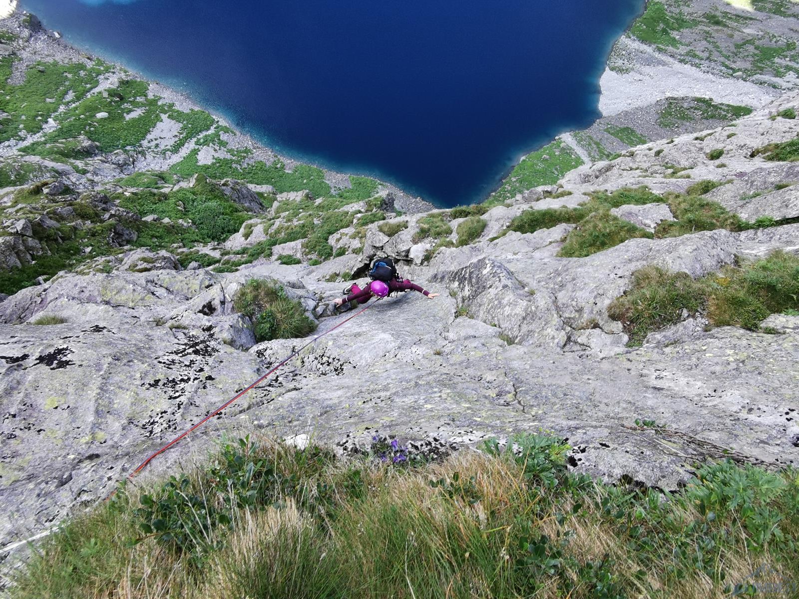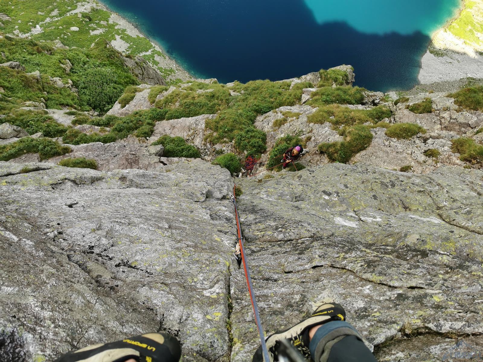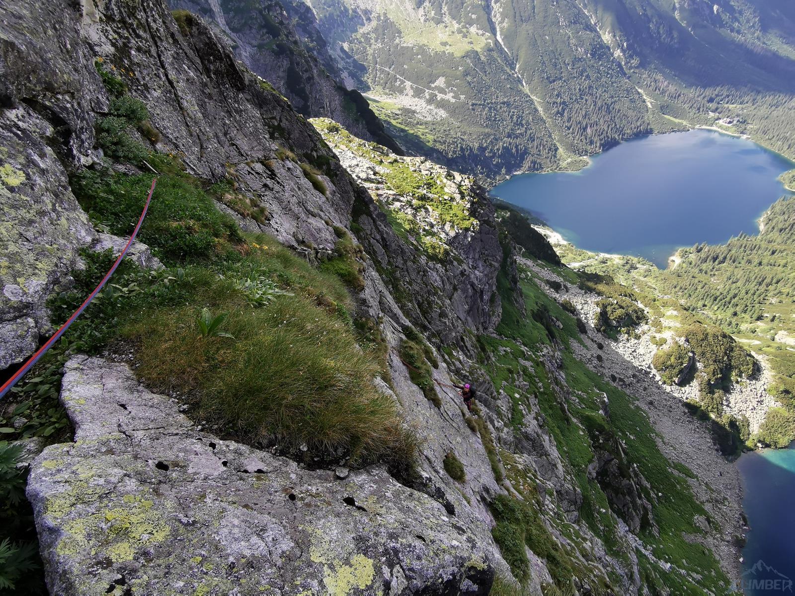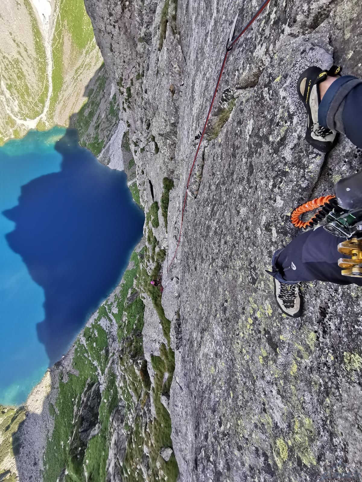 Kluczowy, 11-ty wyciąg, to bardzo ładne wspinanie w wielkiej płycie z rysami, linia jest ewidentna bo idziemy wzdłuż haków, zapewniających bezpieczeństwo gdybyśmy wylecieli na jednym z czujnych, bulderowych ruchów. Pod koniec kierujemy się skośnie w prawo i wchodzimy na dużą półkę. Kolejny wyciąg (IV+) zaczynamy płytą do góry, po czym ostro trawersujemy w lewo do stanowiska na trawiastym zachodzie. Ostatni, trzynasty wyciąg rozpoczyna się ładną ścianką (V+, hak z koluchem), po czym – wg Mastertopo – ucieka w prawo za Turniczkę nad Schodami. Ja po ściance poszedłem wprost do piątkowego Kominka z Pajęczyną (wariant z Ła-Py, patrz topo), ale nie polecam bo jest strasznie kruchy i porośnięty, jedynym plusem jest to, że wychodzimy idealnie pod szczytem Turniczki (hak). Po skończeniu drogi mamy dwie opcje – po przejściu krótkiej ścianki z hakiem (III+, stan z mailonem po przejściu) możemy wytrawersować w prawo do szlaku (pół godziny terenu I-II, później ścieżka) albo iść dalej na szczyt (około godziny, najpierw grzędą II-III, potem granią albo zachodami pod nią), co też czynimy.