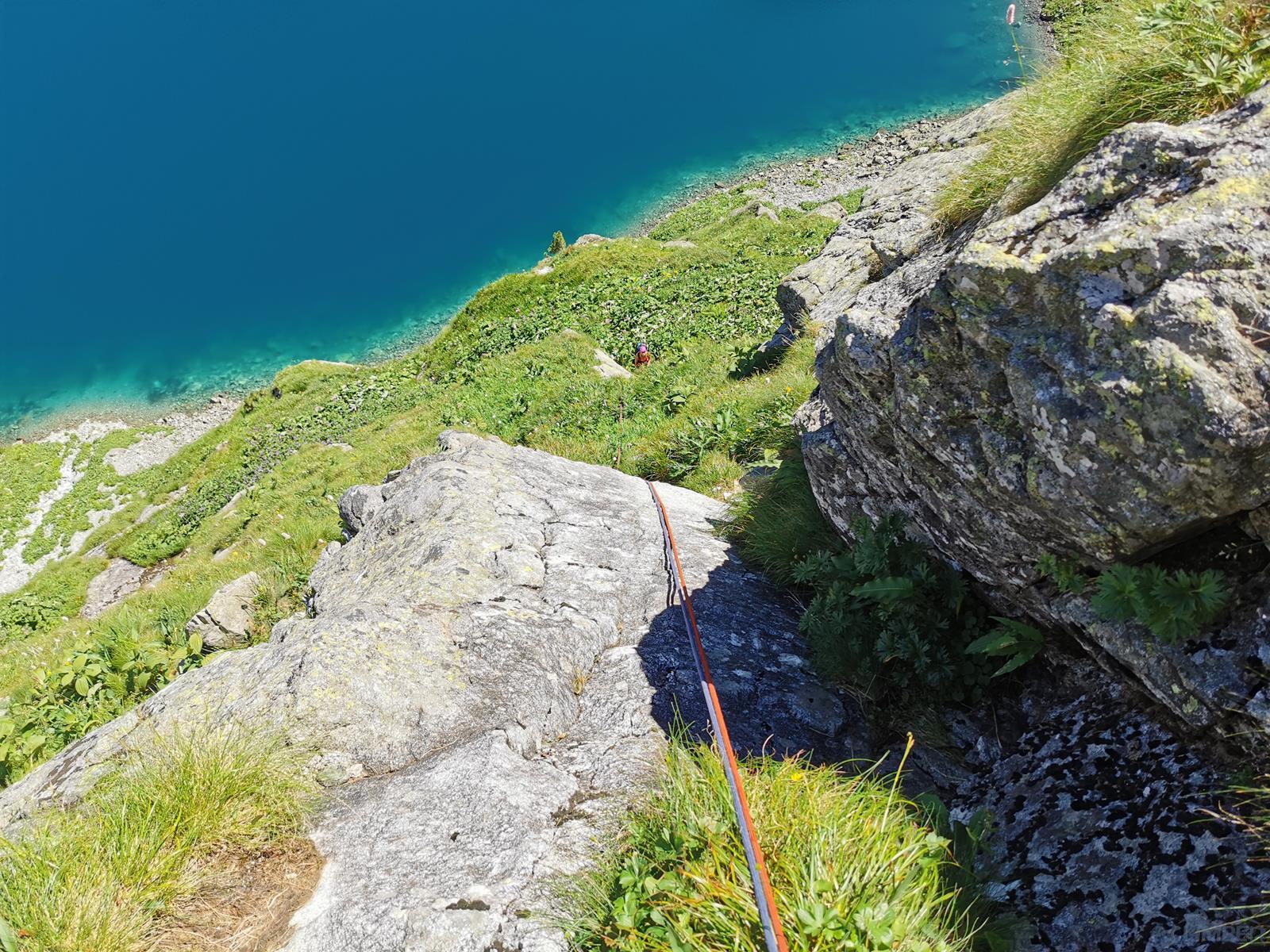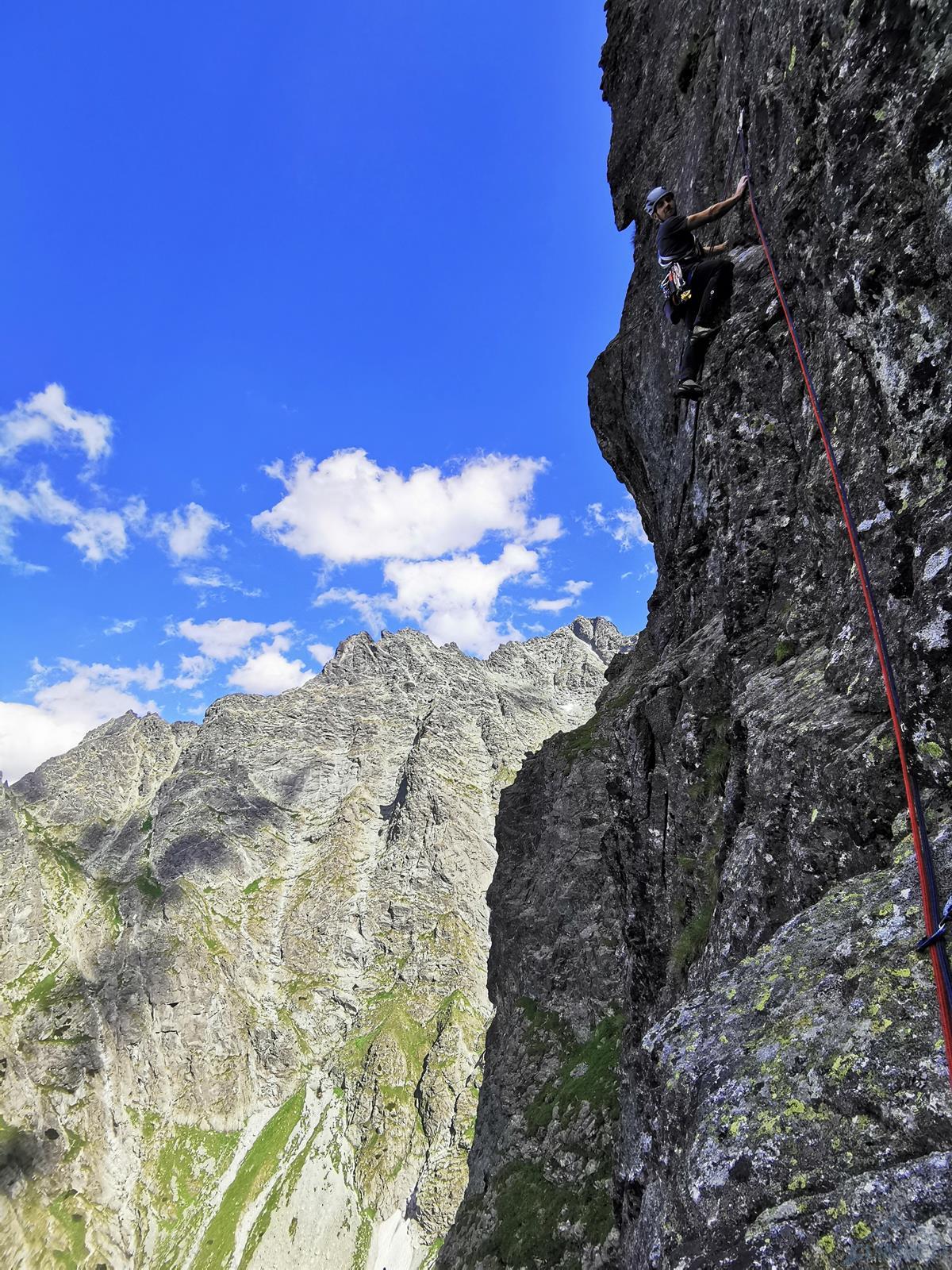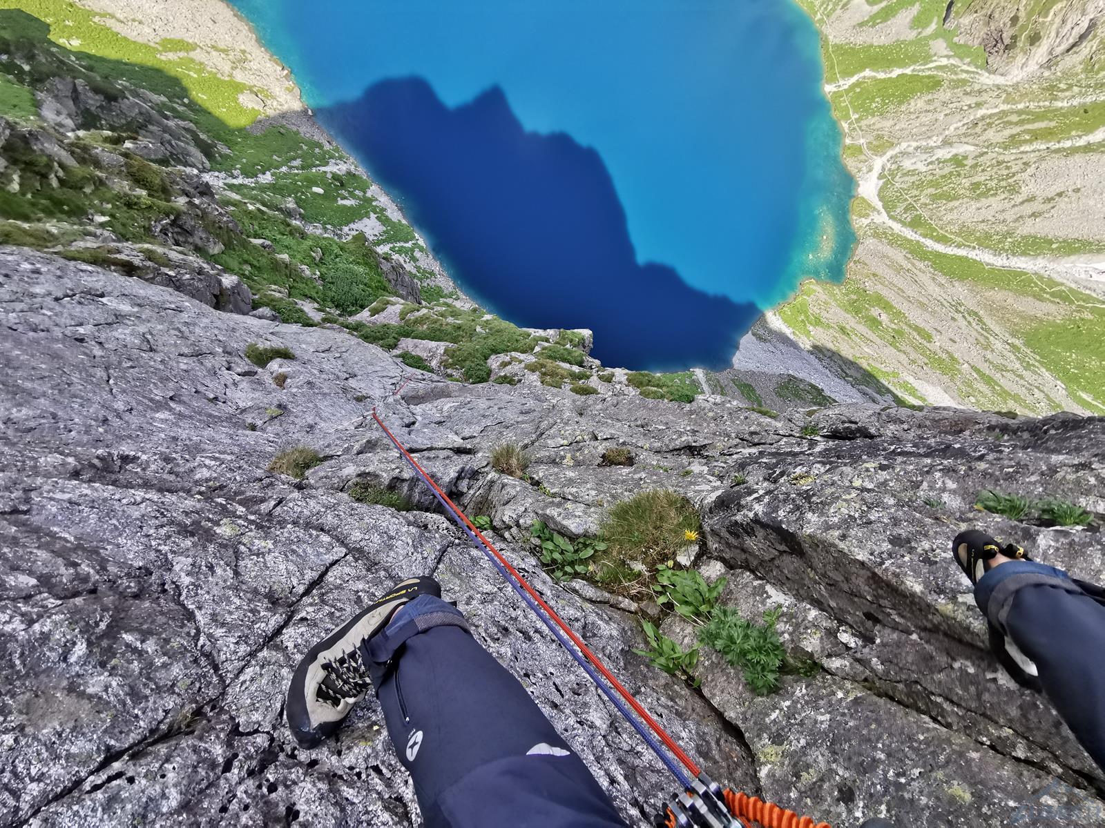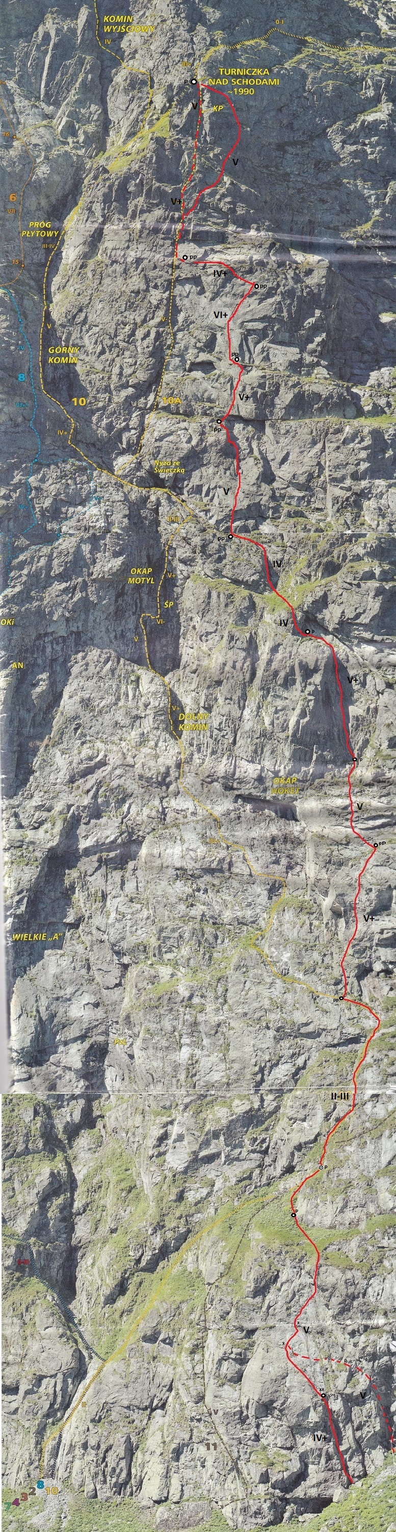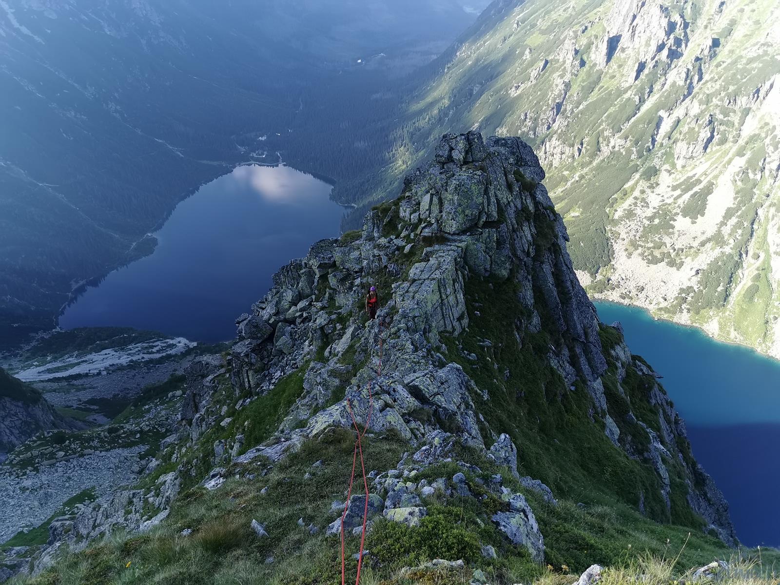Kluczowy, 11-ty wyciąg, to bardzo ładne wspinanie w wielkiej płycie z rysami, linia jest ewidentna bo idziemy wzdłuż haków, zapewniających bezpieczeństwo gdybyśmy wylecieli na jednym z czujnych, bulderowych ruchów. Pod koniec kierujemy się skośnie w prawo i wchodzimy na dużą półkę. Kolejny wyciąg (IV+) zaczynamy płytą do góry, po czym ostro trawersujemy w lewo do stanowiska na trawiastym zachodzie. Ostatni, trzynasty wyciąg rozpoczyna się ładną ścianką (V+, hak z koluchem), po czym – wg Mastertopo – ucieka w prawo za Turniczkę nad Schodami. Ja po ściance poszedłem wprost do piątkowego Kominka z Pajęczyną (wariant z Ła-Py, patrz topo), ale nie polecam bo jest strasznie kruchy i porośnięty, jedynym plusem jest to, że wychodzimy idealnie pod szczytem Turniczki (hak). Po skończeniu drogi mamy dwie opcje – po przejściu krótkiej ścianki z hakiem (III+, stan z mailonem po przejściu) możemy wytrawersować w prawo do szlaku (pół godziny terenu I-II, później ścieżka) albo iść dalej na szczyt (około godziny, najpierw grzędą II-III, potem granią albo zachodami pod nią), co też czynimy.