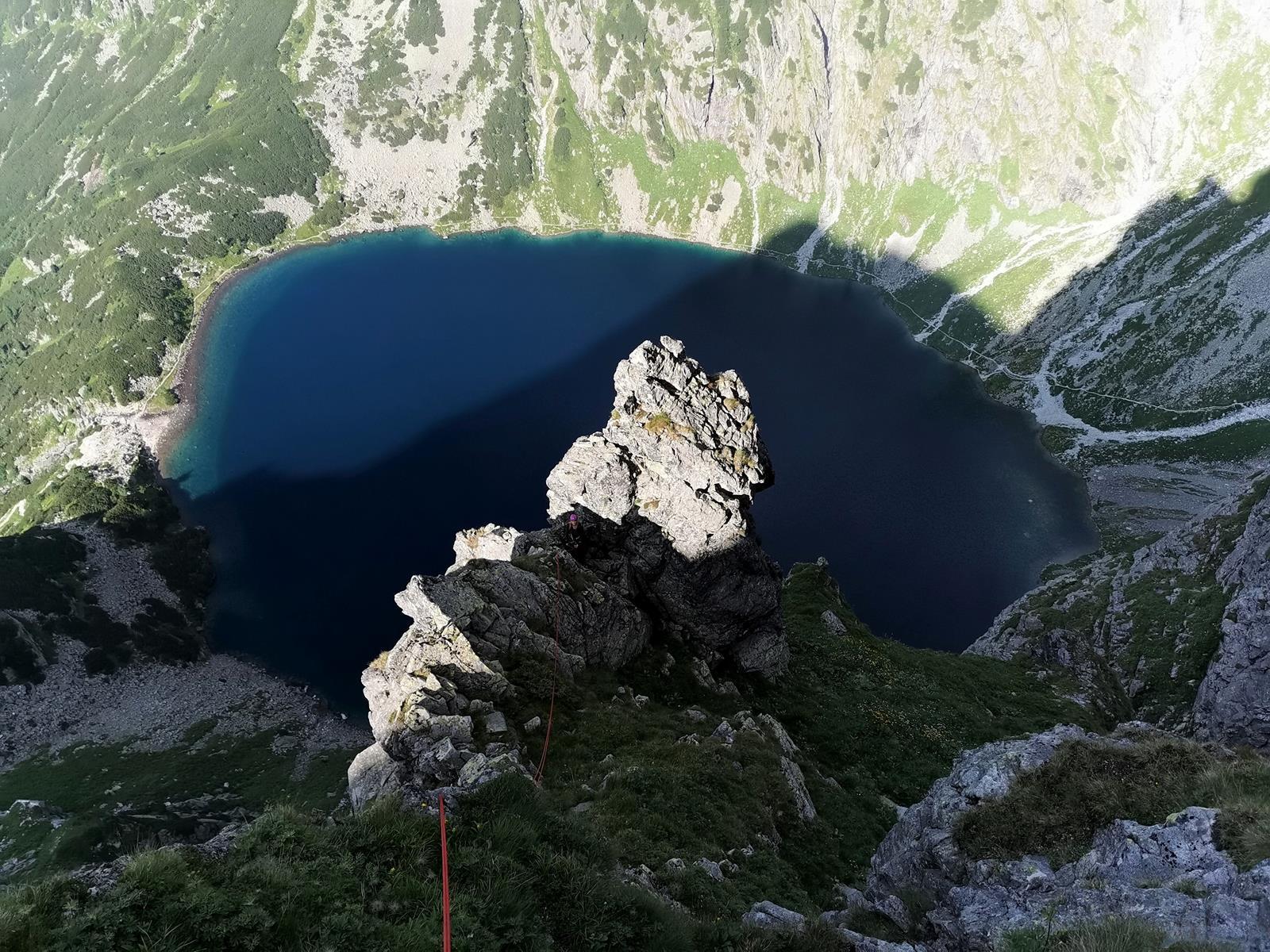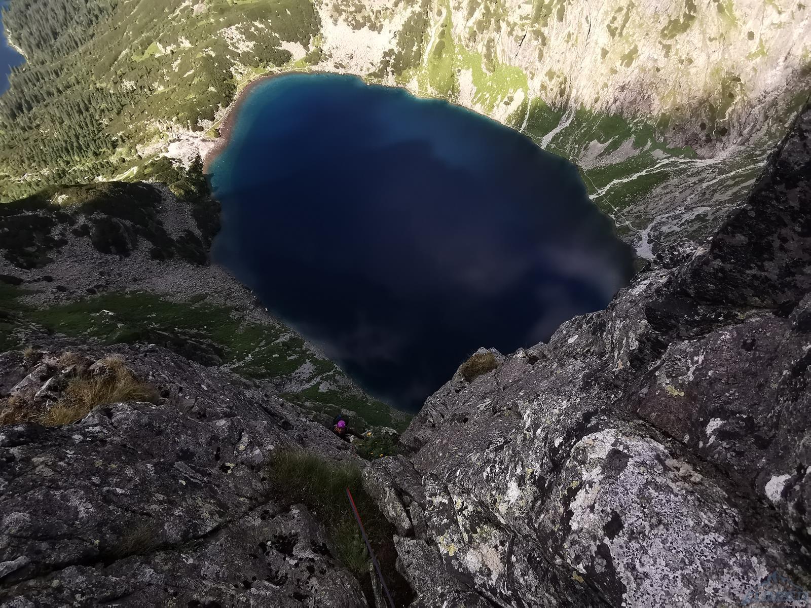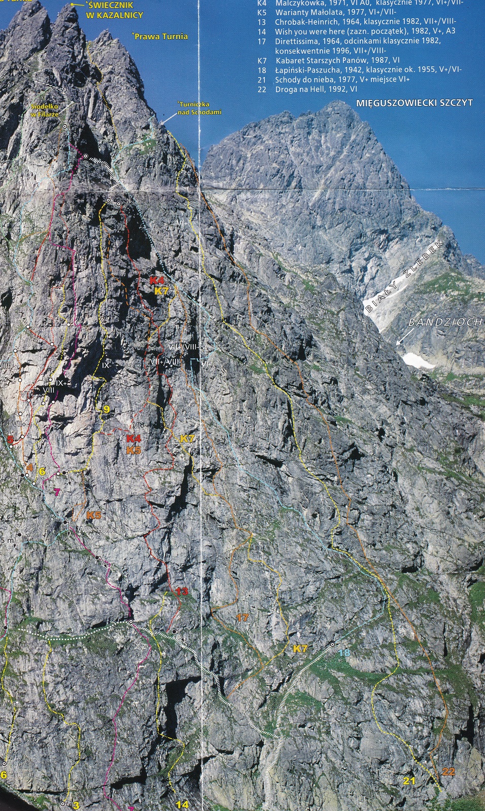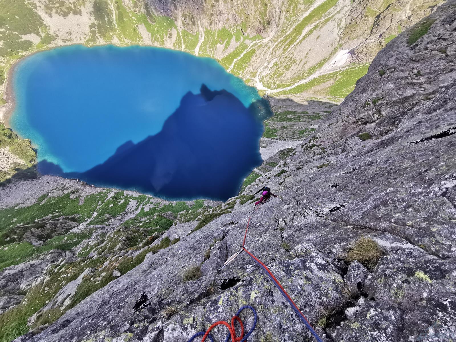 Kluczowy, 11-ty wyciąg, to bardzo ładne wspinanie w wielkiej płycie z rysami, linia jest ewidentna bo idziemy wzdłuż haków, zapewniających bezpieczeństwo gdybyśmy wylecieli na jednym z czujnych, bulderowych ruchów. Pod koniec kierujemy się skośnie w prawo i wchodzimy na dużą półkę. Kolejny wyciąg (IV+) zaczynamy płytą do góry, po czym ostro trawersujemy w lewo do stanowiska na trawiastym zachodzie. Ostatni, trzynasty wyciąg rozpoczyna się ładną ścianką (V+, hak z koluchem), po czym – wg Mastertopo – ucieka w prawo za Turniczkę nad Schodami. Ja po ściance poszedłem wprost do piątkowego Kominka z Pajęczyną (wariant z Ła-Py, patrz topo), ale nie polecam bo jest strasznie kruchy i porośnięty, jedynym plusem jest to, że wychodzimy idealnie pod szczytem Turniczki (hak). Po skończeniu drogi mamy dwie opcje – po przejściu krótkiej ścianki z hakiem (III+, stan z mailonem po przejściu) możemy wytrawersować w prawo do szlaku (pół godziny terenu I-II, później ścieżka) albo iść dalej na szczyt (około godziny, najpierw grzędą II-III, potem granią albo zachodami pod nią), co też czynimy.