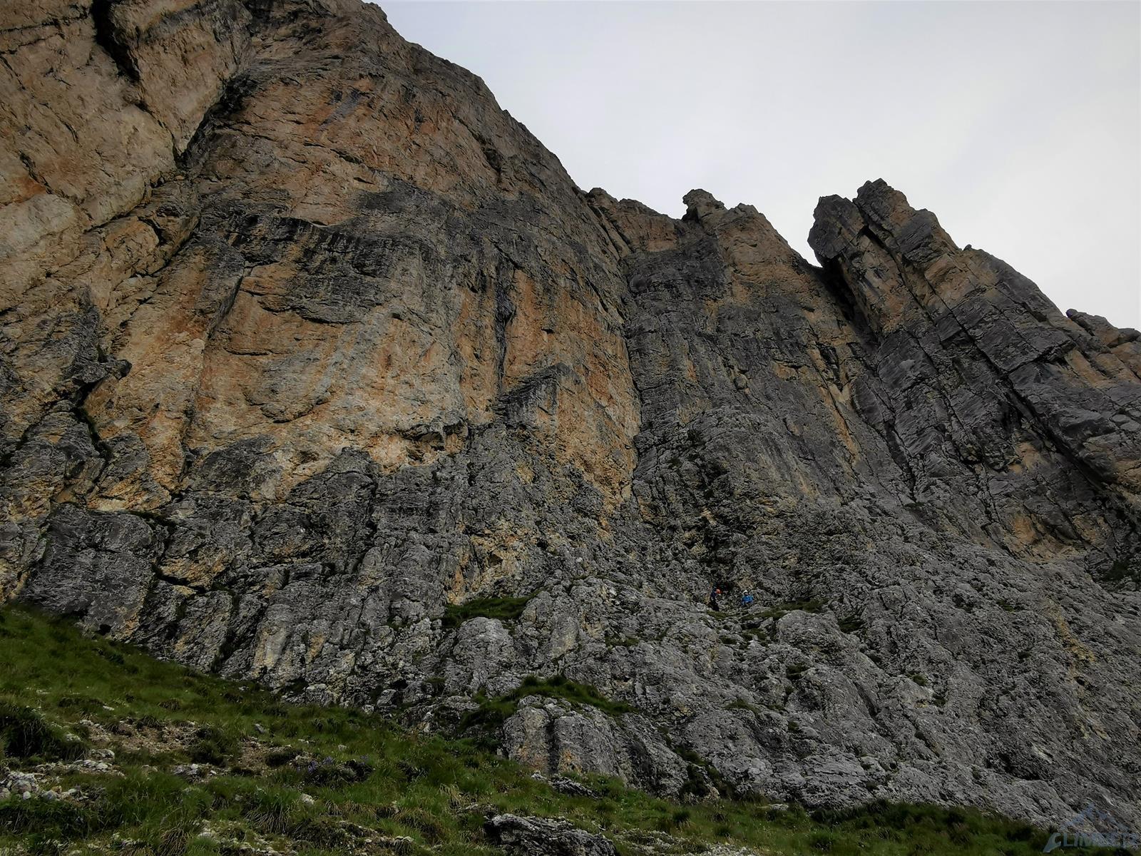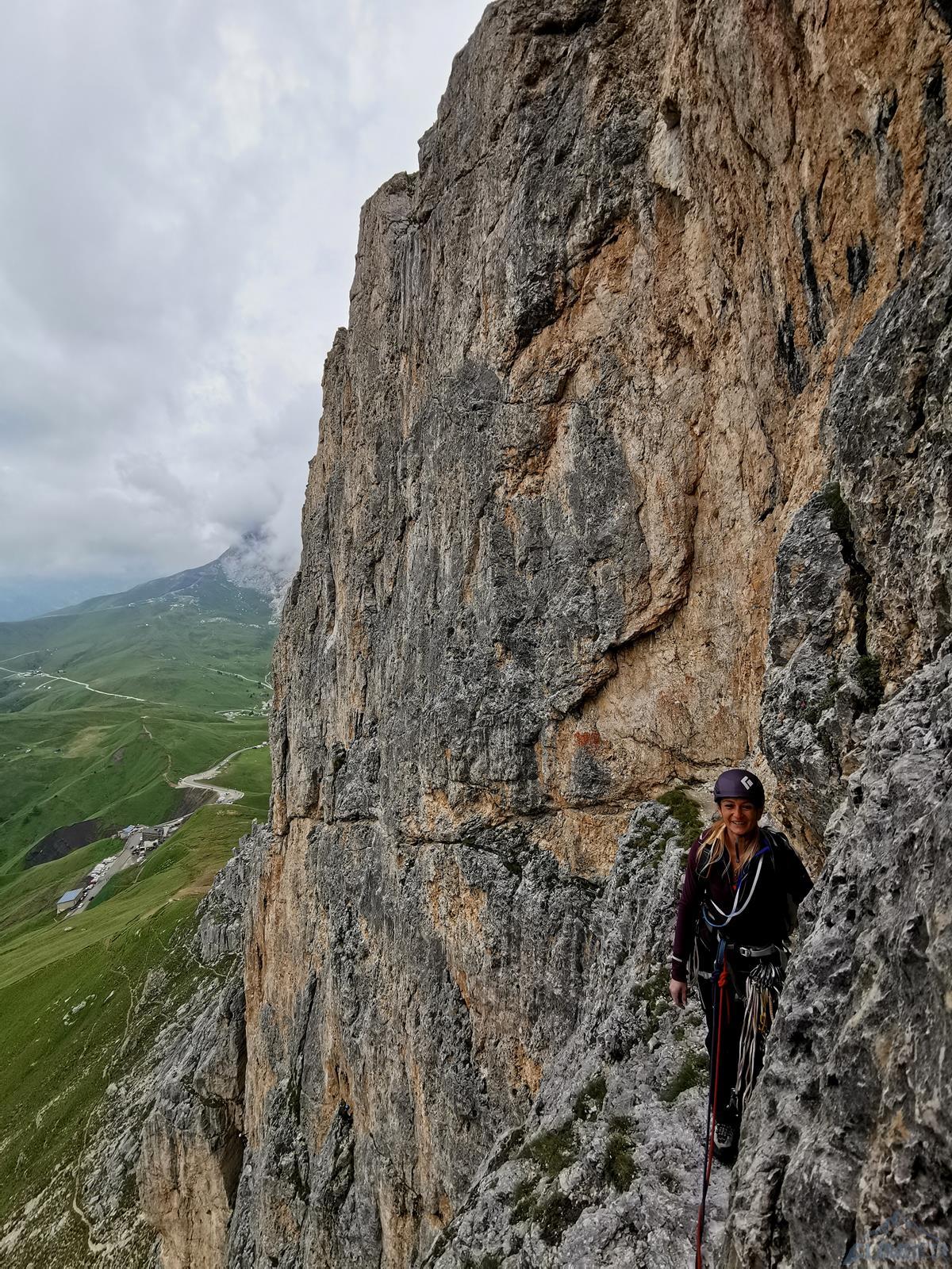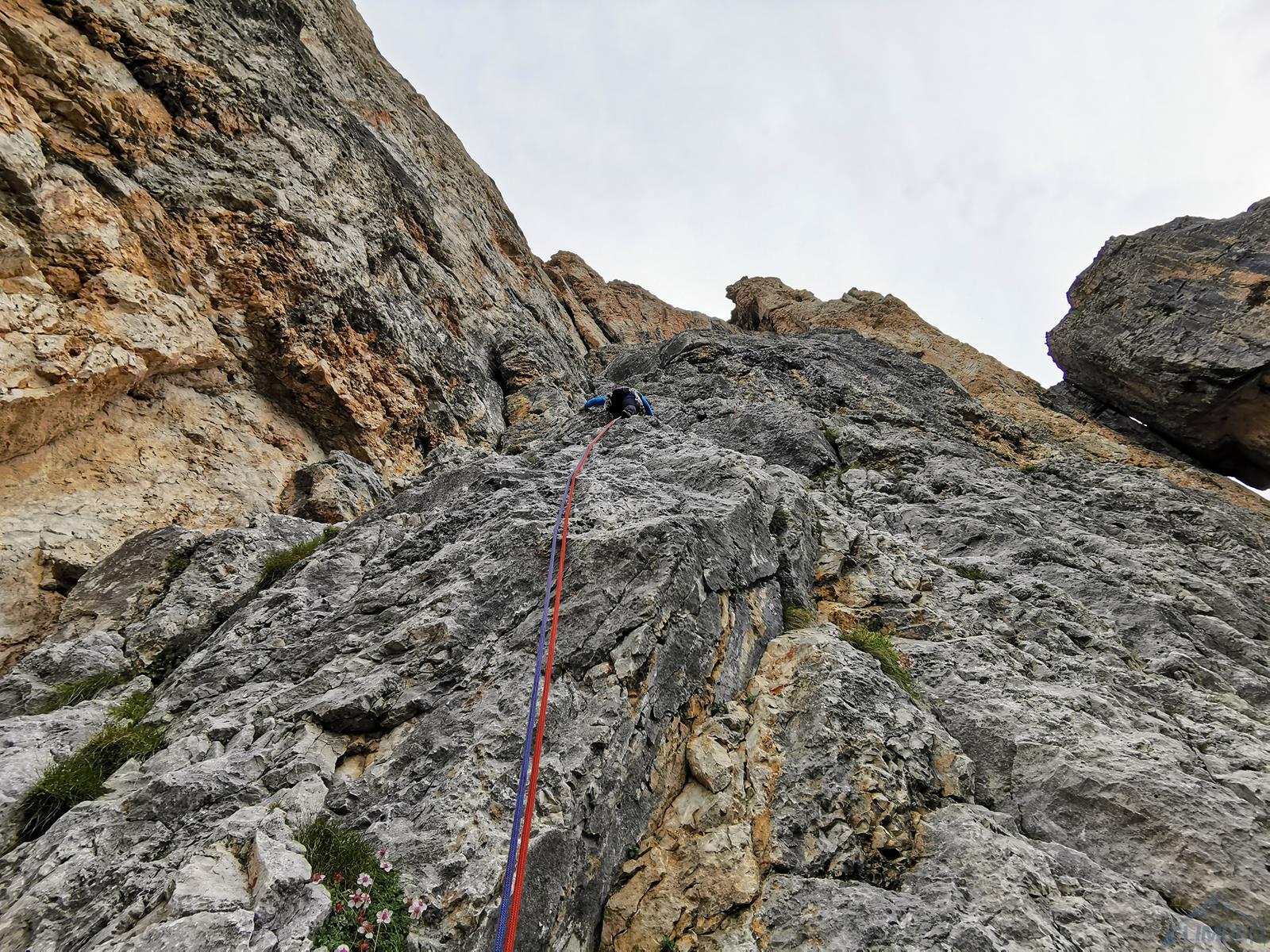 Poniedziałek to trzeci (na szczęście ostatni taki) dzień z pogodą w kratkę, dlatego też wracamy na południową ścianę Pierwszej Turni Selli - pierwszego dnia, zaraz po przyjeździe, robiliśmy tutaj drogę Delenda Carthago. Tym razem w planach mamy rozgrzewkę na tradowym klasyku (Trenker Crack) i spróbowanie Icterusa (6c+/7a w zależności od topo), o ile ściana wyschnie i nie zdąży jej ponownie zalać... Pierwsza droga jest bardzo popularna i prawie zawsze ktoś się na niej wspina – na szczęście uprzejmy zespół przepuszcza nas przodem, a my obiecujemy, że będziemy się sprężać 😊.