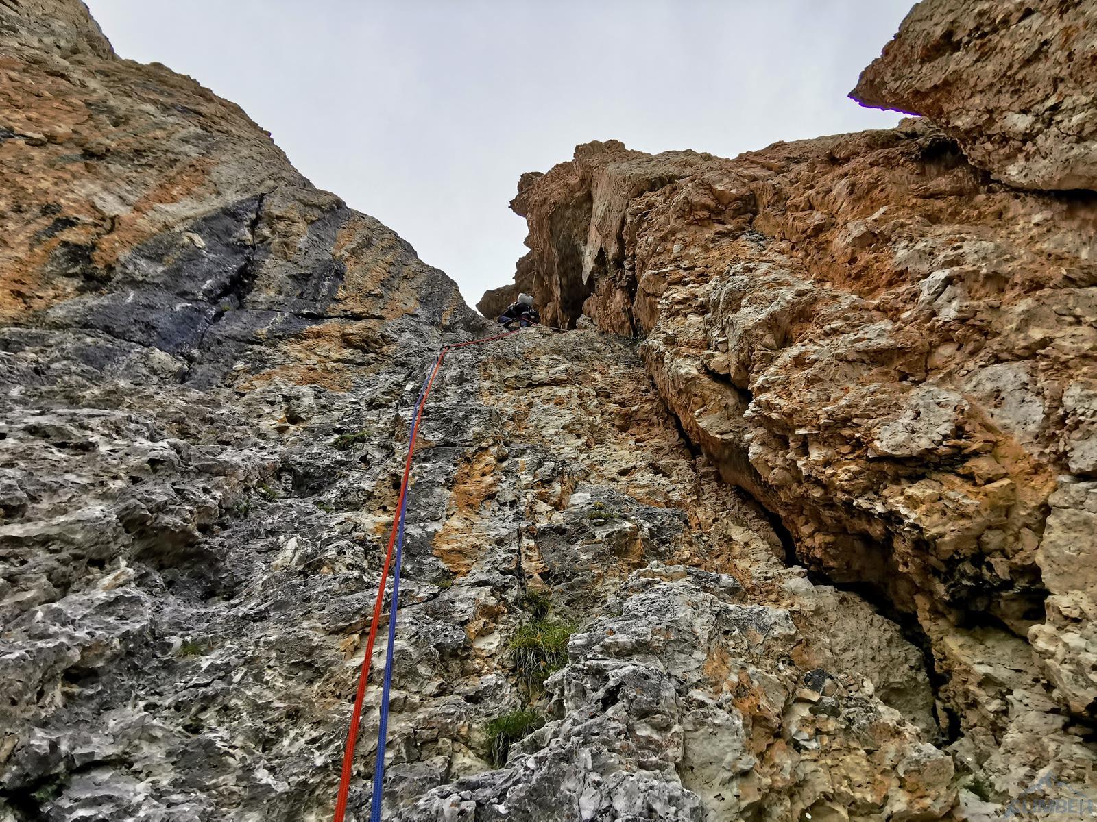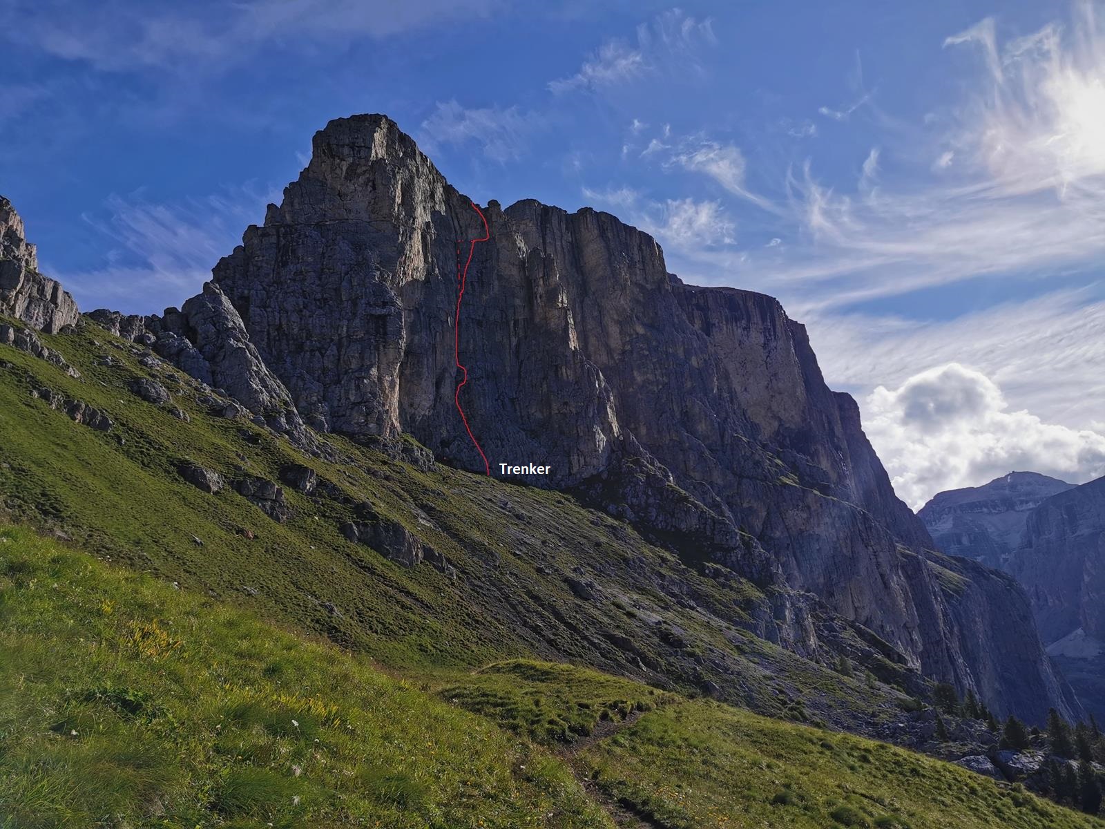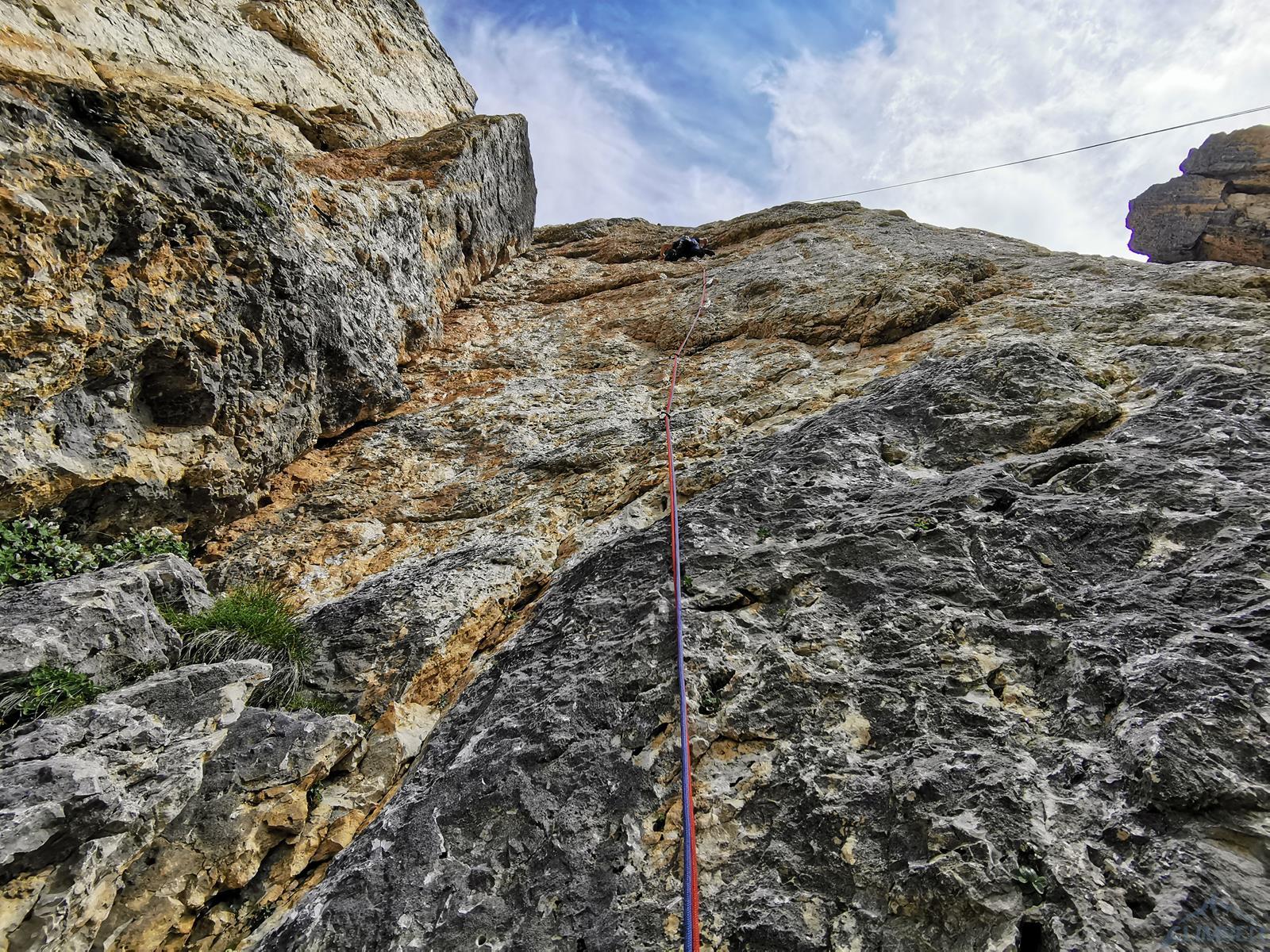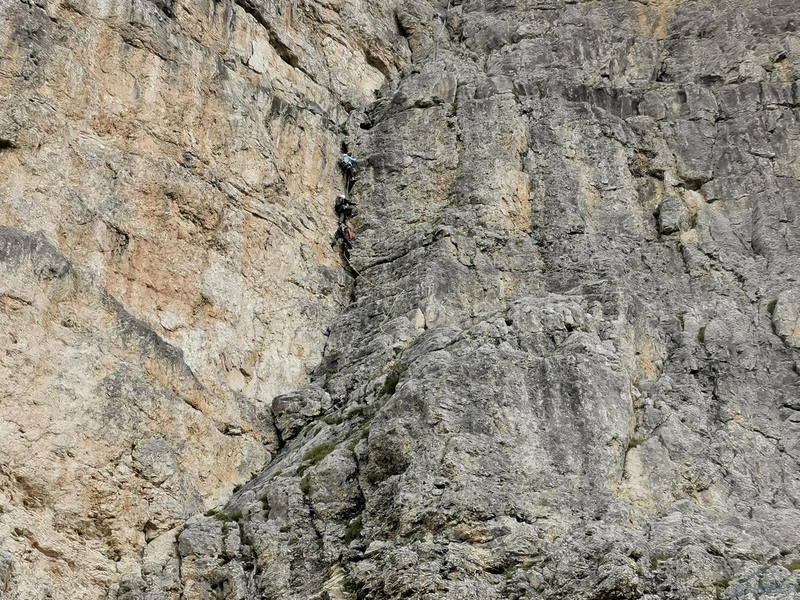 Poniedziałek to trzeci (na szczęście ostatni taki) dzień z pogodą w kratkę, dlatego też wracamy na południową ścianę Pierwszej Turni Selli - pierwszego dnia, zaraz po przyjeździe, robiliśmy tutaj drogę Delenda Carthago. Tym razem w planach mamy rozgrzewkę na tradowym klasyku (Trenker Crack) i spróbowanie Icterusa (6c+/7a w zależności od topo), o ile ściana wyschnie i nie zdąży jej ponownie zalać... Pierwsza droga jest bardzo popularna i prawie zawsze ktoś się na niej wspina – na szczęście uprzejmy zespół przepuszcza nas przodem, a my obiecujemy, że będziemy się sprężać 😊.