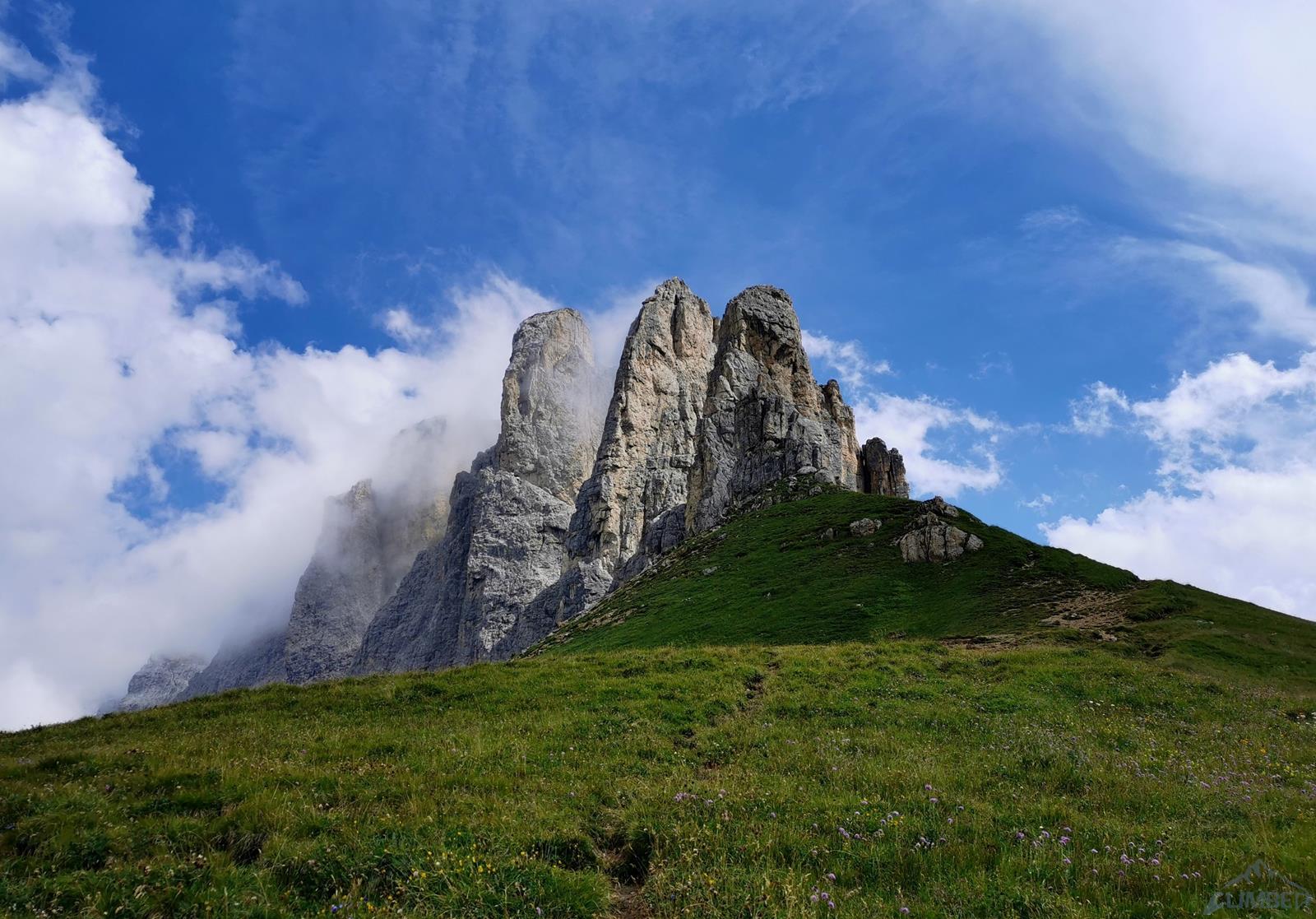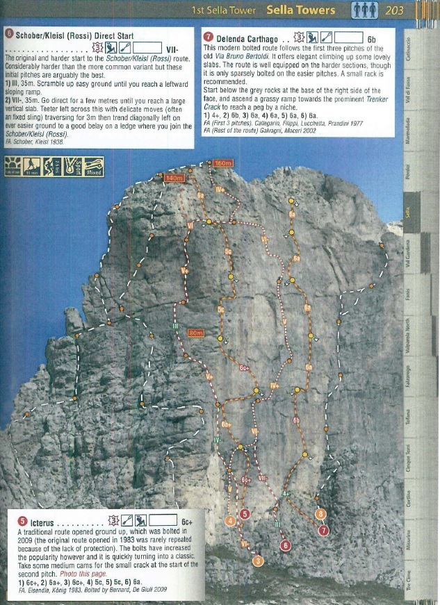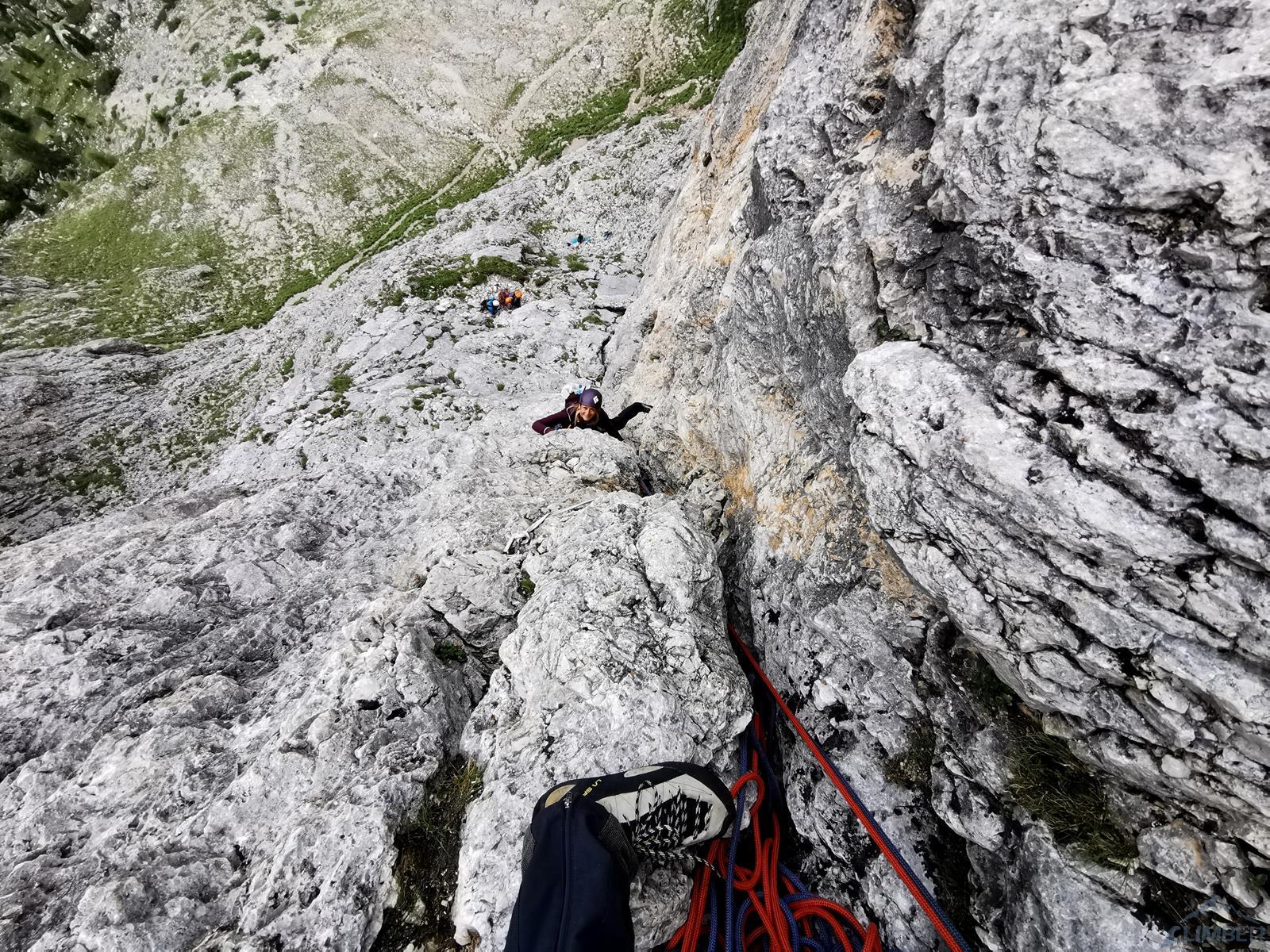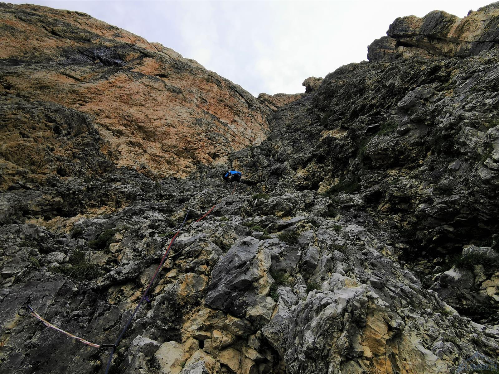 Poniedziałek to trzeci (na szczęście ostatni taki) dzień z pogodą w kratkę, dlatego też wracamy na południową ścianę Pierwszej Turni Selli - pierwszego dnia, zaraz po przyjeździe, robiliśmy tutaj drogę Delenda Carthago. Tym razem w planach mamy rozgrzewkę na tradowym klasyku (Trenker Crack) i spróbowanie Icterusa (6c+/7a w zależności od topo), o ile ściana wyschnie i nie zdąży jej ponownie zalać... Pierwsza droga jest bardzo popularna i prawie zawsze ktoś się na niej wspina – na szczęście uprzejmy zespół przepuszcza nas przodem, a my obiecujemy, że będziemy się sprężać 😊.