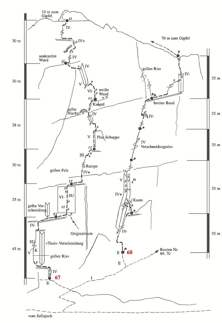 Pierwsze dwa (wg Rockfax) wyciągi łączymy – po starcie łatwym terenem (III), kontynuujemy wzdłuż rysy w prawo (IV), po przejściu której mijamy stare stanowisko z haków i dochodzimy do nowego z ringiem kilka metrów wyżej (zgadza się z topo Bernardiego). Trzeci wyciąg prowadzi tytułowym pęknięciem, czeka nas tutaj ładne wspinanie z komfortową asekuracją (haki i ring), stanowisko jest kilka metrów po trudnościach (V+). Dwa kolejne wyciągi przechodzimy na całą długość liny i kawałek na lotnej – idziemy systemem pęknięć do góry (III-IV), po czym albo kierujemy skośnie w prawo, albo kontynuujemy kominem i trawersujemy półką by w dogodnym miejscu założyć stanowisko. Ostatni odcinek to przyjemne (IV-) wspinanie kominem, z którego wychodzimy w łatwy teren pod granią, którą prowadzi ścieżka zejściowa (jeden 20 metrowy zjazd po drodze).