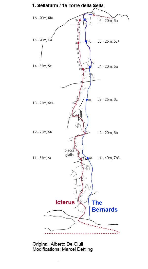Po dwóch godzinach od rozpoczęcia wspinania jesteśmy z powrotem pod ścianą – powoli zbierają się ciemne chmury, mimo to postanawiamy przynajmniej spróbować świetnie wyglądający pierwszy (zarazem kluczowy) wyciąg na Icterusie. Niestety brak odpowiedniego rozgrzania oraz ciągowe trudności po prostu mnie niszczą – udaje się dociągnąć do stanowiska po kilku blokach, bez zapasu nie ma szans na OS. Ania idąca na drugiego klnie na czym świat stoi, że namawiam ją na spróbowanie, zamiast od razu zjechać – do czego finalnie i tak dochodzi, nie tylko z powodu nadchodzącej burzy ale i braku mocy 😉. Jeżeli dla kogoś będzie za łatwo – tuż obok biegnie The Bernards z pierwszym wyciągiem za 7b/+ (później łatwiej), załączam wspólne topo bo nie wszędzie linia jest wrysowana.