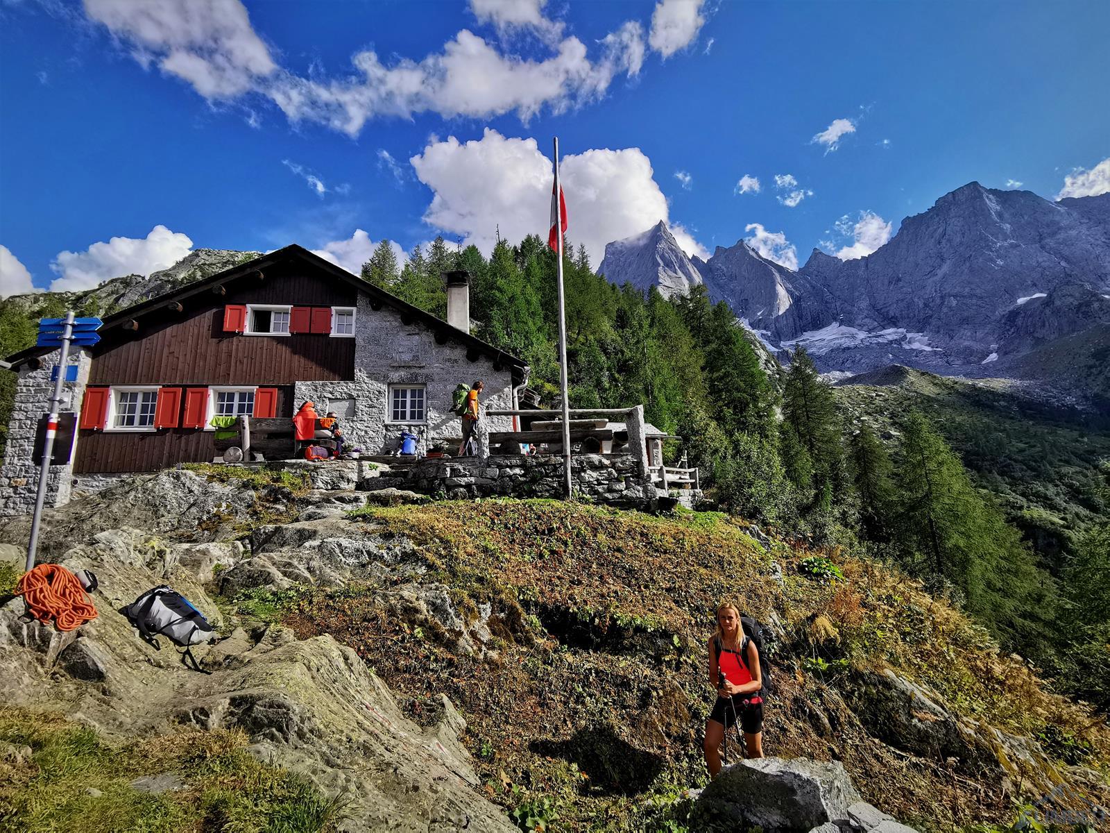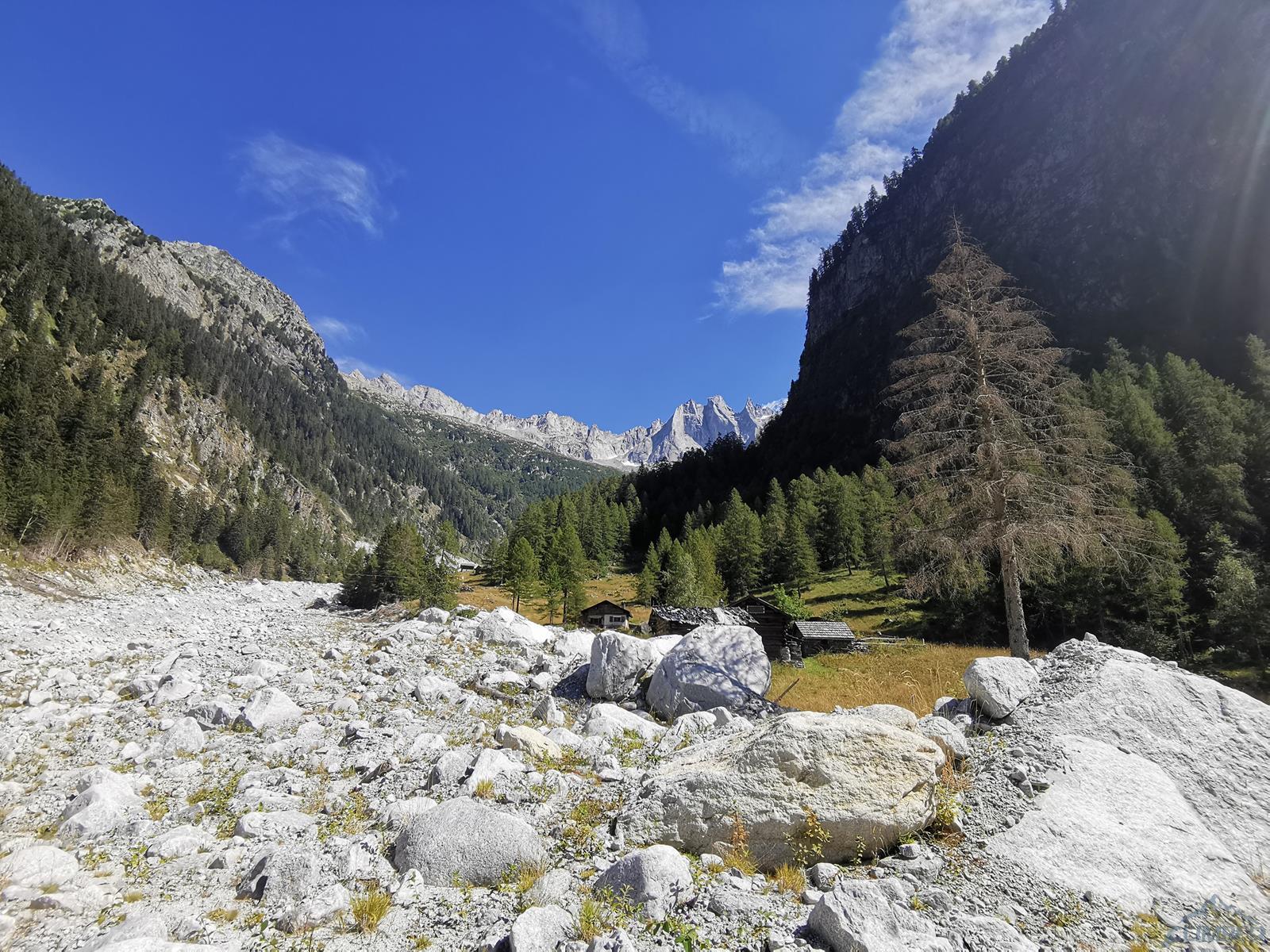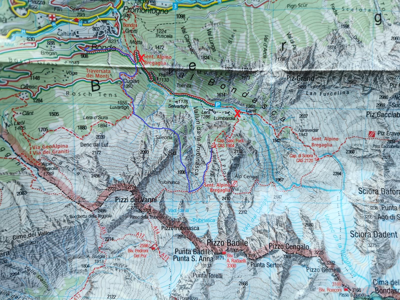 Gdy pod koniec pobytu w Dolomitach wypatrujemy trzydniowe okno pogodowe w okolicy Badyla, decyzja może być więc tylko jedna. Jak się bowiem można domyśleć, moja partnerka zafascynowała się drogą Cassina, gdy tylko się o niej dowiedziała i musiałem obiecać, że ją tam zabiorę 😊. W drodze do Szwajcarii robimy przystanek w Bolzano, gdzie zwiedzamy muzeum Messnera, po czym w poniedziałek docieramy do Bondo – miasteczka u wylotu Val Bondasca. Na parkingu niestety okazuje się, że Internet nie kłamie i również znaki pokazują, że nowym szlakiem poprowadzonym dookoła (zob. mapka) do schroniska Sasc Fura czeka nas 6 godzin podejścia oraz prawie 1400 metrów przewyższenia, do tego potem jeszcze około godziny i 400 metrów do miejsca biwakowego. Biorąc pod uwagę cały majdan na plecach (namiot, śpiwory, maty, gotowanie, sprzęt itp.) i mocno operujące Słońce, można się zniechęcić.