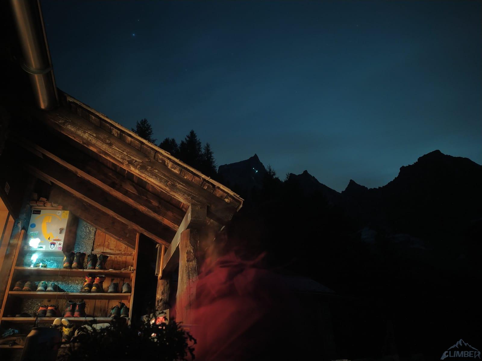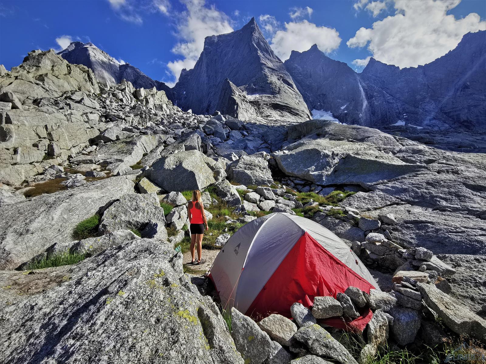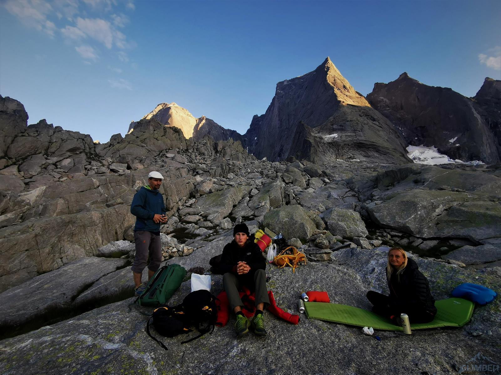 Wieczorem zatrzymujemy się na piwo w schronisku i… postanawiamy spędzić w nim noc oraz przesunąć całą akcję o jeden dzień – okazuje się bowiem, że z Polski dojechać dnia następnego mają koledzy i chcieliby wspinać się razem z nami! Nawet dobrze się składa – do środy ściana wyschnie (we wtorek będzie mokra po wieczornej ulewie), będzie kilka stopni cieplej, no i odpoczniemy po męczącym podejściu. Nieśmiało proponuję zrobienie we wtorek Kantu, ale na szczęście zostaje mi to szybko wybite z głowy 😉. Następnego dnia rano niespiesznie opuszczamy więc schronisko (1904 m.) i przenosimy się na biwak – rozbijamy się na wysokości ok. 2300 m., 15 minut od wejścia w skalny teren, którym podchodzi się na przełączkę oddzielającą ścianę północno-wschodnią od północno-zachodniej. Idę na mały rekonesans oraz po wodę (uzyskaną z topniejącego lodu bo innych źródeł niestety brak), później byczymy się przed namiotem i oczekujemy przybycia kolegów. Chłopaki docierają dopiero wieczorem, nie siedzimy więc długo – obgadujemy plan przy piwku i zaraz po zachodzie Słońca kładziemy się spać.
