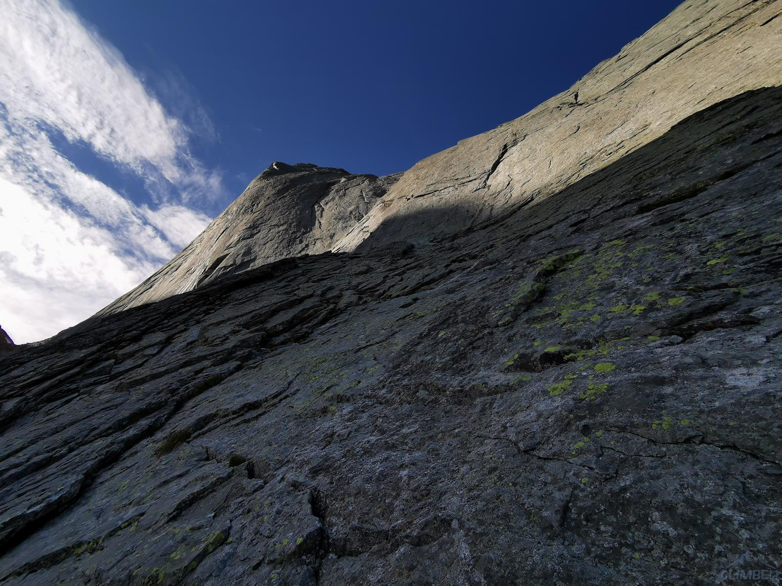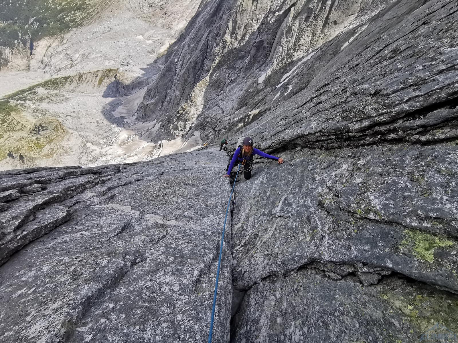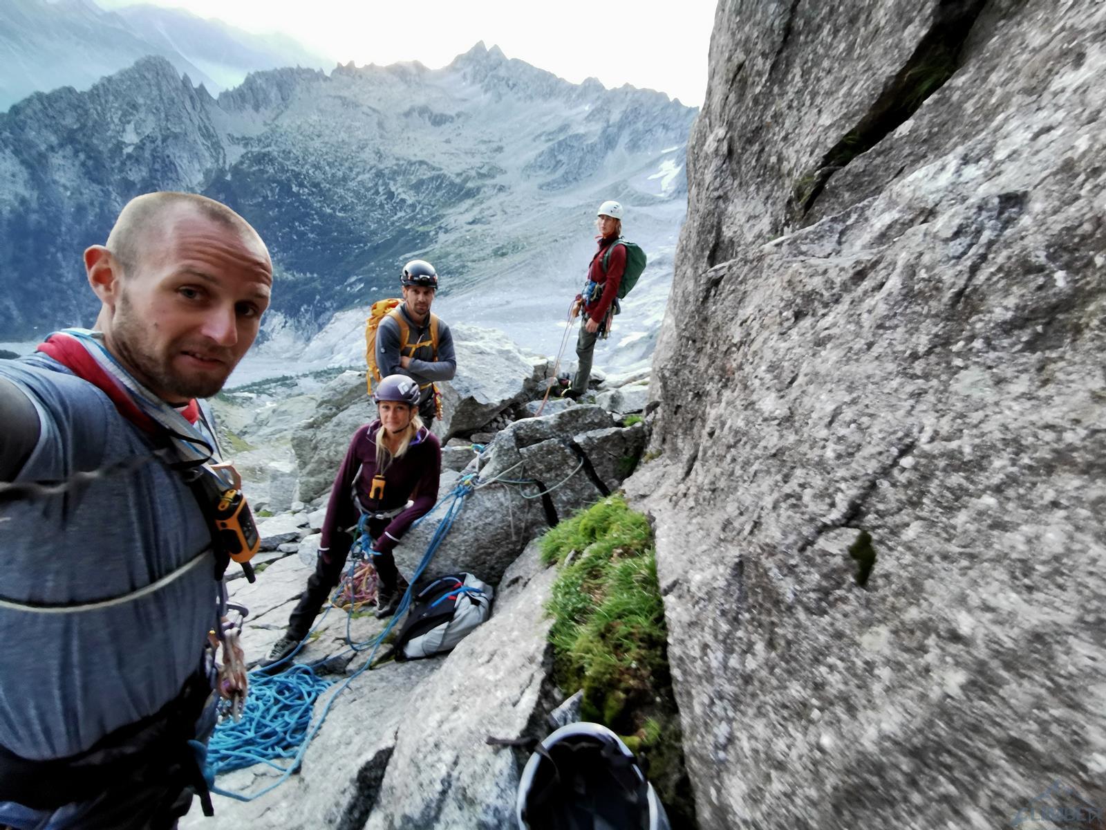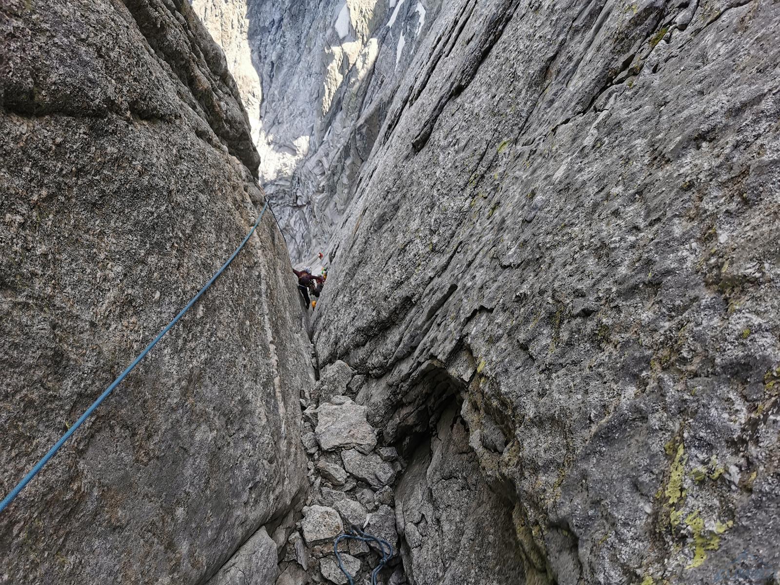 Pobudka po 4, śniadanie i około 5 wyruszamy – najpierw pomiędzy głazami, później skalnymi płytami na przełączkę, z której jednym 30-metrowym zjazdem dostajemy się na półki pod północno-wschodnią ścianą. Pola lodowego nie ma, bez problemów podchodzimy więc pod drogę – jedyną niespodzianką jest niebanalny trójkowy kominek, który pokonywany po ciemku na żywca może przysporzyć trochę emocji 😉. W tradycyjnym wyścigu pod ścianę (klasyk+pogoda=tłumy) zajmujemy miejsce w środku stawki - przed nami bodajże trzy, za nami dwa zespoły. Zdecydowanie bardziej podoba nam się wariant startowy Rebuffata, dlatego też chwilę przed godziną 7 wspinanie zaczynamy od pięknego zacięcia – najpierw ja z Anią, później Błażej (Młody) z Mariuszem. Podczas przejścia korzystaliśmy głównie ze schematu Topoguide oraz opisu z Pobegi, ta kombinacja sprawdziła się bardzo dobrze i idąc z przodu nie miałem problemów z wyszukiwaniem drogi czy stanowisk. Warto dodatkowo zapoznać się z topo Bergsteigen, różniącym się nieco wycenami poszczególnych wyciągów. Załączam wszystkie trzy, w opisie i na zdjęciach trzymam się jednak numeracji wyciągów z Topoguide. Do grani jest ok. 20 wyciągów + ok. 5 długości liny do szczytu.