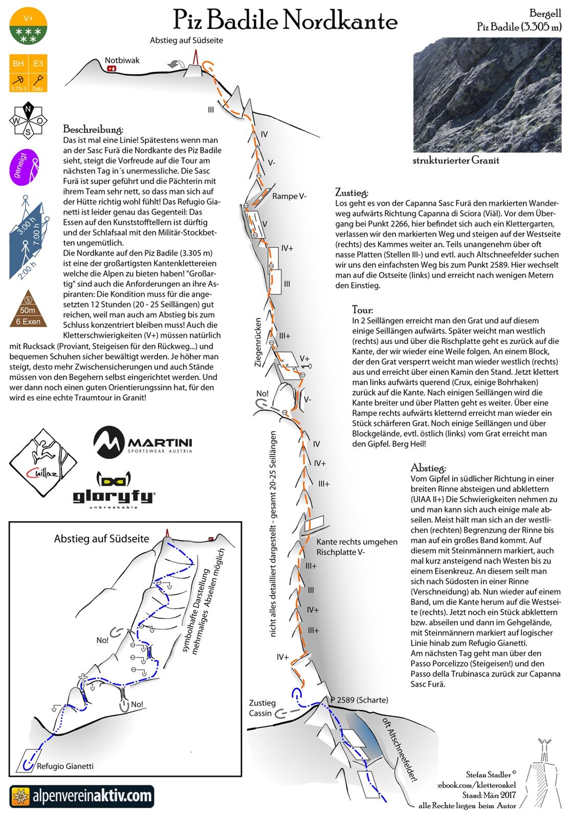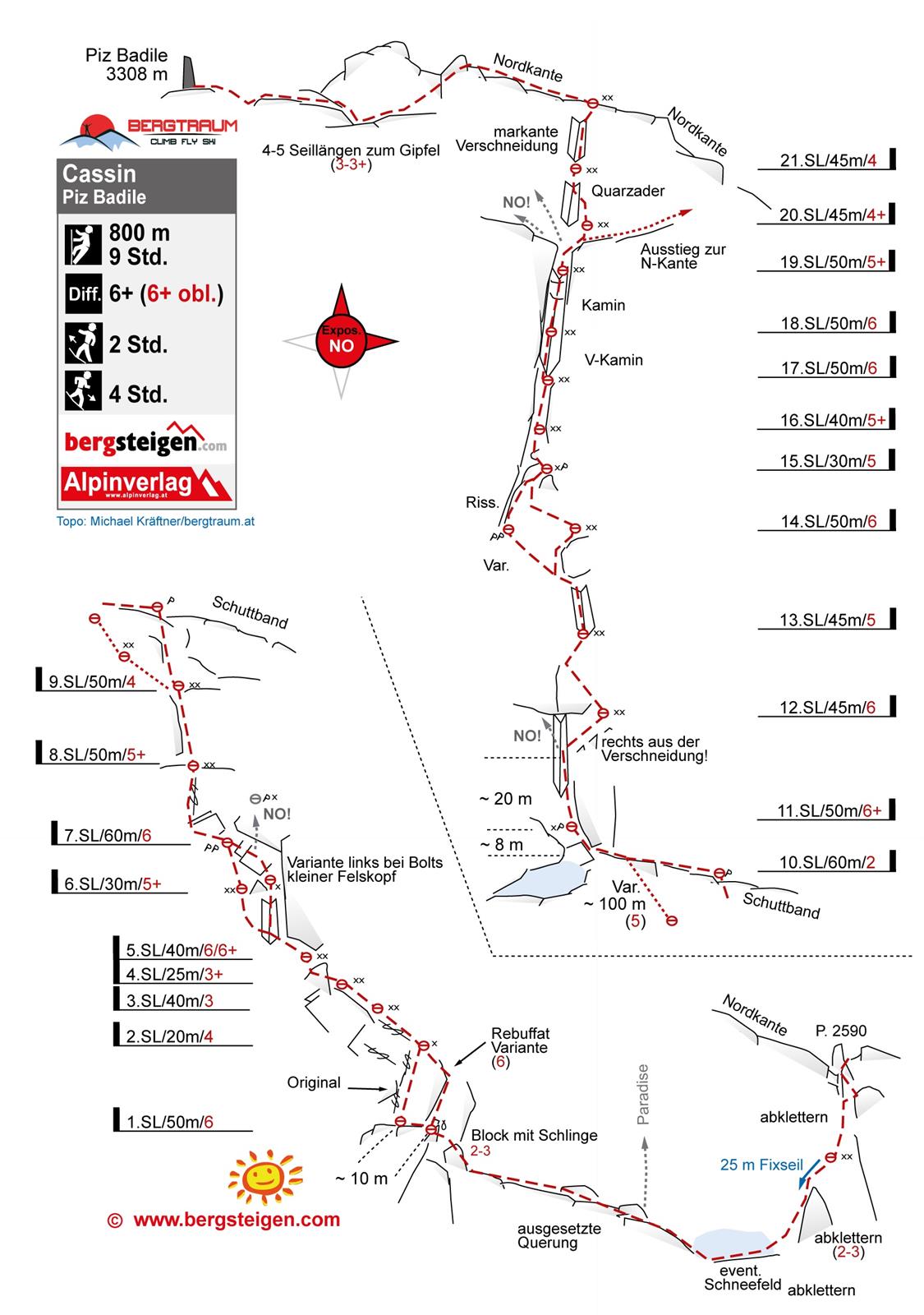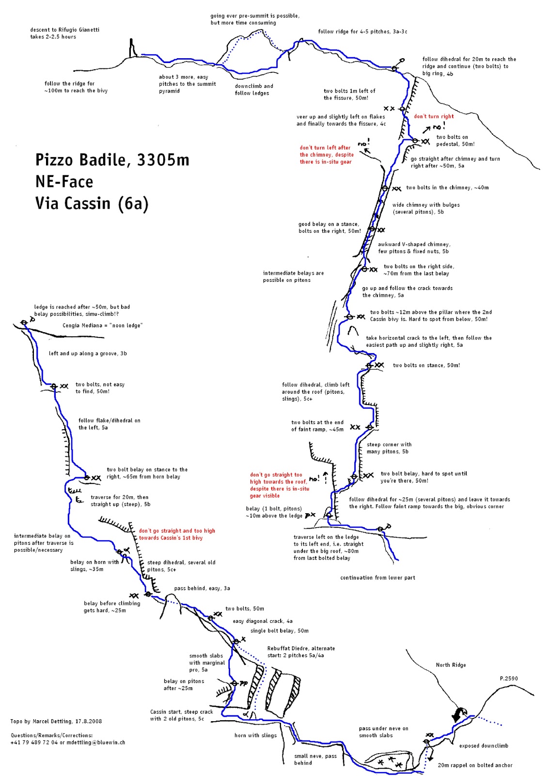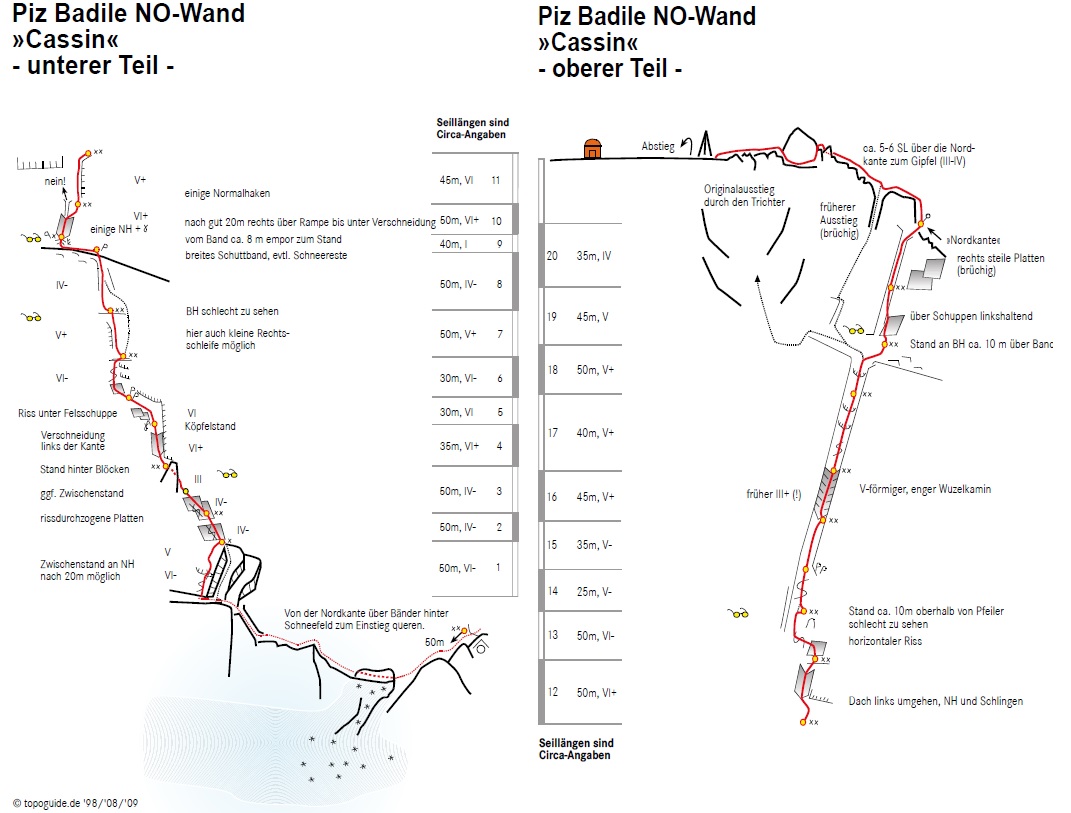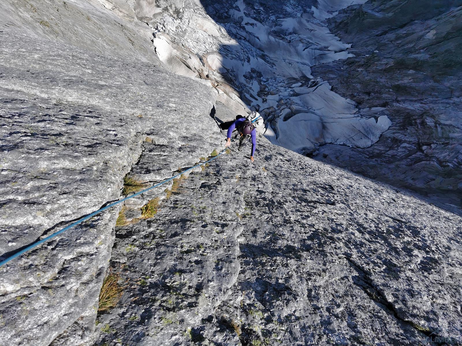 Pobudka po 4, śniadanie i około 5 wyruszamy – najpierw pomiędzy głazami, później skalnymi płytami na przełączkę, z której jednym 30-metrowym zjazdem dostajemy się na półki pod północno-wschodnią ścianą. Pola lodowego nie ma, bez problemów podchodzimy więc pod drogę – jedyną niespodzianką jest niebanalny trójkowy kominek, który pokonywany po ciemku na żywca może przysporzyć trochę emocji 😉. W tradycyjnym wyścigu pod ścianę (klasyk+pogoda=tłumy) zajmujemy miejsce w środku stawki - przed nami bodajże trzy, za nami dwa zespoły. Zdecydowanie bardziej podoba nam się wariant startowy Rebuffata, dlatego też chwilę przed godziną 7 wspinanie zaczynamy od pięknego zacięcia – najpierw ja z Anią, później Błażej (Młody) z Mariuszem. Podczas przejścia korzystaliśmy głównie ze schematu Topoguide oraz opisu z Pobegi, ta kombinacja sprawdziła się bardzo dobrze i idąc z przodu nie miałem problemów z wyszukiwaniem drogi czy stanowisk. Warto dodatkowo zapoznać się z topo Bergsteigen, różniącym się nieco wycenami poszczególnych wyciągów. Załączam wszystkie trzy, w opisie i na zdjęciach trzymam się jednak numeracji wyciągów z Topoguide. Do grani jest ok. 20 wyciągów + ok. 5 długości liny do szczytu.