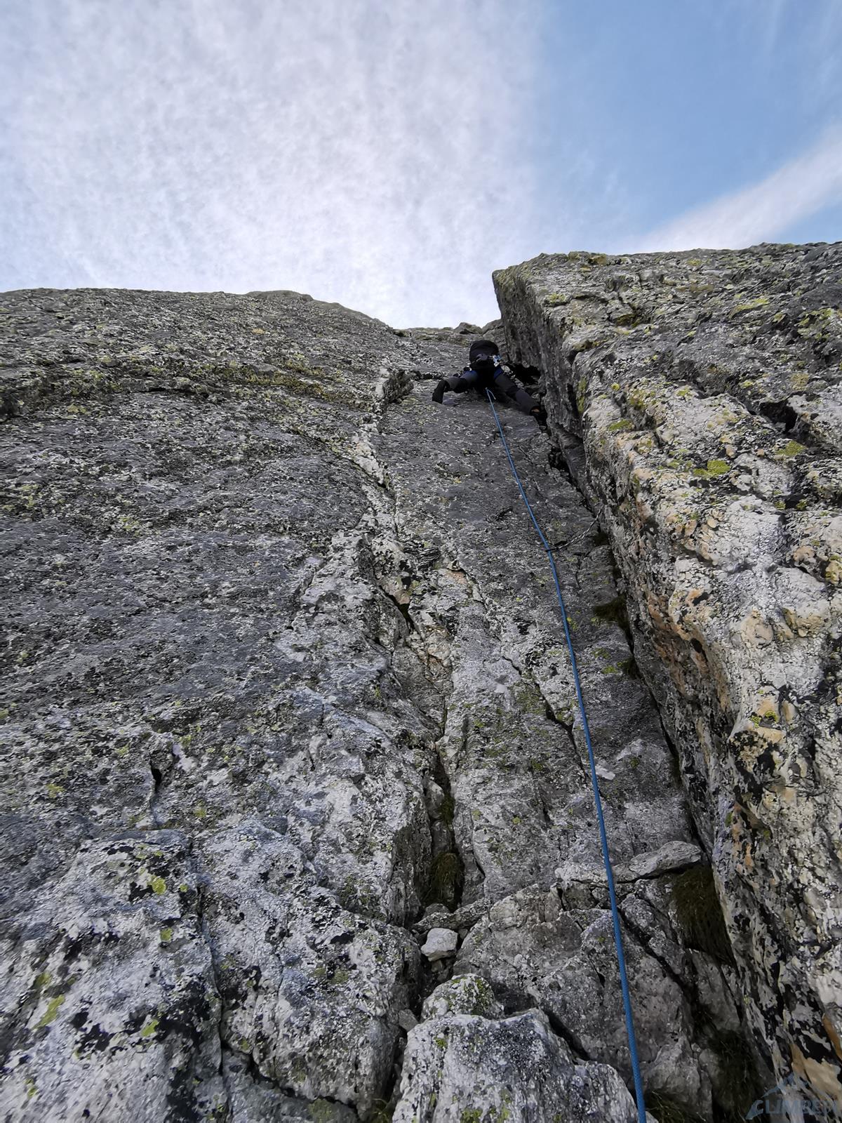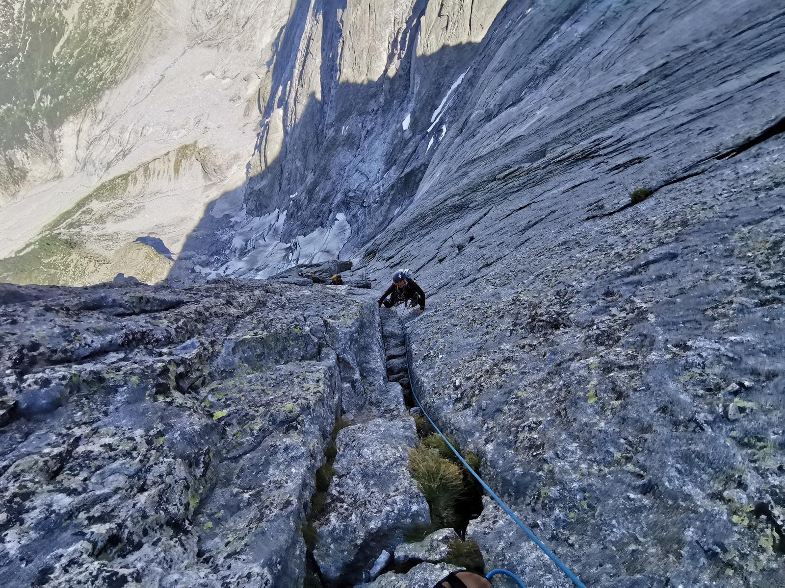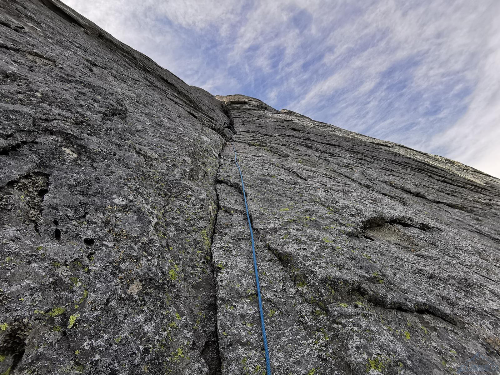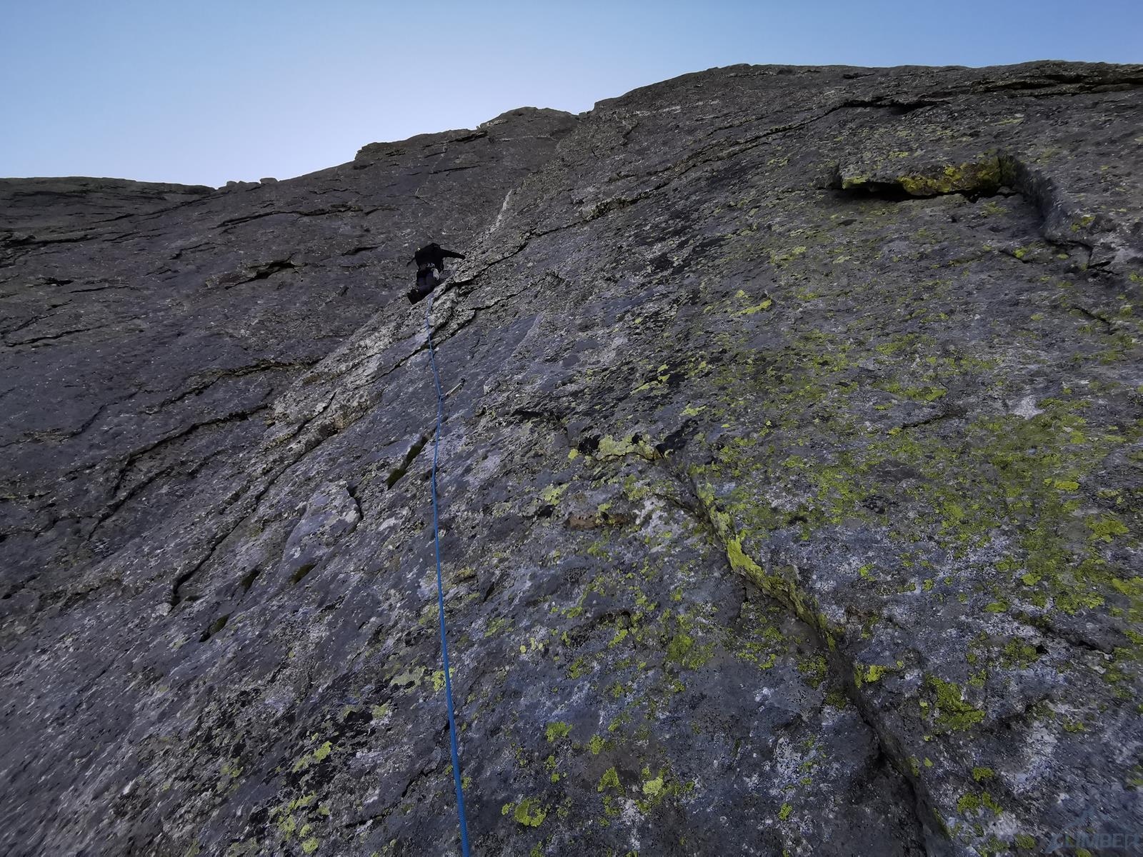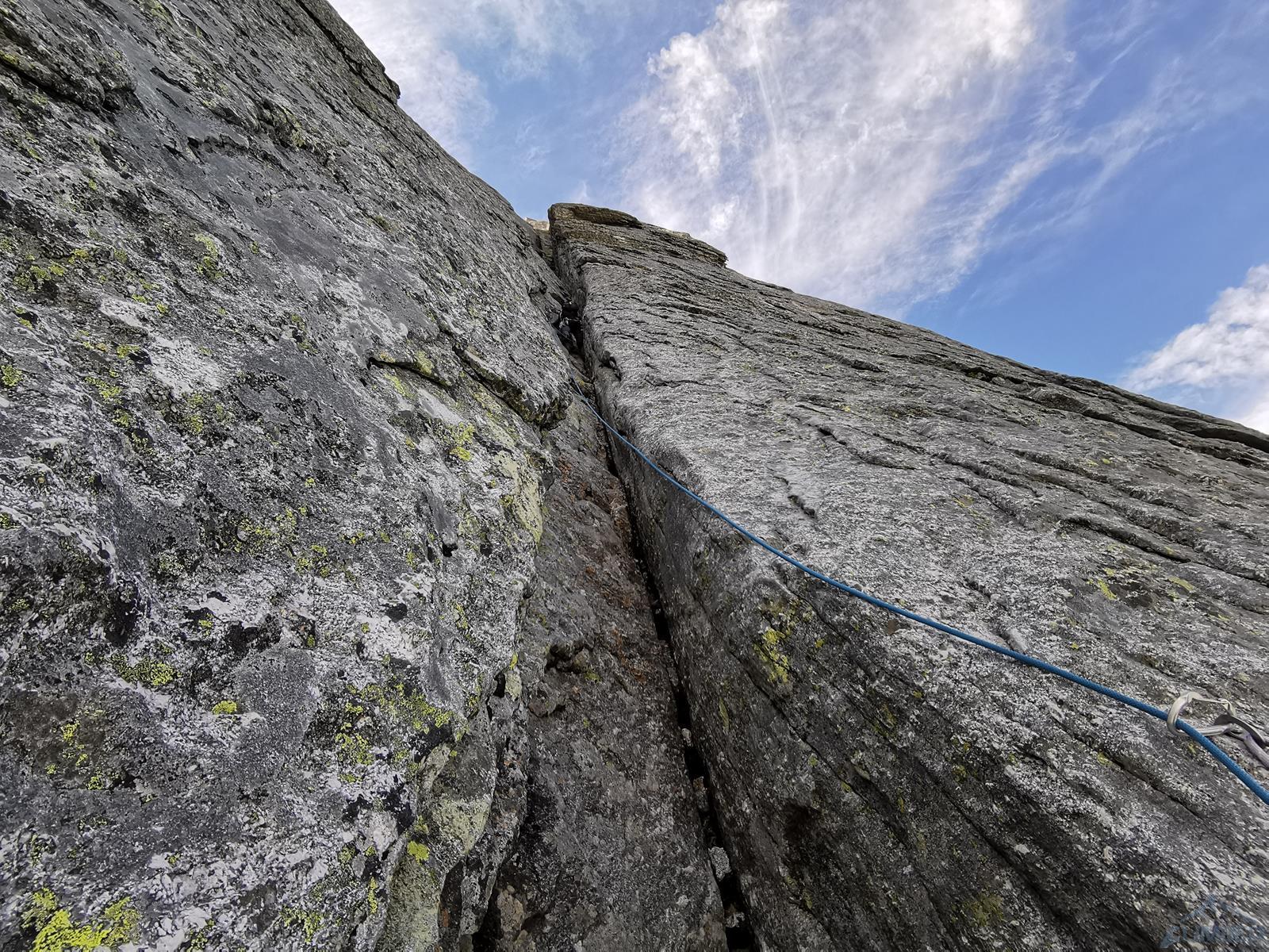 Po przerwie ruszamy w jeden z najbardziej wymagających wyciągów na drodze, ciągowy odcinek VI+. Startujemy ze stanowiska (uwaga - kilka metrów nad półką!) i po około 20 metrach technicznego wspinania w zacięciu przewijamy się przez kant w prawo, gdzie czeka nas łatwiejsza ale słabo asekurowalna płyta. Momentu przewinięcia lepiej nie przegapić, a o to nietrudno, wyżej w zacięciu są bowiem kolejne haki. Chłopaki nawet idąc za nami pchają się za wysoko, na szczęście tylko 2-3 metry i mogą jeszcze uratować sytuację. Wyciąg 11-ty to prawdziwa perełka – mały trawers w lewo, po czym wspinamy się uklamionym, spionowanym kancikiem (ok. V+ do VI), który wyprowadza nas po ok. 50 metrach do stanowiska po prawej. Kolejne 50 metrów jest chyba równie piękne, jednak zdecydowanie bardziej techniczne (VI+) – wspinamy się zacięciem, płyta po lewej jednak oferuje słabe stopnie, co powoduje narastający dyskomfort w palcach u stóp 😊. Wyciąg 13-ty zaczynamy horyzontalną rysą w lewo (krótki odcinek VI), po czym już łatwiej wzdłuż pęknięcia aż do stanowiska (po ok. 50 metrach). Kolejne dwa odcinki są bardzo przyjemne – pierwszy prowadzi uklamioną depresją (V-), drugi przepiękną rysą (ok. V) – w sumie ok. 70 metrów więc w przypadku łączenia trzeba trochę podejść.