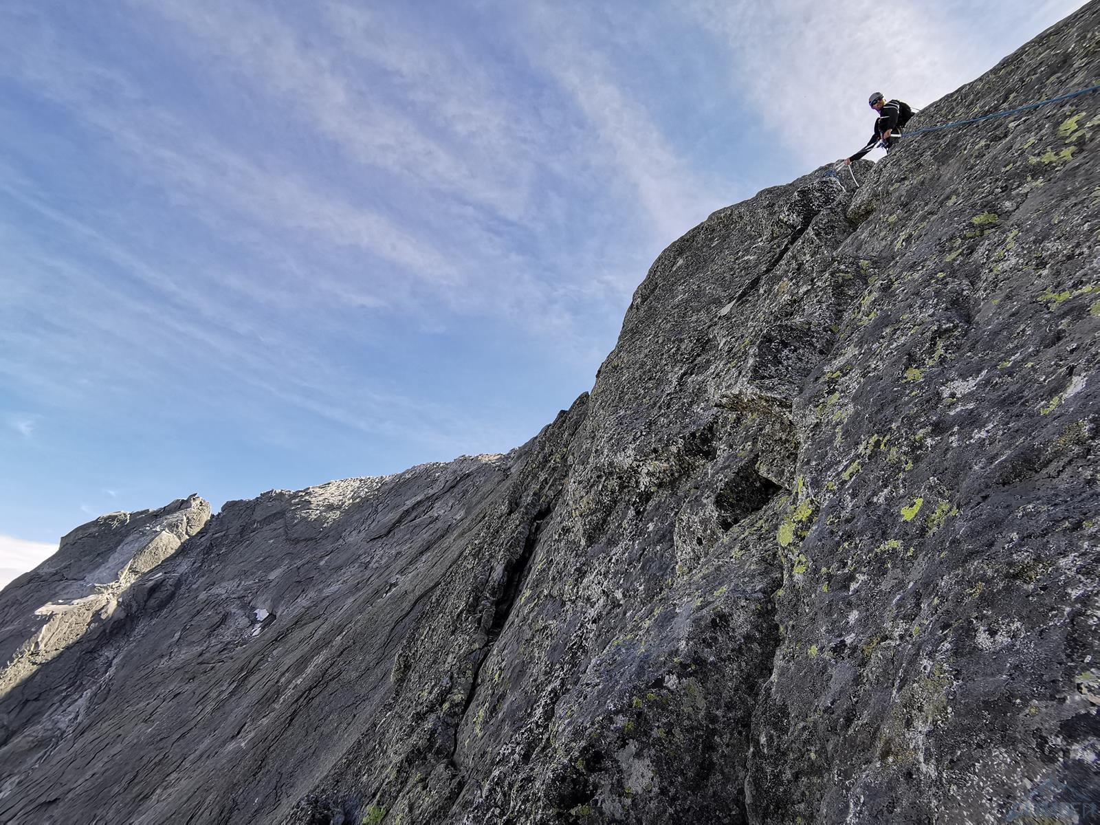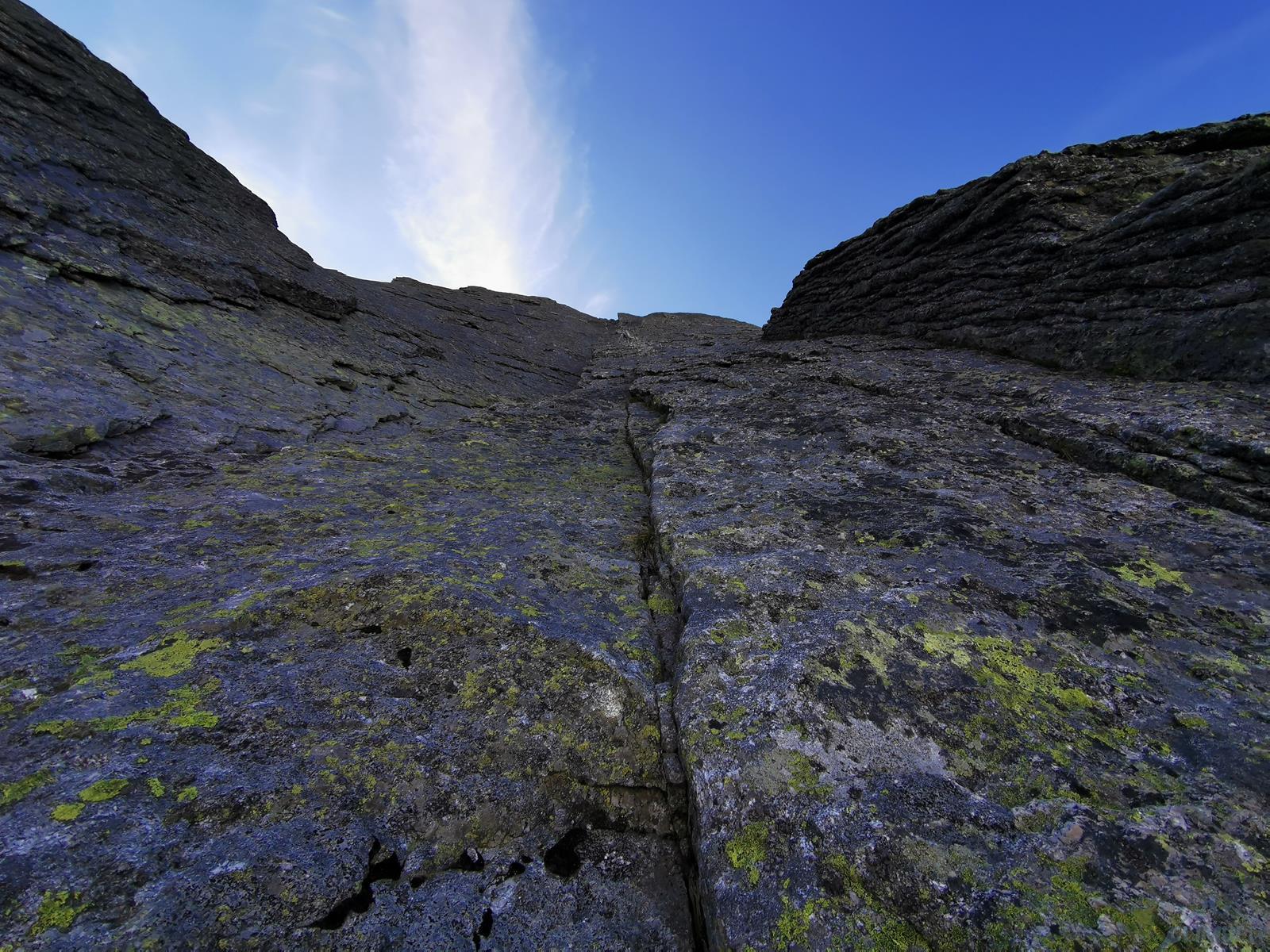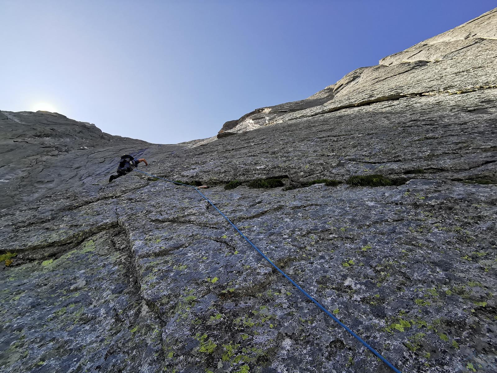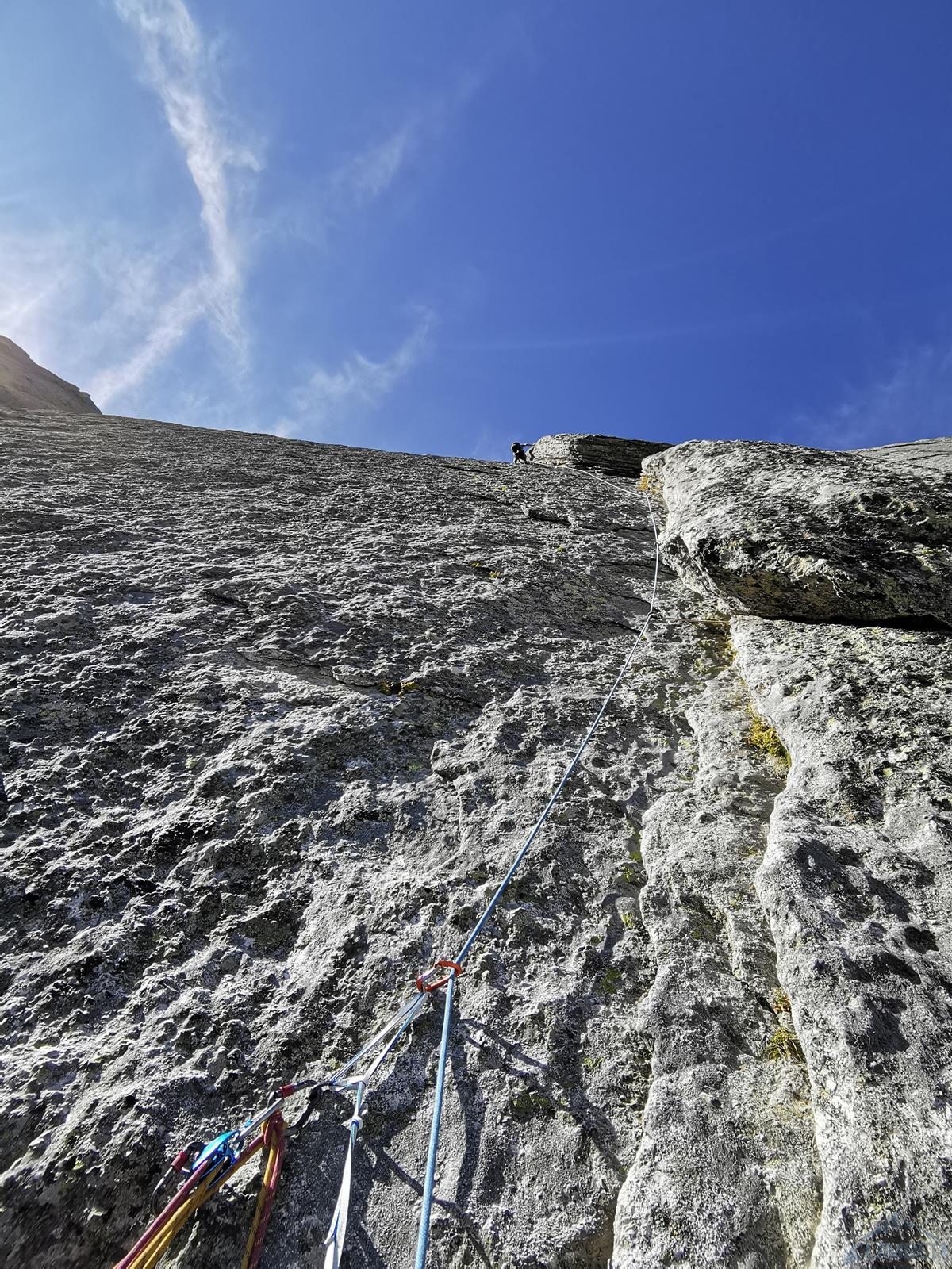 Po przerwie ruszamy w jeden z najbardziej wymagających wyciągów na drodze, ciągowy odcinek VI+. Startujemy ze stanowiska (uwaga - kilka metrów nad półką!) i po około 20 metrach technicznego wspinania w zacięciu przewijamy się przez kant w prawo, gdzie czeka nas łatwiejsza ale słabo asekurowalna płyta. Momentu przewinięcia lepiej nie przegapić, a o to nietrudno, wyżej w zacięciu są bowiem kolejne haki. Chłopaki nawet idąc za nami pchają się za wysoko, na szczęście tylko 2-3 metry i mogą jeszcze uratować sytuację. Wyciąg 11-ty to prawdziwa perełka – mały trawers w lewo, po czym wspinamy się uklamionym, spionowanym kancikiem (ok. V+ do VI), który wyprowadza nas po ok. 50 metrach do stanowiska po prawej. Kolejne 50 metrów jest chyba równie piękne, jednak zdecydowanie bardziej techniczne (VI+) – wspinamy się zacięciem, płyta po lewej jednak oferuje słabe stopnie, co powoduje narastający dyskomfort w palcach u stóp 😊. Wyciąg 13-ty zaczynamy horyzontalną rysą w lewo (krótki odcinek VI), po czym już łatwiej wzdłuż pęknięcia aż do stanowiska (po ok. 50 metrach). Kolejne dwa odcinki są bardzo przyjemne – pierwszy prowadzi uklamioną depresją (V-), drugi przepiękną rysą (ok. V) – w sumie ok. 70 metrów więc w przypadku łączenia trzeba trochę podejść.