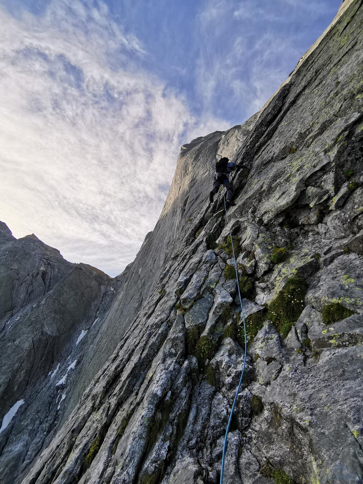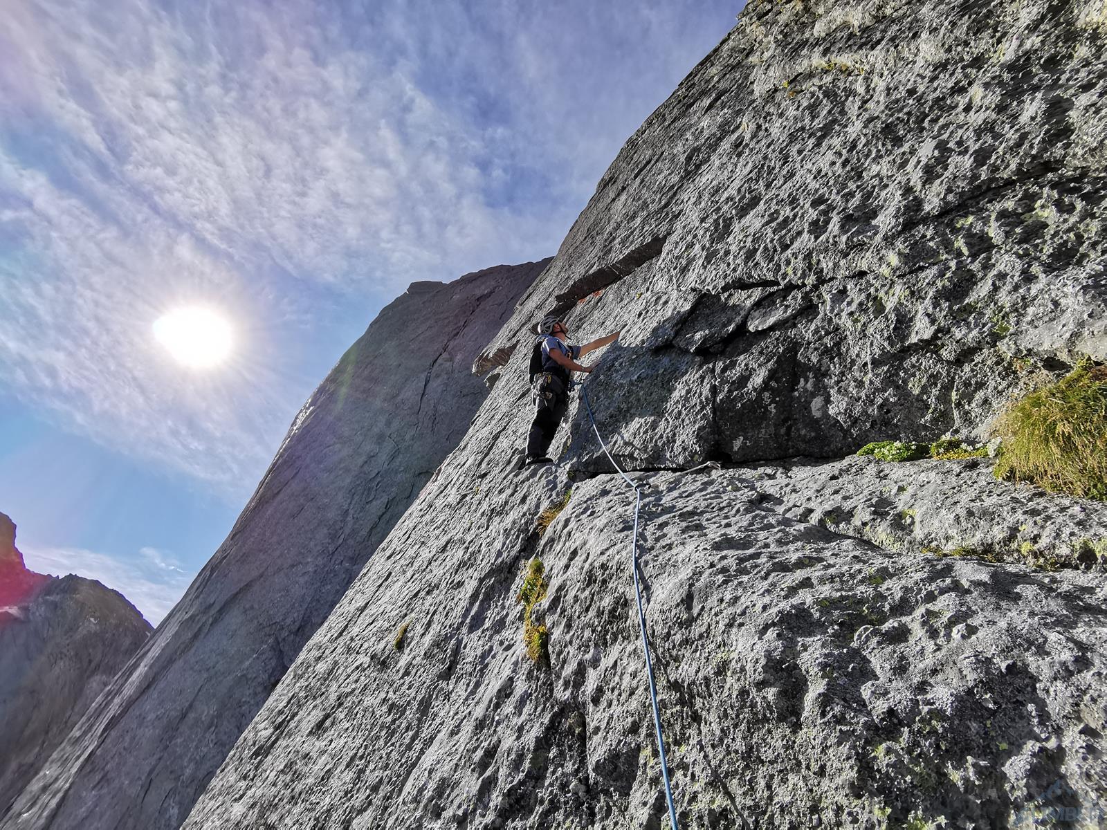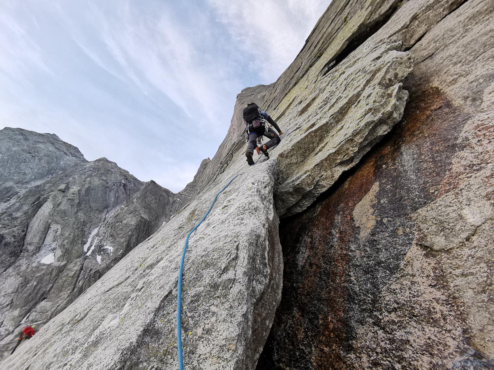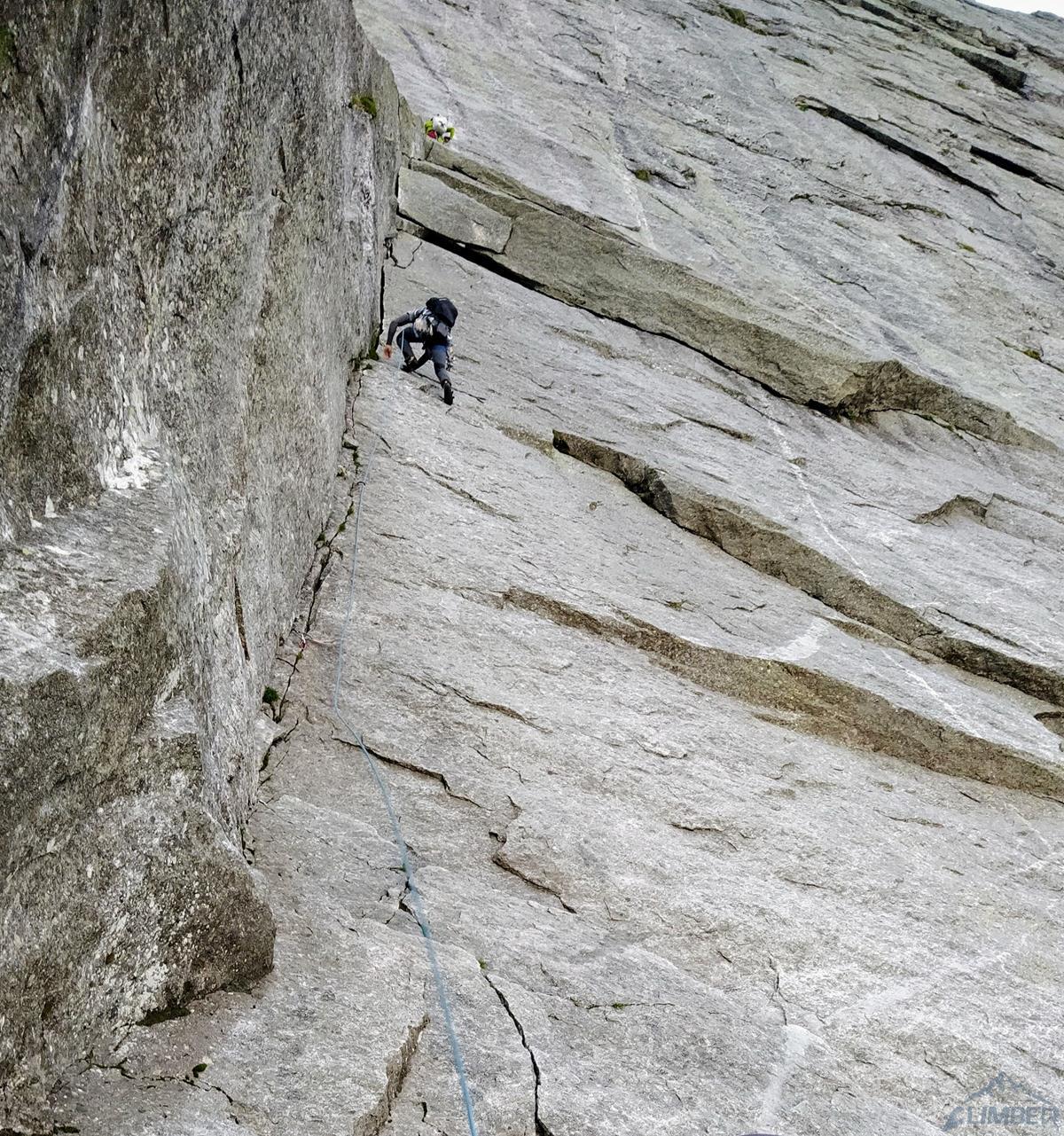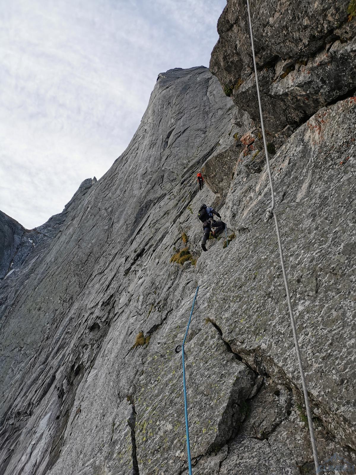 Po przerwie ruszamy w jeden z najbardziej wymagających wyciągów na drodze, ciągowy odcinek VI+. Startujemy ze stanowiska (uwaga - kilka metrów nad półką!) i po około 20 metrach technicznego wspinania w zacięciu przewijamy się przez kant w prawo, gdzie czeka nas łatwiejsza ale słabo asekurowalna płyta. Momentu przewinięcia lepiej nie przegapić, a o to nietrudno, wyżej w zacięciu są bowiem kolejne haki. Chłopaki nawet idąc za nami pchają się za wysoko, na szczęście tylko 2-3 metry i mogą jeszcze uratować sytuację. Wyciąg 11-ty to prawdziwa perełka – mały trawers w lewo, po czym wspinamy się uklamionym, spionowanym kancikiem (ok. V+ do VI), który wyprowadza nas po ok. 50 metrach do stanowiska po prawej. Kolejne 50 metrów jest chyba równie piękne, jednak zdecydowanie bardziej techniczne (VI+) – wspinamy się zacięciem, płyta po lewej jednak oferuje słabe stopnie, co powoduje narastający dyskomfort w palcach u stóp 😊. Wyciąg 13-ty zaczynamy horyzontalną rysą w lewo (krótki odcinek VI), po czym już łatwiej wzdłuż pęknięcia aż do stanowiska (po ok. 50 metrach). Kolejne dwa odcinki są bardzo przyjemne – pierwszy prowadzi uklamioną depresją (V-), drugi przepiękną rysą (ok. V) – w sumie ok. 70 metrów więc w przypadku łączenia trzeba trochę podejść.