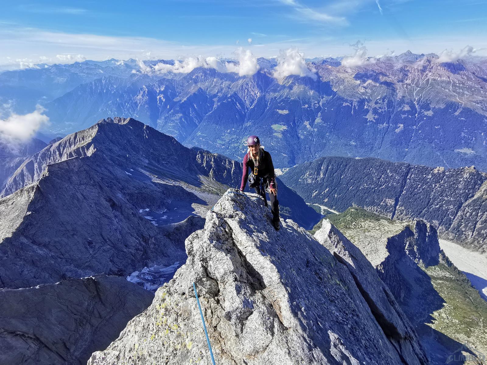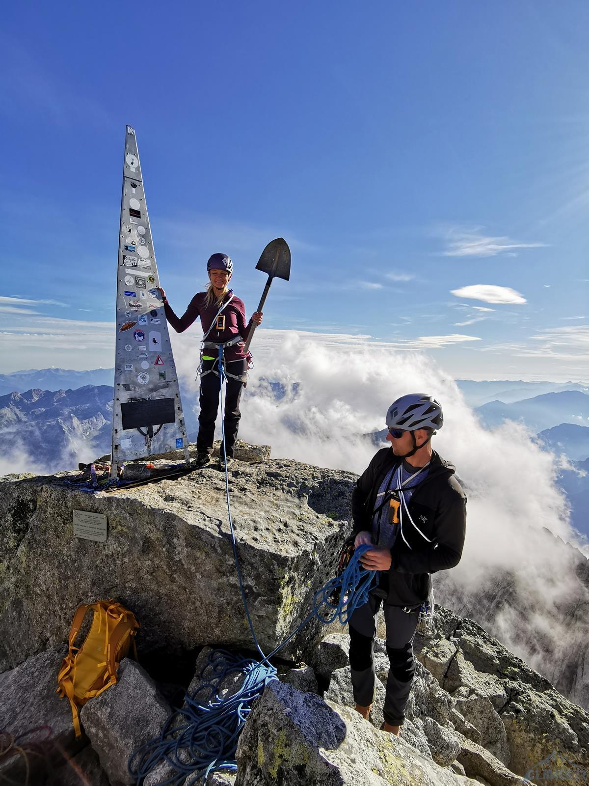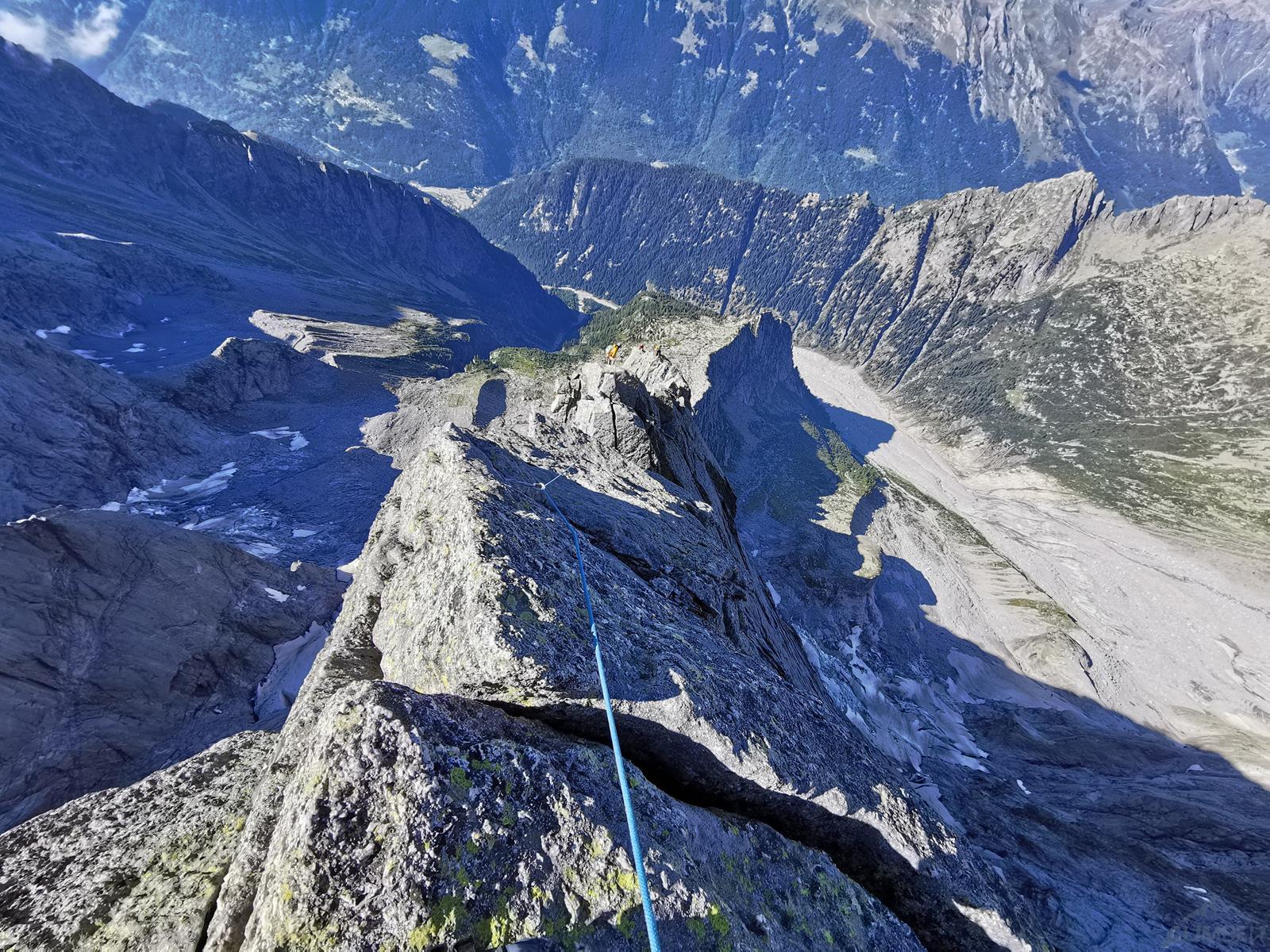 Ze ściany wychodzimy po ok. 9 godzinach (ok. 16-tej) – wspinanie było tak piękne, że mimo prowadzenia wszystkich wyciągów nie czuję zmęczenia i od razu namawiam Anię by kontynuować granią na szczyt – co prawda to kolejne 4-5 długości liny ale nie za trudne (III-IV, lotna) i w pięknej scenerii! Partnerka początkowo nie jest przekonana, na szczycie zmienia jednak nastawienie i przyznaje, że bez postawienia kropki nad i cała przygoda byłaby trochę wybrakowana. Pozostaje mi jeszcze nakrzyczeć (jak wiadomo nie ma ze mną lekko) na chłopaków przez radio żeby czasem nie myśleli do nas nie dołączyć i wkrótce wszyscy (około 17:30) możemy uścisnąć sobie dłonie na piku. Zespoły, które ukończyły wspinanie przed nami wybrały zejście na włoską stronę, ekipa za nami postanawia spędzić noc w schronie pod szczytem (Bivacco Alfredo Reaelli) i taką opcję też przez chwilę rozważamy. Przekonuję resztę, że mimo iż do zmroku 3 godziny (a na zjazdy bez znajomości wg opisu schodzi ok. 6 – do pokonania jest ok. 1200 metrów!) damy radę i noc spędzimy w namiotach. Na swoje usprawiedliwienie podam tylko fakt, że wg Wikipedii schron „przeznaczony jest dla krańcowo wyczerpanych zdobywców północnych urwisk Piz Badile”, a my przecież czujemy się dobrze 😉. Oczywiście to żart - moja decyzja była błędna, co kosztowało nas sporo stresu i całą noc pracy, przeplatanej oczekiwaniem aż namierzymy kolejny właściwy zjazd.