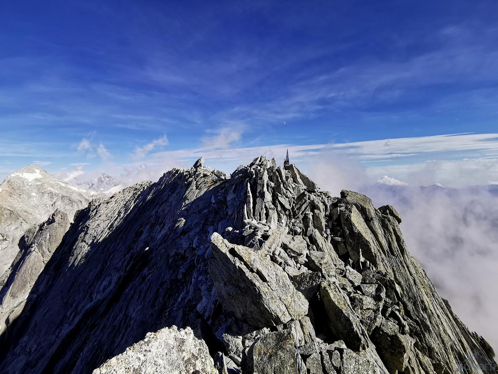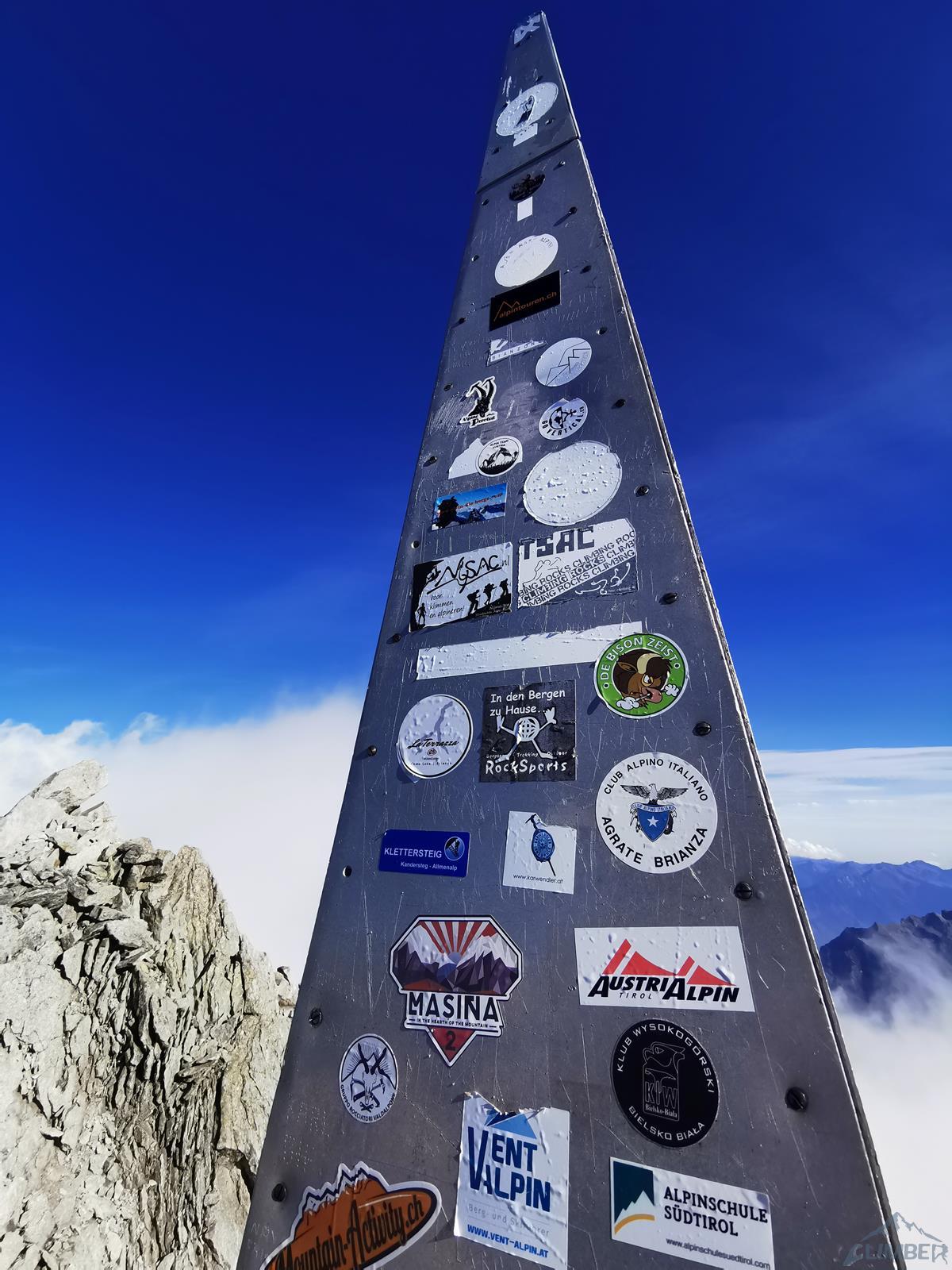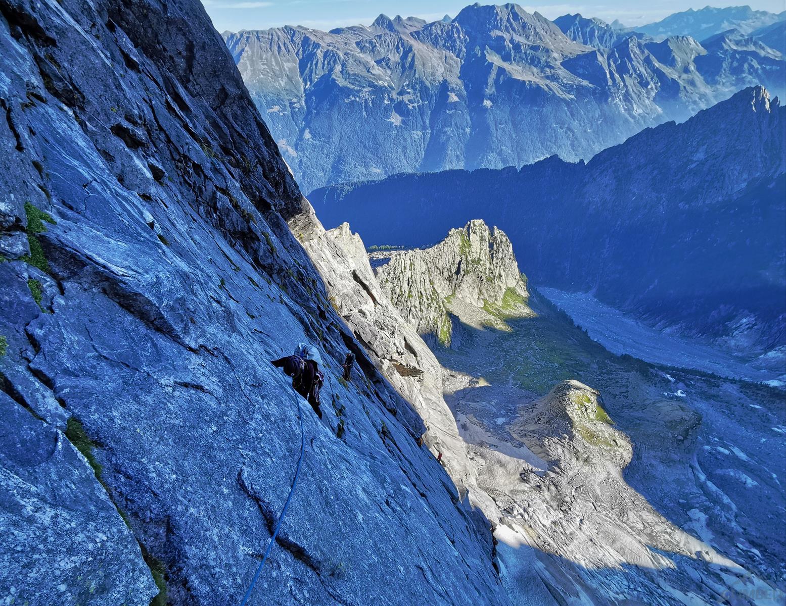 Ze ściany wychodzimy po ok. 9 godzinach (ok. 16-tej) – wspinanie było tak piękne, że mimo prowadzenia wszystkich wyciągów nie czuję zmęczenia i od razu namawiam Anię by kontynuować granią na szczyt – co prawda to kolejne 4-5 długości liny ale nie za trudne (III-IV, lotna) i w pięknej scenerii! Partnerka początkowo nie jest przekonana, na szczycie zmienia jednak nastawienie i przyznaje, że bez postawienia kropki nad i cała przygoda byłaby trochę wybrakowana. Pozostaje mi jeszcze nakrzyczeć (jak wiadomo nie ma ze mną lekko) na chłopaków przez radio żeby czasem nie myśleli do nas nie dołączyć i wkrótce wszyscy (około 17:30) możemy uścisnąć sobie dłonie na piku. Zespoły, które ukończyły wspinanie przed nami wybrały zejście na włoską stronę, ekipa za nami postanawia spędzić noc w schronie pod szczytem (Bivacco Alfredo Reaelli) i taką opcję też przez chwilę rozważamy. Przekonuję resztę, że mimo iż do zmroku 3 godziny (a na zjazdy bez znajomości wg opisu schodzi ok. 6 – do pokonania jest ok. 1200 metrów!) damy radę i noc spędzimy w namiotach. Na swoje usprawiedliwienie podam tylko fakt, że wg Wikipedii schron „przeznaczony jest dla krańcowo wyczerpanych zdobywców północnych urwisk Piz Badile”, a my przecież czujemy się dobrze 😉. Oczywiście to żart - moja decyzja była błędna, co kosztowało nas sporo stresu i całą noc pracy, przeplatanej oczekiwaniem aż namierzymy kolejny właściwy zjazd.