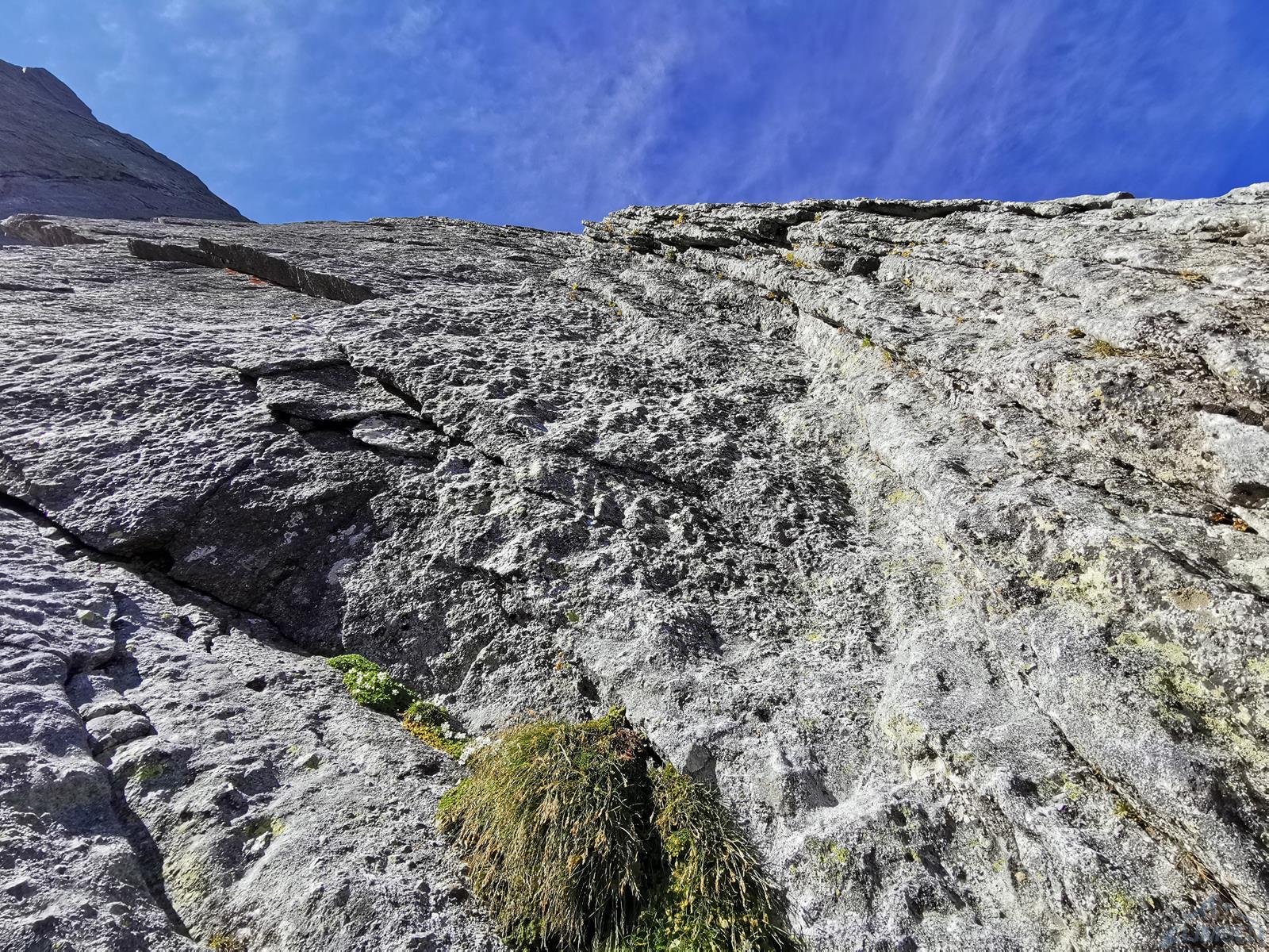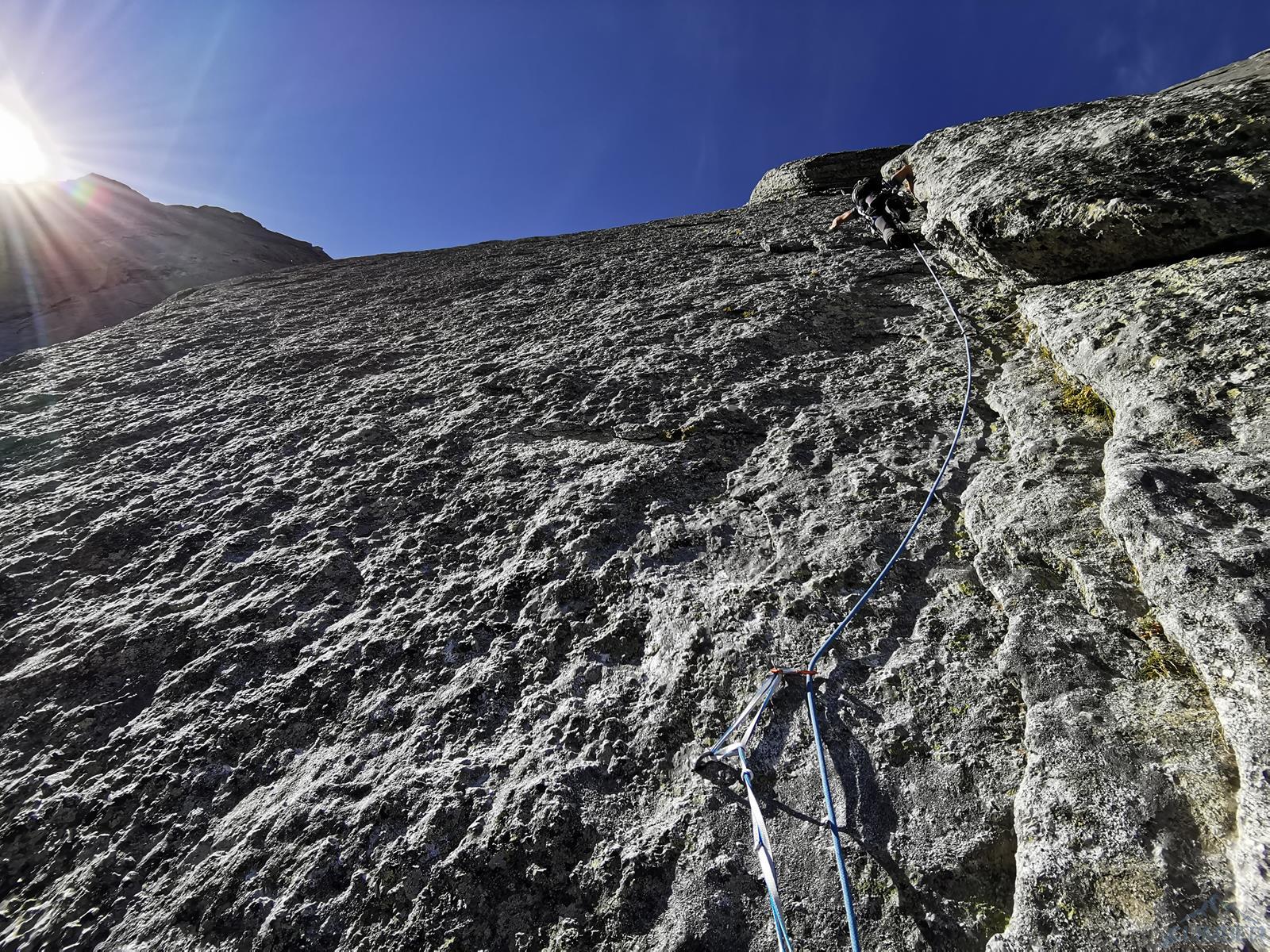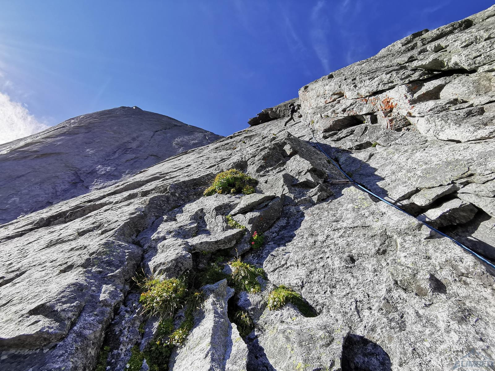 Ze stanowiska po zacięciu dwa kolejne wyciągi (ok. 100 metrów, trudności IV) przechodzimy na lotnej – na początek ciekawa pozioma ryska, później już łatwiej płytami i kominkiem za turnicą do stanowiska przed wyciągiem czwartym. Tutaj czekają nas pierwsze trudności szóstkowe – tarciowy trawers pod okapami (VI+, ok. 40 metrów, sporo haków) i lepiej urzeźbiona płyta na wyciągu kolejnym (ok. VI, 30 metrów). Szósty wyciąg jest bardziej spionowany ale oferuje świetne chwyty wzdłuż rysy, dlatego też trudności są przystępne (VI-). Bardzo przyjemny jest również kolejny odcinek – odstrzelona płyta (V+) i zacięcie, którym po ok. 50 metrach dostajemy się do stanowiska pod dachówkowatymi skałami. Na obu odcinkach w miejscach gdzie nie ma haków, friendy siadają jak złoto 😊. Dalej do wyboru mamy przynajmniej dwa warianty – albo pionowo do góry wzdłuż pęknięć (ok. IV) do Półki Środkowej (Cengia Mediana) i nią spory (ok. 50-metrowy) spacer albo skośnie w lewo depresjami. My zdecydowaliśmy się na drugą opcję i wyszło prawie (jak podaje Bergsteigen) prawie 100 metrów fajnego, nietrudnego (IV-V) wspinania – gdy skończyła się lina, przeszliśmy na lotną i w ten sposób dotarliśmy pod początek trudności nad półkami. Doganiamy dwójkę przewodników z klientami, fundujemy sobie więc dłuższą przerwę. Akurat w tym miejscu na ścianie pojawia się Słońce, nie narzekamy więc i spokojnie czekamy na Mariusza i Młodego, dla którego to debiut na dużej ścianie – stara się więc nie tracić nas z oczy by się gdzieś nie zapchać i kosi aż miło. Ania prosi by trochę zwolnić i pocieszyć się wspinaniem – faktycznie trochę za bardzo goniliśmy i dotychczasowe ok. 400 metrów przeszliśmy w nieco ponad 2 godziny. Wiemy też jednak, że w górnej części ściany czeka nas sporo trudniejszych wyciągów i tam będziemy wolniejsi nie tyle z wyboru, co z konieczności 😉.