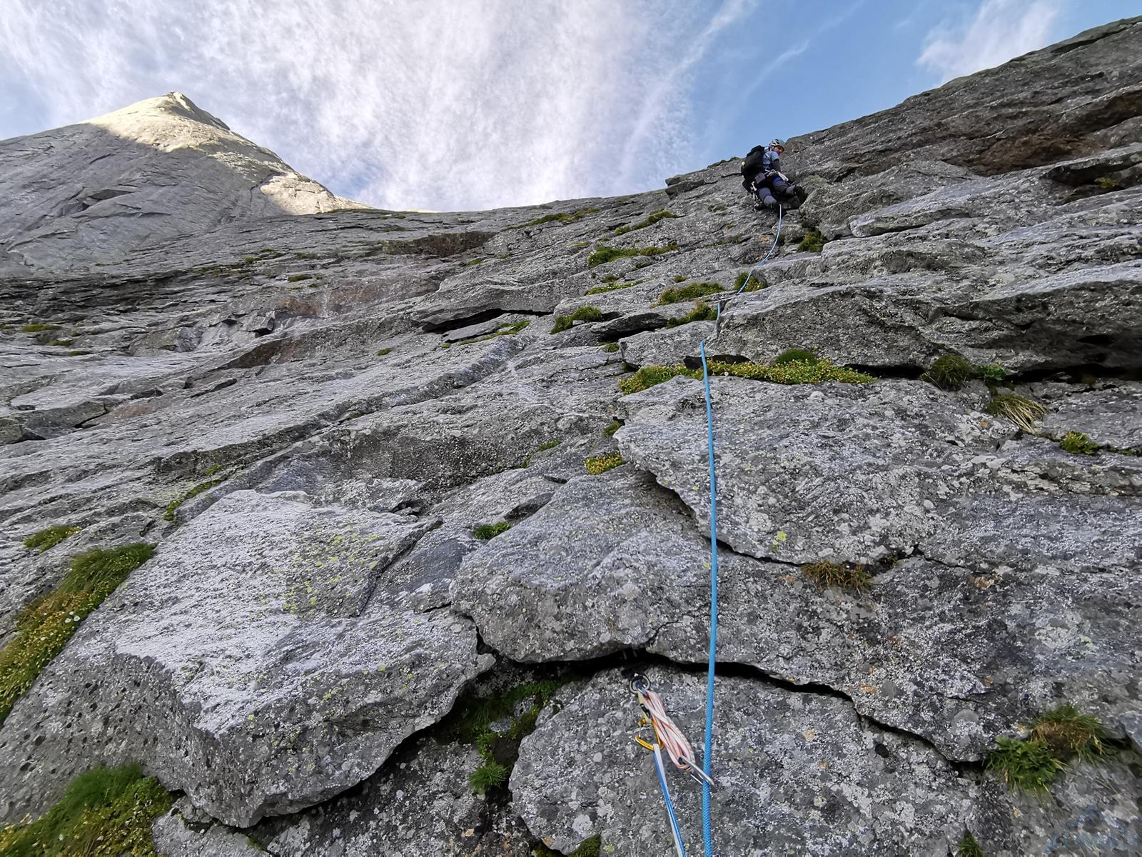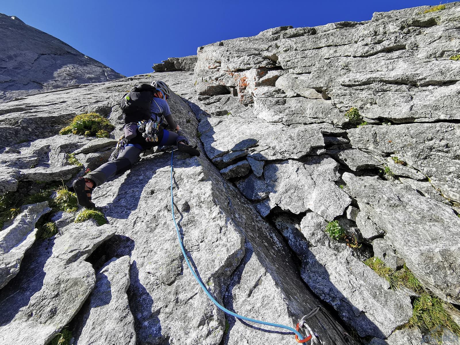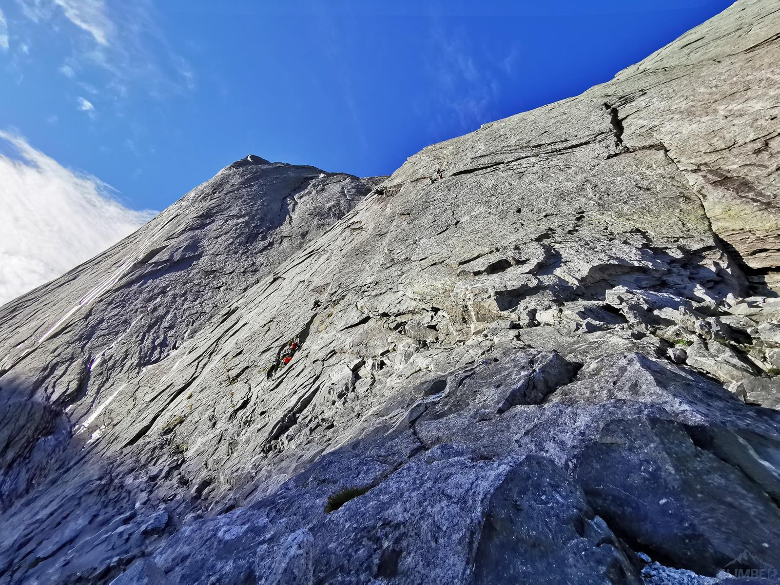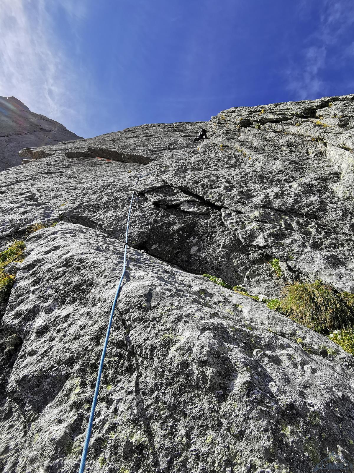 Ze stanowiska po zacięciu dwa kolejne wyciągi (ok. 100 metrów, trudności IV) przechodzimy na lotnej – na początek ciekawa pozioma ryska, później już łatwiej płytami i kominkiem za turnicą do stanowiska przed wyciągiem czwartym. Tutaj czekają nas pierwsze trudności szóstkowe – tarciowy trawers pod okapami (VI+, ok. 40 metrów, sporo haków) i lepiej urzeźbiona płyta na wyciągu kolejnym (ok. VI, 30 metrów). Szósty wyciąg jest bardziej spionowany ale oferuje świetne chwyty wzdłuż rysy, dlatego też trudności są przystępne (VI-). Bardzo przyjemny jest również kolejny odcinek – odstrzelona płyta (V+) i zacięcie, którym po ok. 50 metrach dostajemy się do stanowiska pod dachówkowatymi skałami. Na obu odcinkach w miejscach gdzie nie ma haków, friendy siadają jak złoto 😊. Dalej do wyboru mamy przynajmniej dwa warianty – albo pionowo do góry wzdłuż pęknięć (ok. IV) do Półki Środkowej (Cengia Mediana) i nią spory (ok. 50-metrowy) spacer albo skośnie w lewo depresjami. My zdecydowaliśmy się na drugą opcję i wyszło prawie (jak podaje Bergsteigen) prawie 100 metrów fajnego, nietrudnego (IV-V) wspinania – gdy skończyła się lina, przeszliśmy na lotną i w ten sposób dotarliśmy pod początek trudności nad półkami. Doganiamy dwójkę przewodników z klientami, fundujemy sobie więc dłuższą przerwę. Akurat w tym miejscu na ścianie pojawia się Słońce, nie narzekamy więc i spokojnie czekamy na Mariusza i Młodego, dla którego to debiut na dużej ścianie – stara się więc nie tracić nas z oczy by się gdzieś nie zapchać i kosi aż miło. Ania prosi by trochę zwolnić i pocieszyć się wspinaniem – faktycznie trochę za bardzo goniliśmy i dotychczasowe ok. 400 metrów przeszliśmy w nieco ponad 2 godziny. Wiemy też jednak, że w górnej części ściany czeka nas sporo trudniejszych wyciągów i tam będziemy wolniejsi nie tyle z wyboru, co z konieczności 😉.