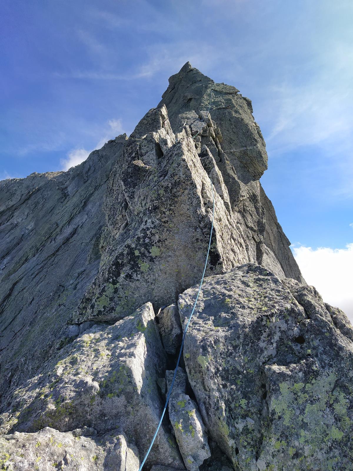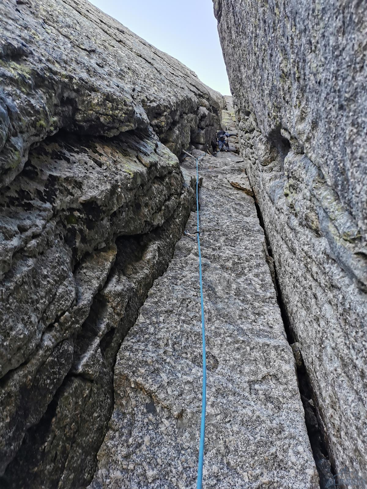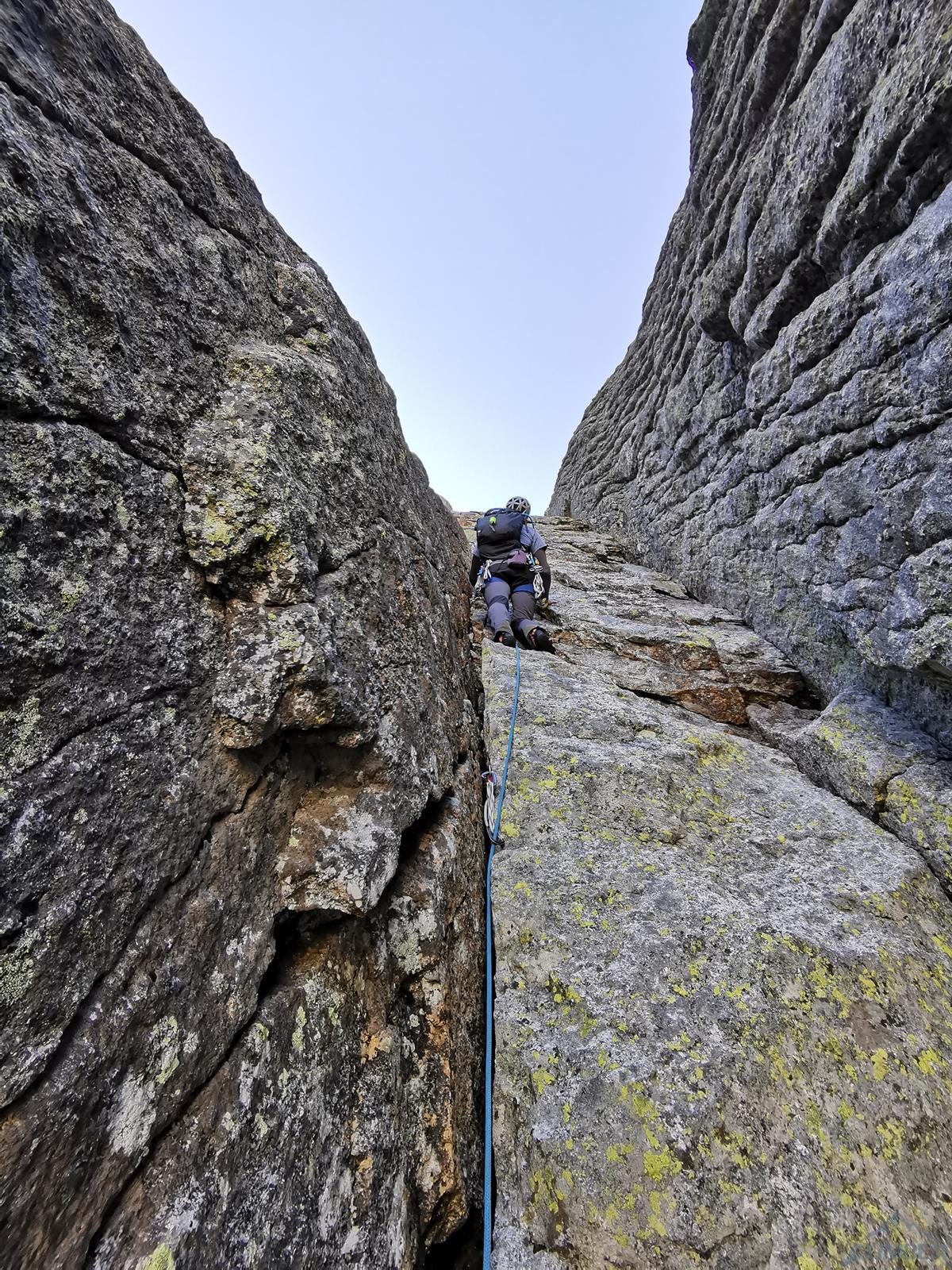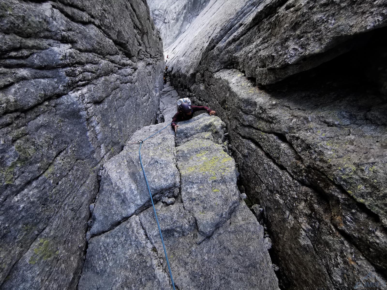 Przed nami trzy wyciągi prowadzące kominami wyjściowymi – pierwszy (V-kształtny) jest znany ze swojego niebanalnego charakteru (mimo niewinnej wyceny V+ lub VI) i opinia ta naszym zdaniem nie jest na wyrost! Jeżeli zdecydujemy się iść środkiem czeka nas mało przyjemne przeciskanie się z plecakiem, jeżeli na zewnątrz – bardzo męczące wspinanie rozpieraczką i ryzykowne prowadzenie asekuracji. Tak czy siak, orka na całego jeżeli ktoś nie trenuje w takich formacjach – mi na prowadzeniu pot cieknie po plecach ciurkiem, Ania na drugiego przeżywa jeszcze cięższe chwile i głośno dzieli się z nami swoimi wrażeniami 😉. Drugi wyciąg w kominach jest zdecydowanie przyjemniejszy – bardzo ładne wspinanie w kwadratowej rynnie i ciekawa przewieszka pod stanowiskiem (ok. V/VI). Na wyciągu 18-tym wychodzimy z komina, po czym ładnym pęknięciem (ok. V+) kierujemy się pionowo do góry i mocnym trawersem w prawo do stanowiska po ok. 50 metrach – nie wchodzimy do zacięcia po lewej od razu. Wyciąg następny zaczynamy ciekawym trawersem po płycie (ok. V, tak sobie z asekuracją) i dopiero po kilku metrach przewijamy się w lewo i już rynną dochodzimy do stanowiska. Przed nami już tylko łatwe zacięcie (IV) i uklamiona ścianka wyprowadzająca nas na grań – ja zatrzymałem się przy spicie, lepiej jest iść jednak 10 metrów dalej do łańcucha.