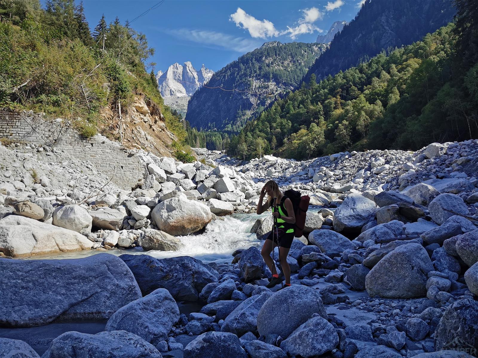Zwijamy bazę i przy piwie w schronisku decydujemy by spróbować zejść starym, zamkniętym szlakiem – zakładamy, że jak się uda zaoszczędzimy dobre 2-3 godziny. Szefowa na pytanie czy damy radę wzrusza ramionami, nie może ani potwierdzić ani zaprzeczyć, jej pracownik daje nam za to wskazówkę by trzymać się blisko rzeki. Samo zejście do doliny idzie nam bardzo szybko i jesteśmy dobrej myśli, na dodatek idziemy urokliwym, dzikim obecnie terenem – rozmiary szkód poczynionych przez obrywa na Piz Cengalo robią wrażenie. Miny szybko nam jednak rzedną, gdy okazuje się, że teren wzdłuż rzeki stopniowo zawęża się i w końcu odcina drogę, co zmusza nas do trawersowania stromymi zboczami do lasu, którym dopiero pod sam koniec docieramy do niezniszczonego fragmentu szlaku. Wyboru tego wariantu zejściowego nie polecamy (zeszło nam 4 godziny), a już podejścia póki co sobie nie wyobrażam – nie mówiąc już o tym co byłoby dwa lata temu jeżeli próbowalibyśmy „na dziko” iść pod Badyla, gdy teren wyglądał dużo gorzej. Na parkingu żegnamy się z kolegami, którzy wracają do Polski, my natomiast obieramy kierunek na Ligurię – trzeba odpocząć od gór i poplażować, mamy na to aż całe dwa dni 😊.