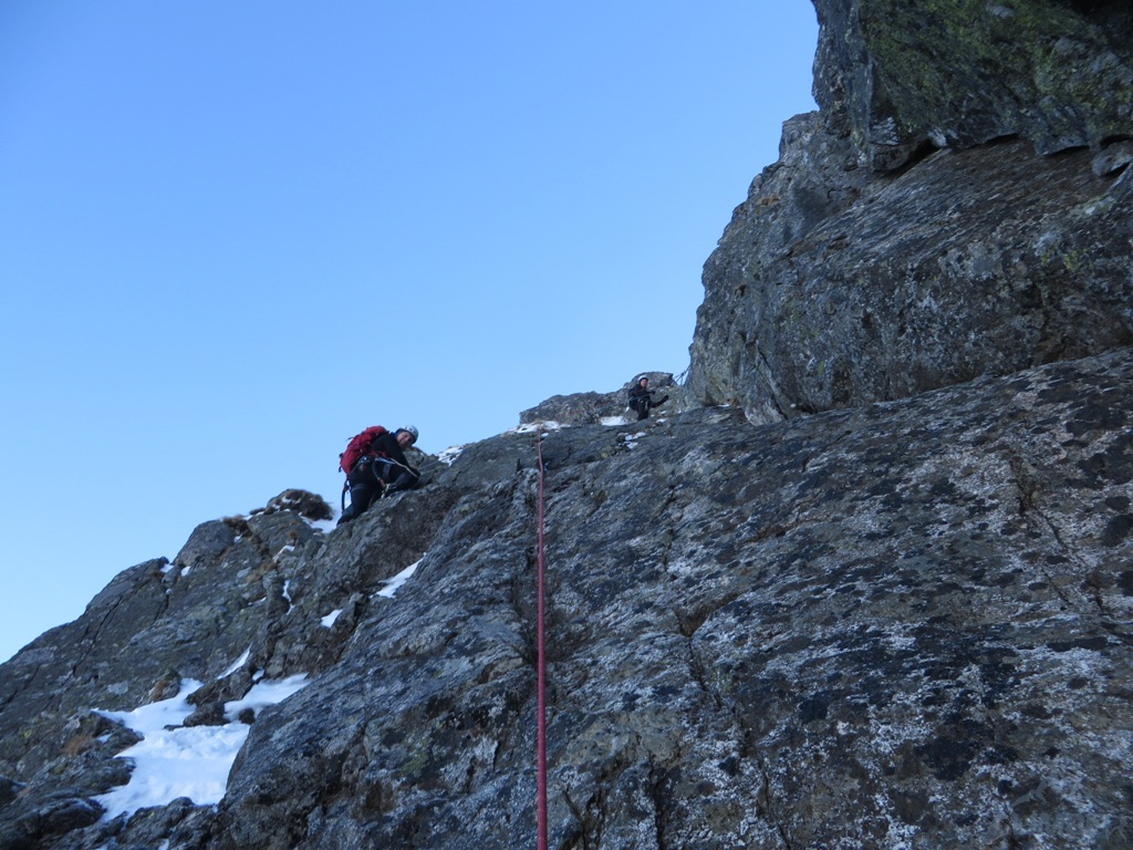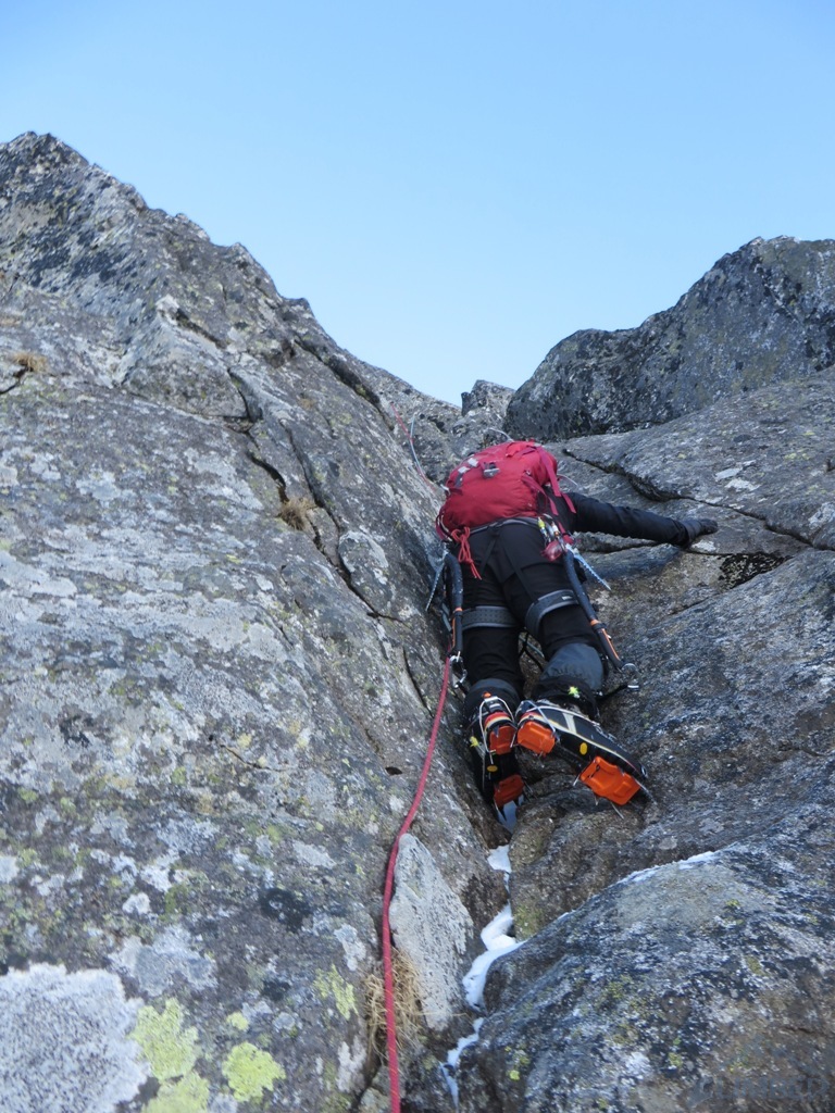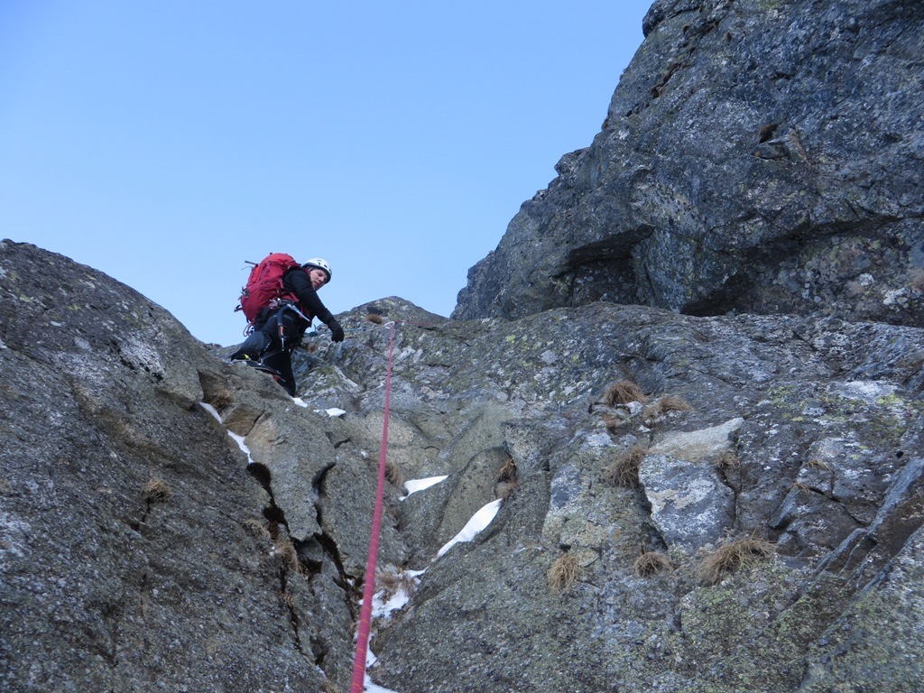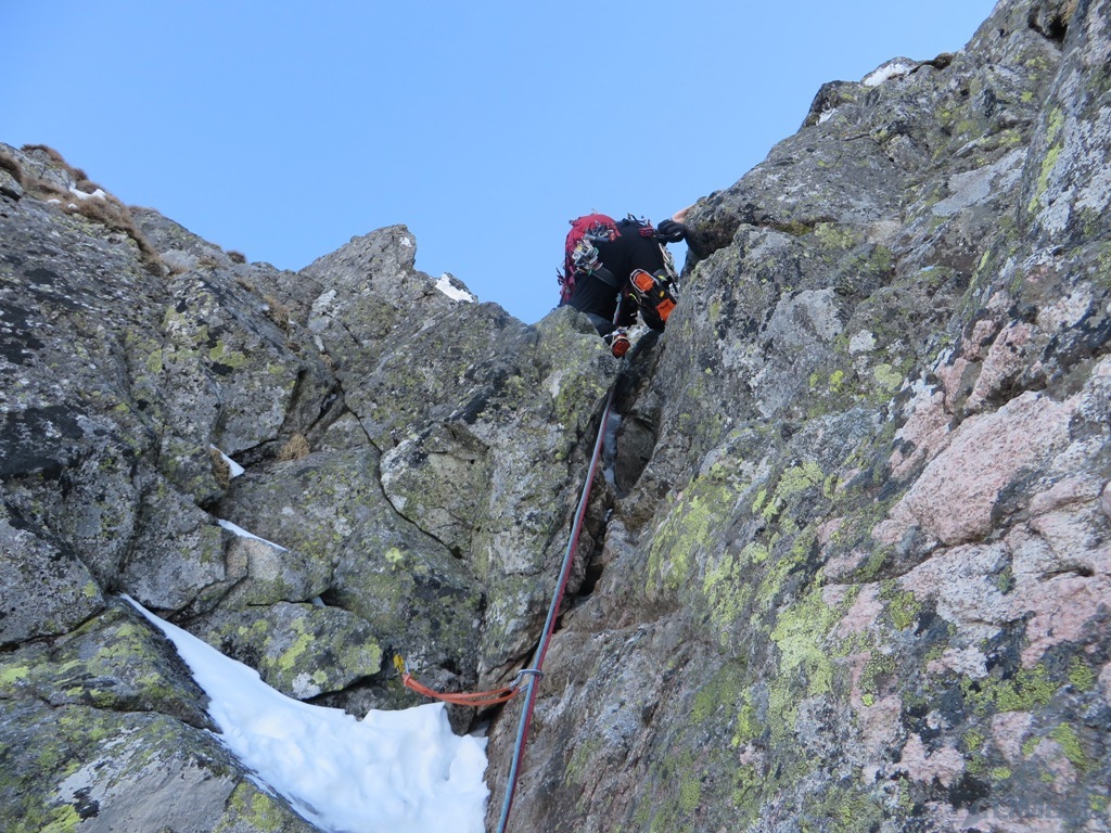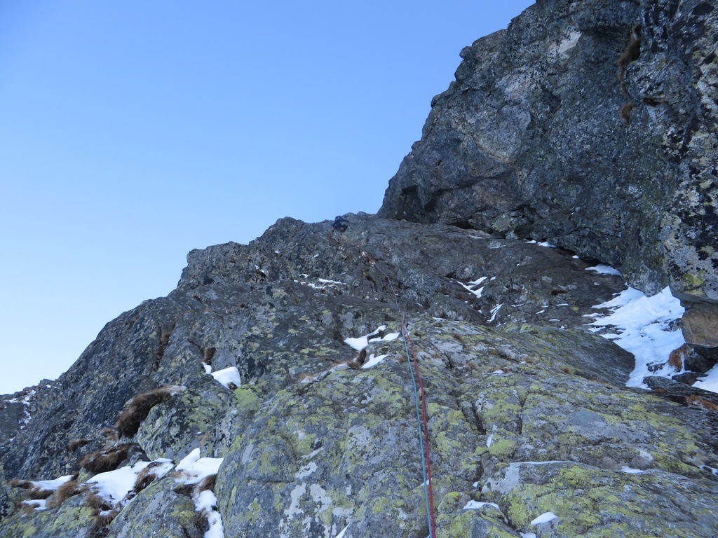 Wyciąg okazuje się faktycznie wymagający i spędzamy na nim dużo czasu, na szczęście później szybko nadrabiamy i kolejne trzy wyciągi praktycznie przebiegamy. Przejmuję prowadzenie od Jacka i z uśmiechem na ustach robię kolejne wyciągi – pogoda jest piękna, warunki bardzo dobre, a wspinanie przyjemne i niestresujące. Więcej czasu spędzamy tylko pod kominem wyjściowym – trochę niepotrzebnie kombinujemy ze zmianą prowadzenia – w końcu jednak wracamy na właściwe tory i szybko melduję się przy stanowisku końcowym na polach podszczytowych. Chowamy jedną żyłę i zasuwamy na wierzchołek na lotnej. Potwierdza się to co słyszałem wcześniej – przejście Filara daje dużo frajdy, w dobrych warunkach droga jest naprawdę bardzo przyjemna.
