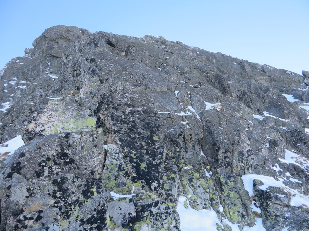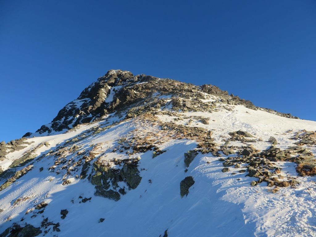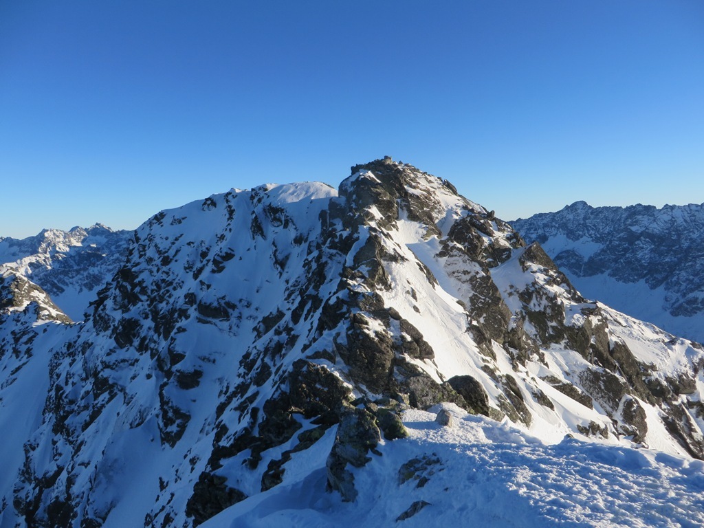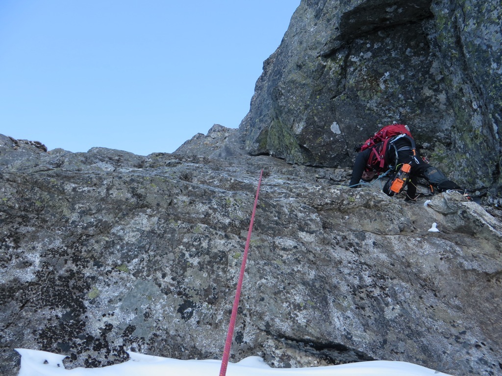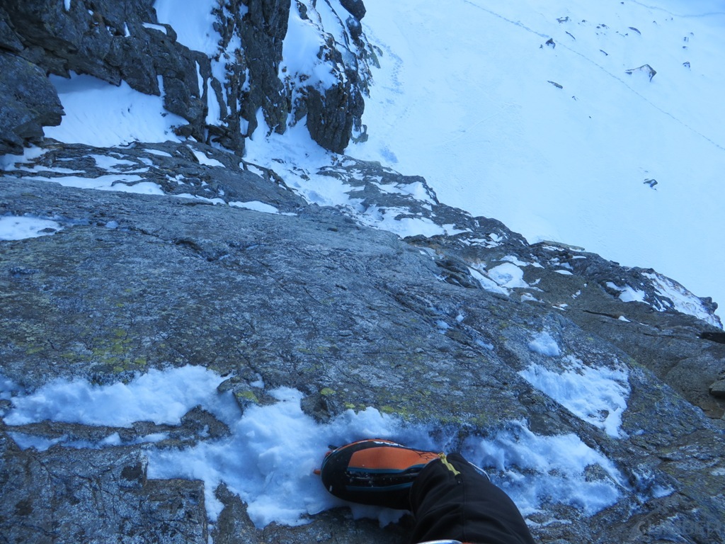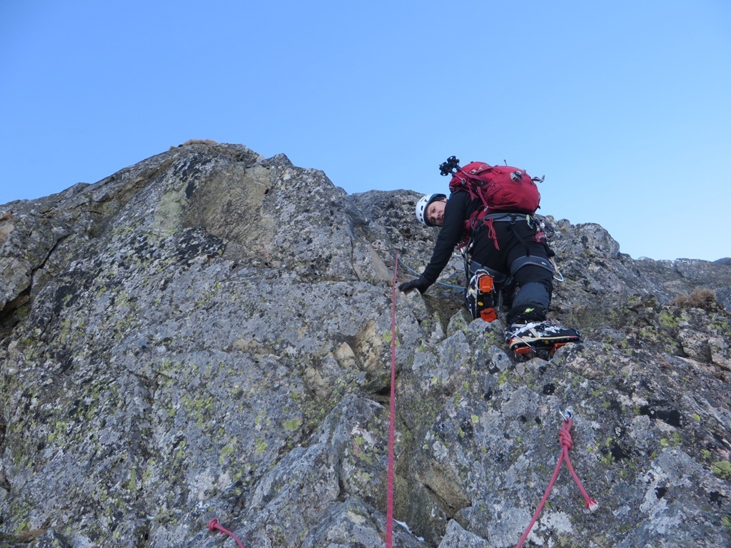 Wyciąg okazuje się faktycznie wymagający i spędzamy na nim dużo czasu, na szczęście później szybko nadrabiamy i kolejne trzy wyciągi praktycznie przebiegamy. Przejmuję prowadzenie od Jacka i z uśmiechem na ustach robię kolejne wyciągi – pogoda jest piękna, warunki bardzo dobre, a wspinanie przyjemne i niestresujące. Więcej czasu spędzamy tylko pod kominem wyjściowym – trochę niepotrzebnie kombinujemy ze zmianą prowadzenia – w końcu jednak wracamy na właściwe tory i szybko melduję się przy stanowisku końcowym na polach podszczytowych. Chowamy jedną żyłę i zasuwamy na wierzchołek na lotnej. Potwierdza się to co słyszałem wcześniej – przejście Filara daje dużo frajdy, w dobrych warunkach droga jest naprawdę bardzo przyjemna.