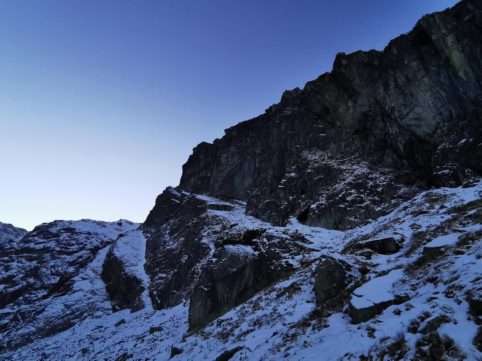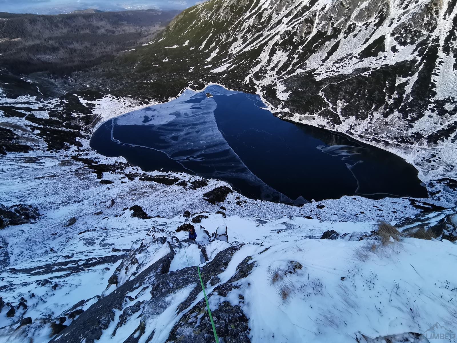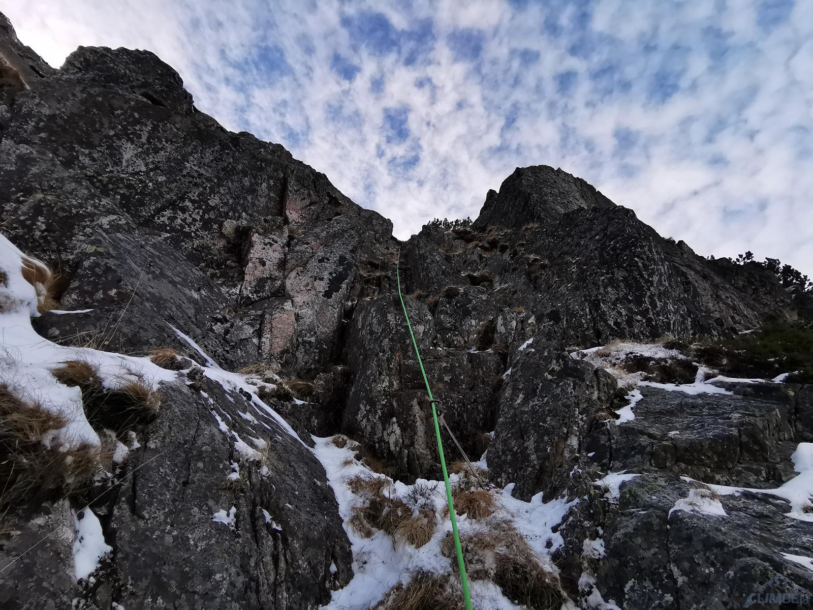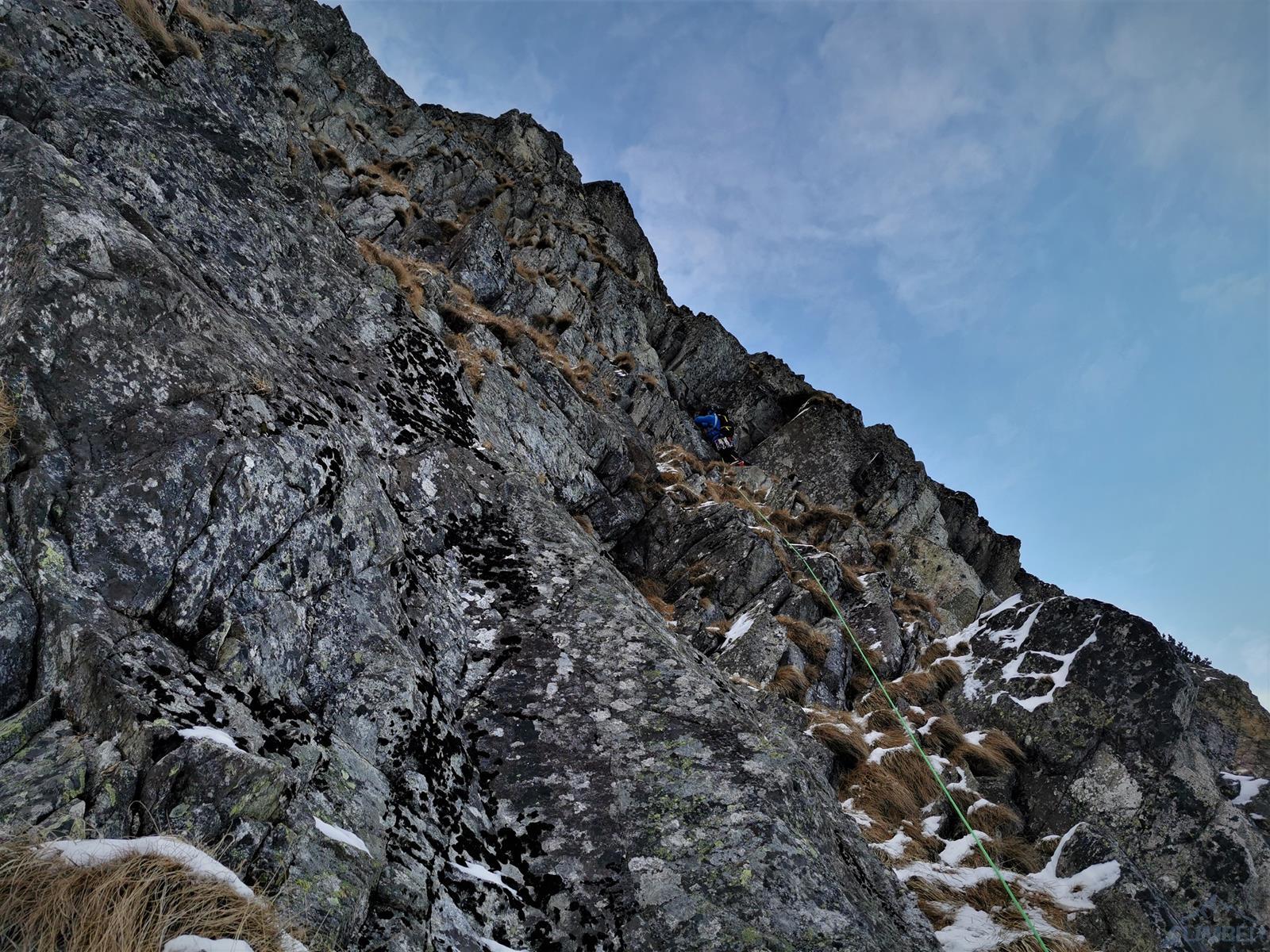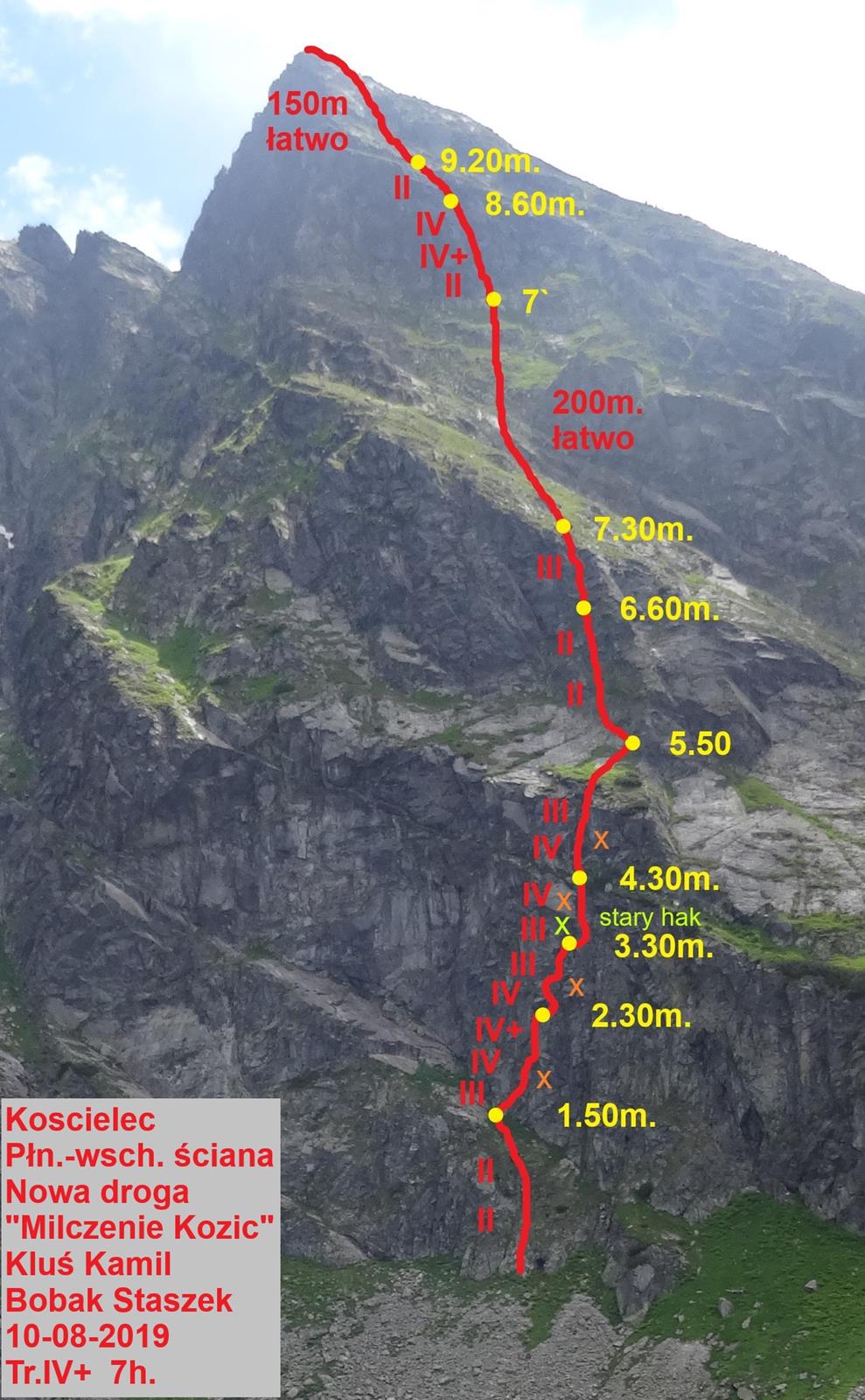 Na pierwszą drogę w sezonie zimowym wybieramy nową (powstałą w 2019) linię rozwiązującą całą północno-wschodnią ścianę Kościelca. Deniwelacja jaką pokonujemy to około 400 metrów, długość drogi to z kolei około 700 metrów – połowa z tego to łatwy teren, który mamy do przejścia pomiędzy trzema spiętrzeniami skalnymi oraz po ostatnim z nich. Dzięki temu jest to dobra propozycja na „rozruch”, szczególnie biorąc pod uwagę szybkie i łatwe dojście oraz bezpieczne zejście szlakiem. Przy dobrych warunkach droga będzie na pewno przystępniejsza, przy brak podkładu śnieżnego oraz suchych trawach też da się ją robić, trzeba tylko zarezerwować trochę więcej czasu i wspinać się ostrożniej – tym bardziej, że nie ma gotowych stanowisk czy stałych haków w trudnościach.