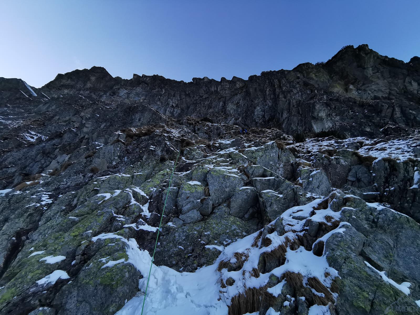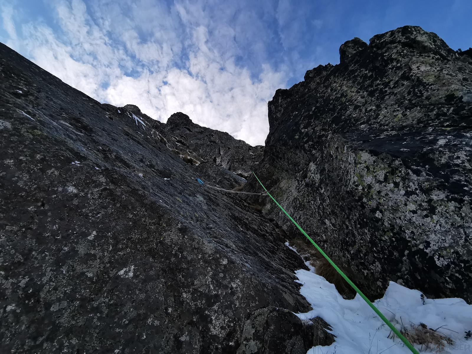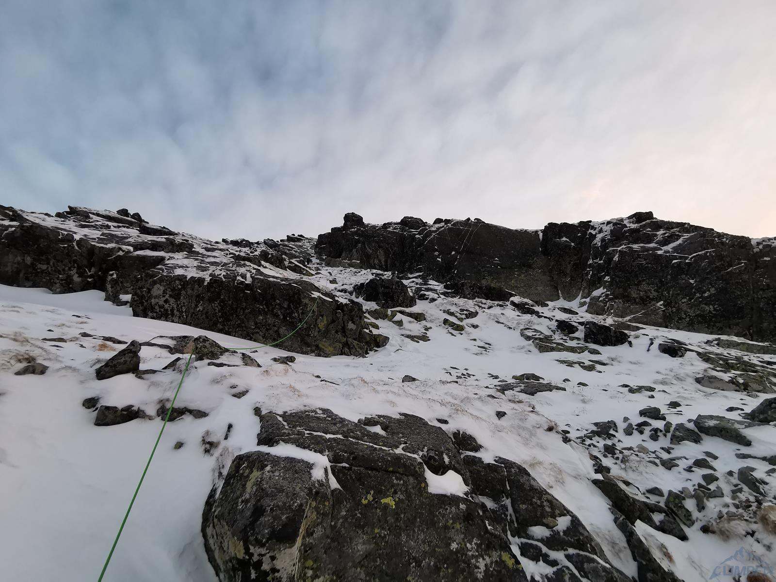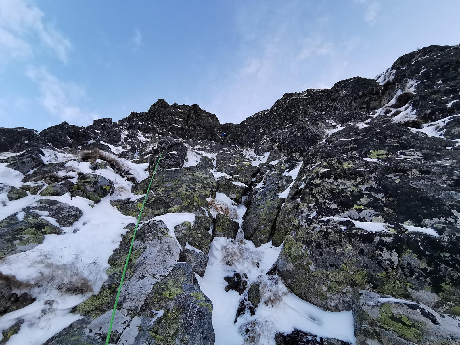 Po wyjściu w łatwy teren idziemy w kierunku drugiego spiętrzenia, które pokonujemy po prawej stronie – po lewej widoczny będzie przecinający ścianę zachód z drogi Tort Makowy. Według opisu wspinamy się wzdłuż filarka i przy smreczku wchodzimy w krótkie zaciątko (M3) z którego wychodzimy w łatwy teren – my poszliśmy tutaj trochę bardziej na prawo ale trudności były bardzo zbliżone. Dalej czeka nas około 200 metrów podejścia pod ścianę szczytową – kierujemy się w stronę wyraźnej depresji po jej prawej stronie, stanowisko zakładamy tuż pod nią. Kolejny wyciąg (60 metrów gdy robiony w całości) przy braku dobrego śniegu jest kluczowy – zaczynamy po trawkach pomiędzy skałami i docieramy do progu w żlebie, gdzie czeka nas krótka ale przewieszona ścianka z rysą (gdy sucho ok. M5). Po wyjściu z trudności czeka nas jeszcze kolejny próg (M4) i łatwa rynna, po której przejściu robimy stanowisko. Z rynny wydostajemy się depresją w lewo (M2), następnie kontynuujemy bez trudności w kierunku szczytu – albo załupą wprost (o ile jest dobry śnieg) albo bliżej grani po lewej. Docieramy do szlaku ok. 50 metrów poniżej szczytu, warto się więc rozwiązać i poświęcić dodatkowe 5 minut na postawienie kropki nad i. Na drodze zeszło nam 6 godzin, na pewno jednak przy dobrych warunkach da się ją zrobić szybciej, do tego nie pomogła moja choroba (Michał stanął na wysokości zadania i poprowadził wszystkie trudniejsze odcinki) oraz niezdarne i niepewne ruchy, charakterystyczne dla pierwszego wspinu w sezonie 😉.