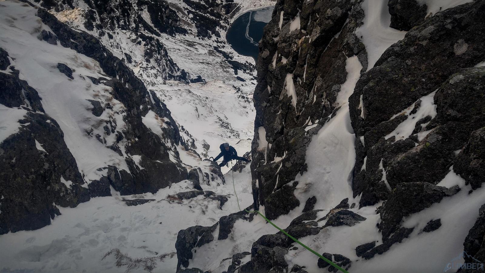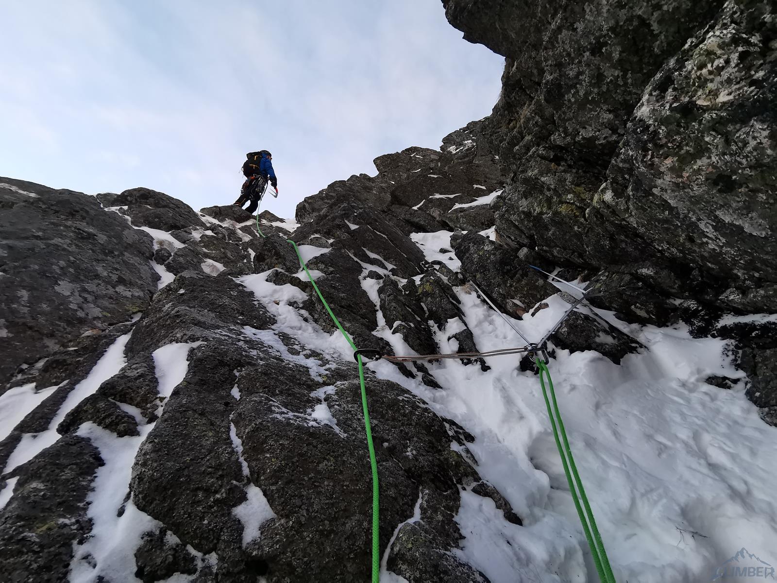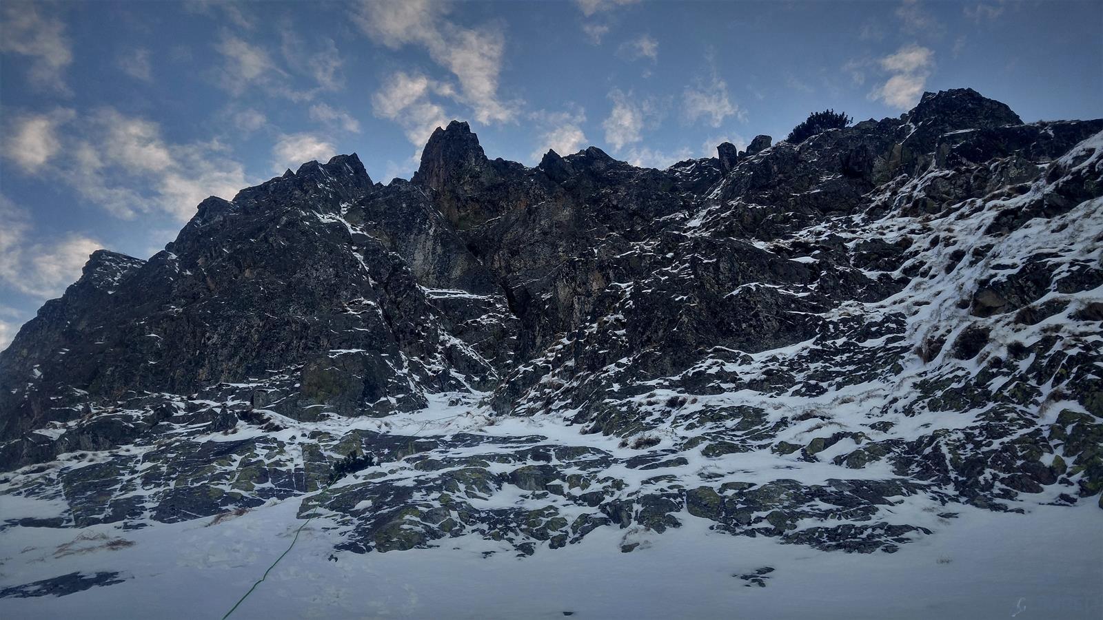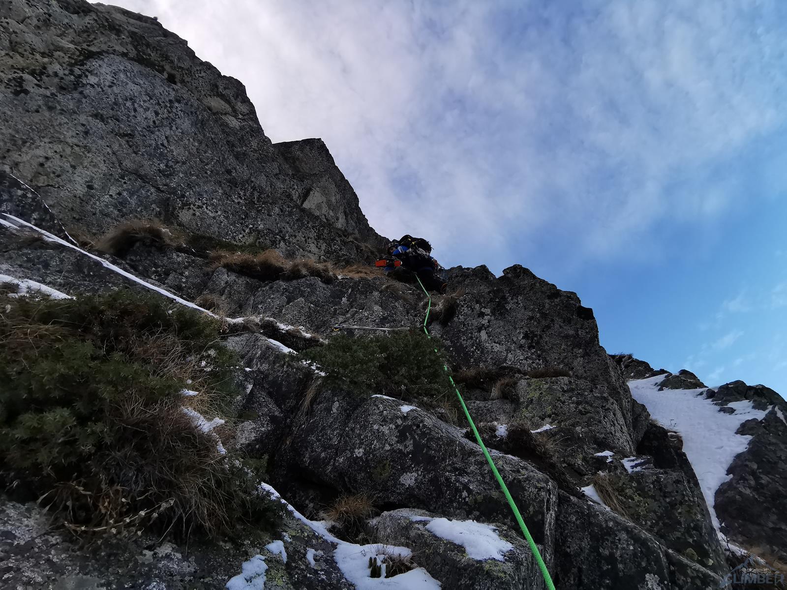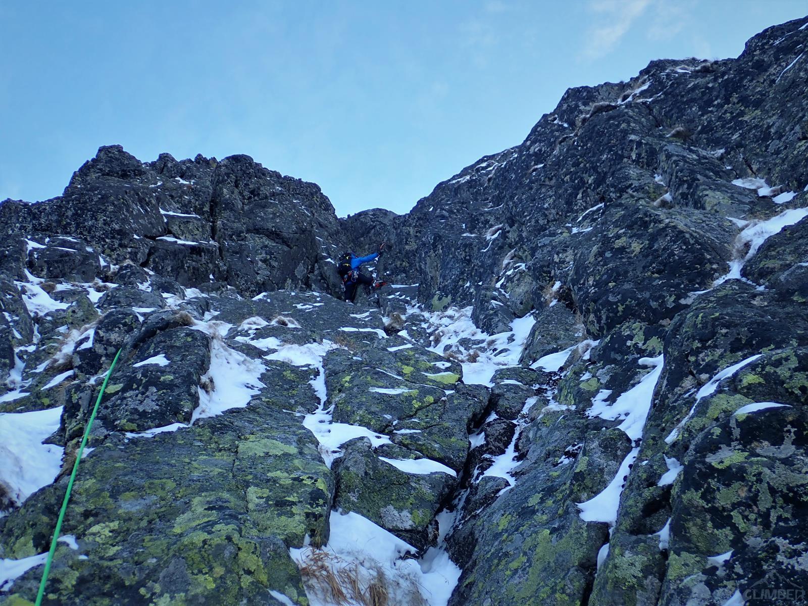 Po wyjściu w łatwy teren idziemy w kierunku drugiego spiętrzenia, które pokonujemy po prawej stronie – po lewej widoczny będzie przecinający ścianę zachód z drogi Tort Makowy. Według opisu wspinamy się wzdłuż filarka i przy smreczku wchodzimy w krótkie zaciątko (M3) z którego wychodzimy w łatwy teren – my poszliśmy tutaj trochę bardziej na prawo ale trudności były bardzo zbliżone. Dalej czeka nas około 200 metrów podejścia pod ścianę szczytową – kierujemy się w stronę wyraźnej depresji po jej prawej stronie, stanowisko zakładamy tuż pod nią. Kolejny wyciąg (60 metrów gdy robiony w całości) przy braku dobrego śniegu jest kluczowy – zaczynamy po trawkach pomiędzy skałami i docieramy do progu w żlebie, gdzie czeka nas krótka ale przewieszona ścianka z rysą (gdy sucho ok. M5). Po wyjściu z trudności czeka nas jeszcze kolejny próg (M4) i łatwa rynna, po której przejściu robimy stanowisko. Z rynny wydostajemy się depresją w lewo (M2), następnie kontynuujemy bez trudności w kierunku szczytu – albo załupą wprost (o ile jest dobry śnieg) albo bliżej grani po lewej. Docieramy do szlaku ok. 50 metrów poniżej szczytu, warto się więc rozwiązać i poświęcić dodatkowe 5 minut na postawienie kropki nad i. Na drodze zeszło nam 6 godzin, na pewno jednak przy dobrych warunkach da się ją zrobić szybciej, do tego nie pomogła moja choroba (Michał stanął na wysokości zadania i poprowadził wszystkie trudniejsze odcinki) oraz niezdarne i niepewne ruchy, charakterystyczne dla pierwszego wspinu w sezonie 😉.