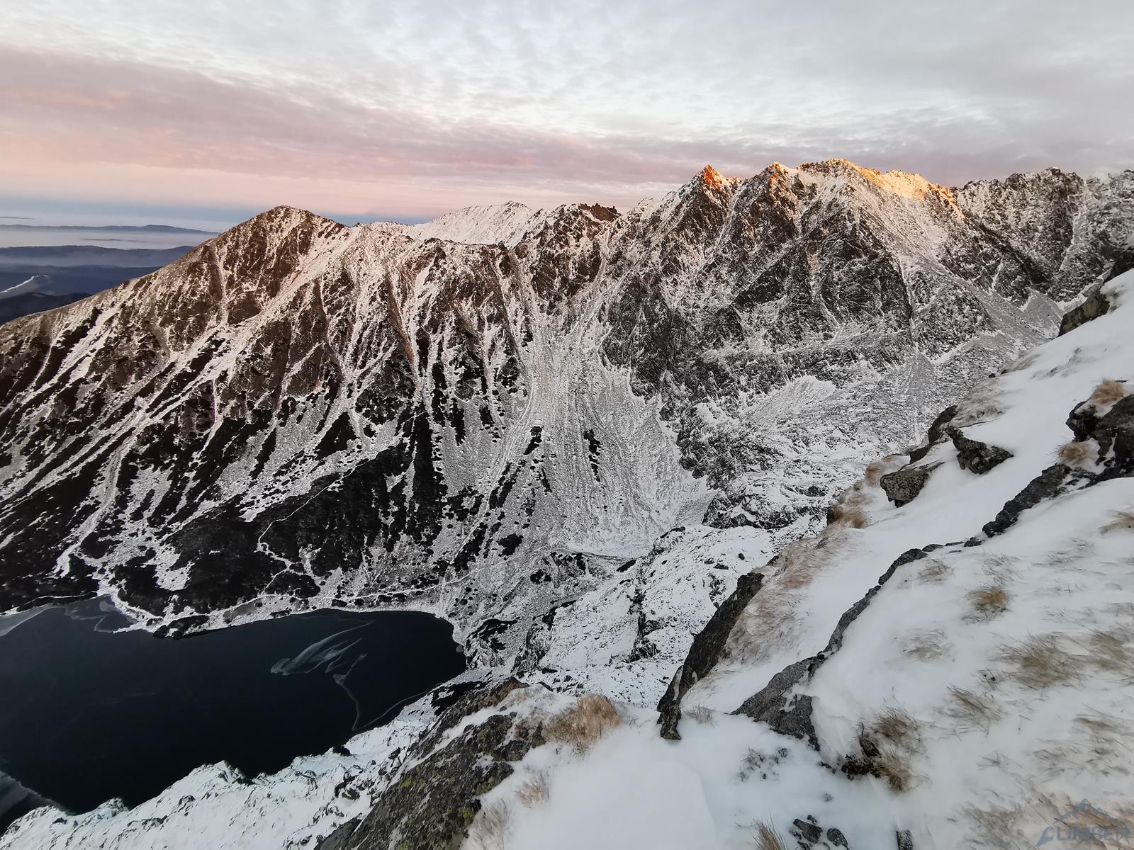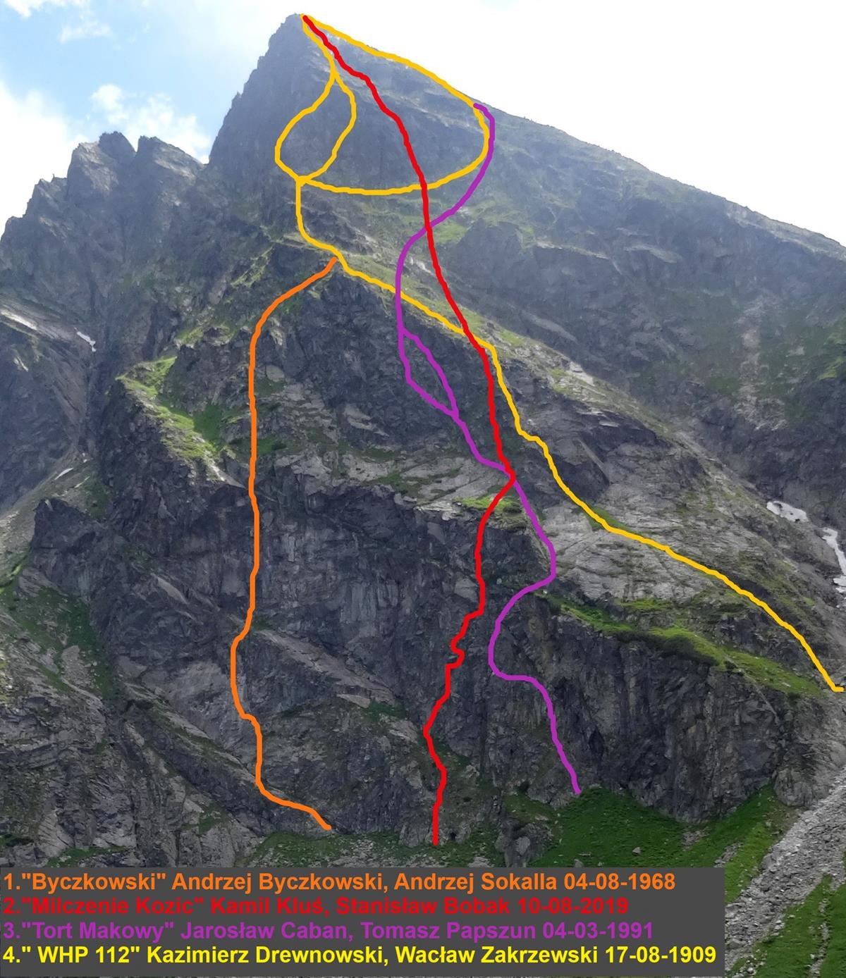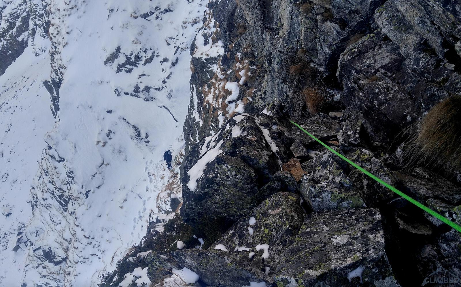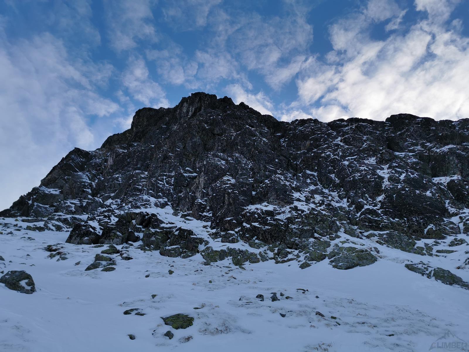 Po wyjściu w łatwy teren idziemy w kierunku drugiego spiętrzenia, które pokonujemy po prawej stronie – po lewej widoczny będzie przecinający ścianę zachód z drogi Tort Makowy. Według opisu wspinamy się wzdłuż filarka i przy smreczku wchodzimy w krótkie zaciątko (M3) z którego wychodzimy w łatwy teren – my poszliśmy tutaj trochę bardziej na prawo ale trudności były bardzo zbliżone. Dalej czeka nas około 200 metrów podejścia pod ścianę szczytową – kierujemy się w stronę wyraźnej depresji po jej prawej stronie, stanowisko zakładamy tuż pod nią. Kolejny wyciąg (60 metrów gdy robiony w całości) przy braku dobrego śniegu jest kluczowy – zaczynamy po trawkach pomiędzy skałami i docieramy do progu w żlebie, gdzie czeka nas krótka ale przewieszona ścianka z rysą (gdy sucho ok. M5). Po wyjściu z trudności czeka nas jeszcze kolejny próg (M4) i łatwa rynna, po której przejściu robimy stanowisko. Z rynny wydostajemy się depresją w lewo (M2), następnie kontynuujemy bez trudności w kierunku szczytu – albo załupą wprost (o ile jest dobry śnieg) albo bliżej grani po lewej. Docieramy do szlaku ok. 50 metrów poniżej szczytu, warto się więc rozwiązać i poświęcić dodatkowe 5 minut na postawienie kropki nad i. Na drodze zeszło nam 6 godzin, na pewno jednak przy dobrych warunkach da się ją zrobić szybciej, do tego nie pomogła moja choroba (Michał stanął na wysokości zadania i poprowadził wszystkie trudniejsze odcinki) oraz niezdarne i niepewne ruchy, charakterystyczne dla pierwszego wspinu w sezonie 😉.