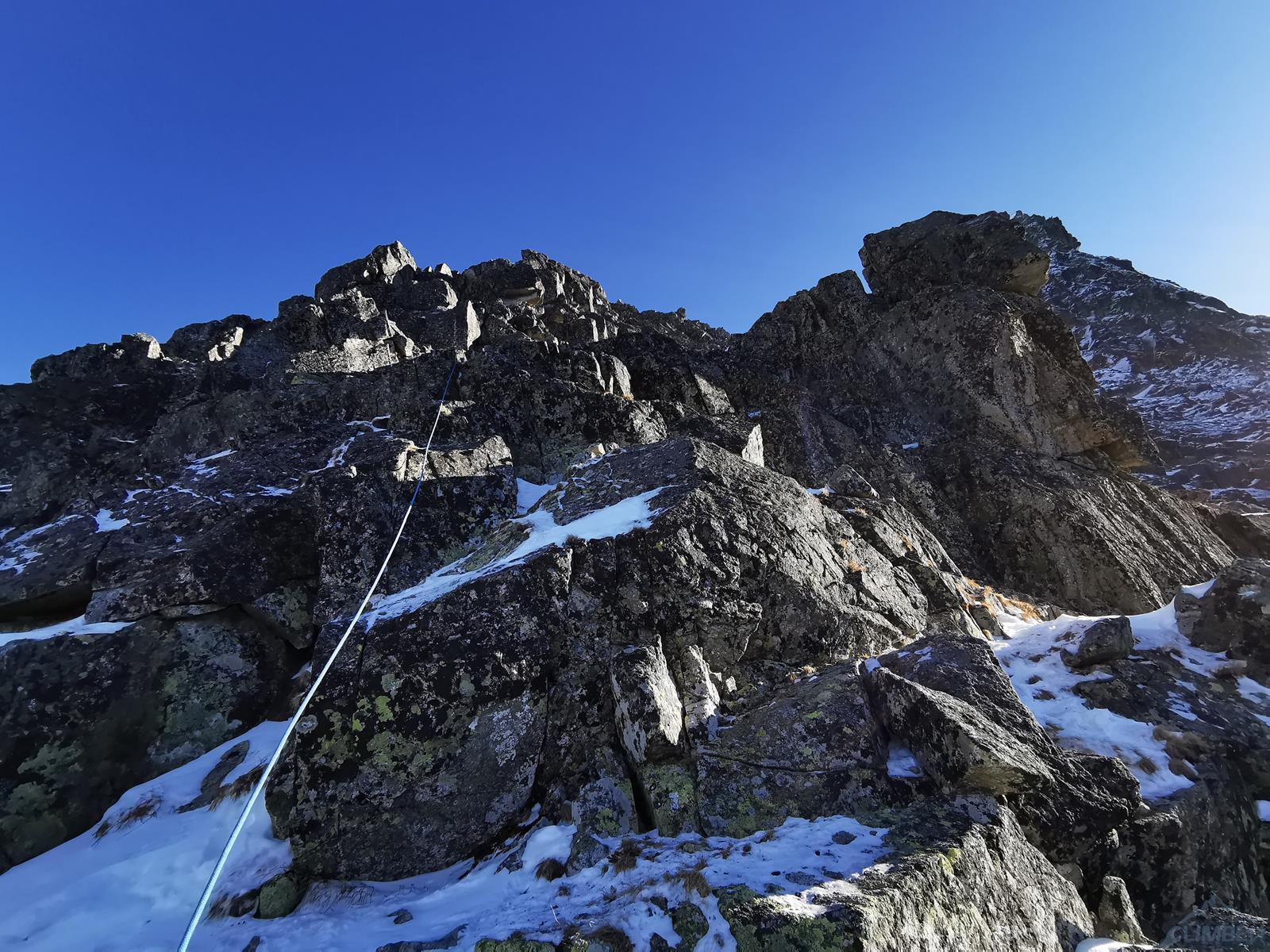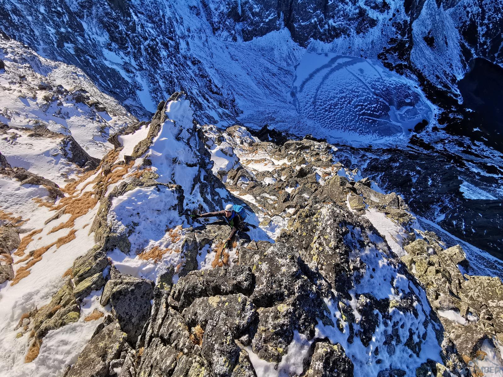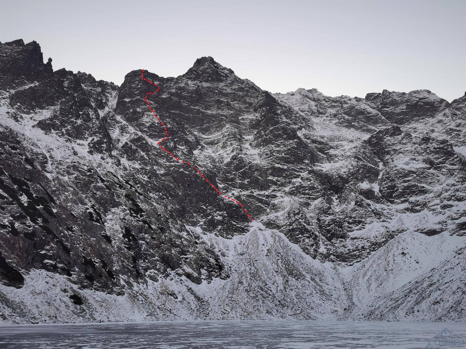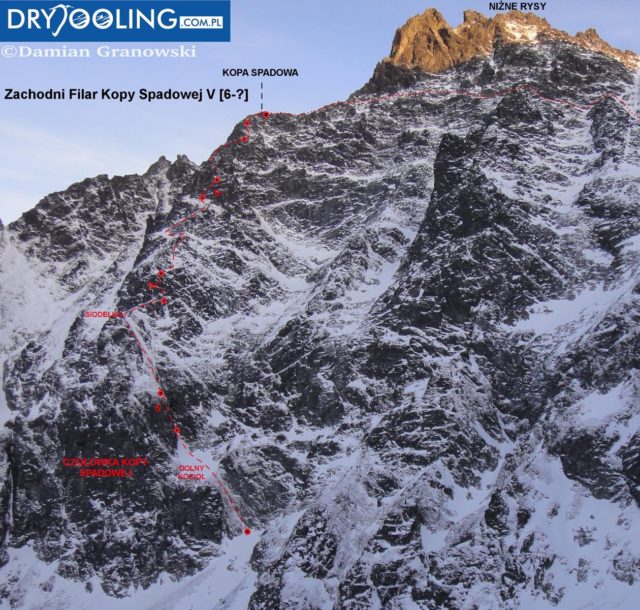 Filar Kopy Spadowej to ładna alpiniada z czterema trudniejszymi odcinkami skalnymi – z powodu dość skomplikowanego zejścia warto wybrać się na nią w dogodnych warunkach. Bardzo mała ilość śniegu oraz ograniczone możliwości działania (Słowacja zamknięta z powodu Covida) spowodowały, że w grudniu 2020 drogą zainteresowało się kilka zespołów 😉. Mimo krótkiego dnia i konieczności działania car-to-car (zamknięte schronisko), decydujemy się w 4-osobowym składzie również na nią wybrać – wybór okazuje się słuszny, linia jest ciekawa, a nieprzyjemne zejście wynagradzają kapitalne widoki na grań Morskiego Oka wraz z jej północnym murem. Zdecydowanie polecam.