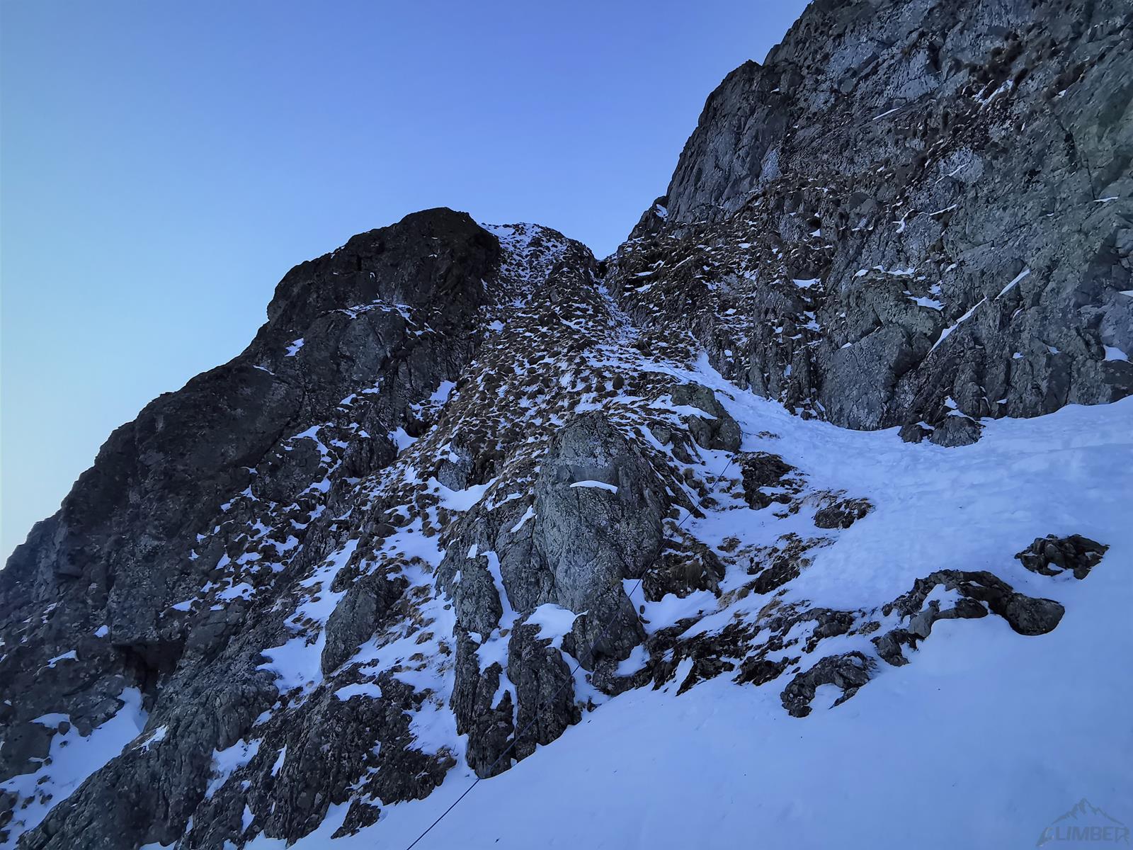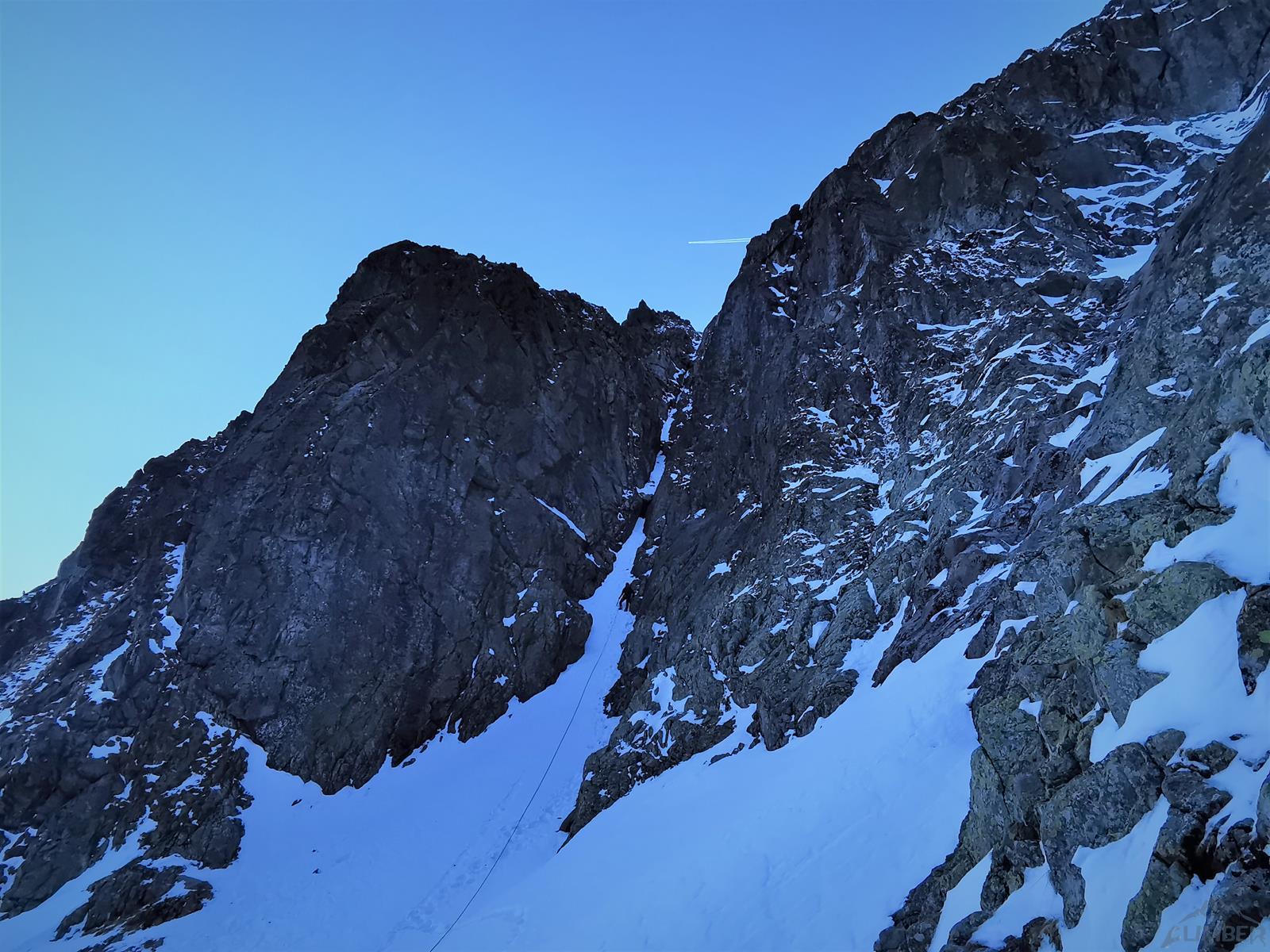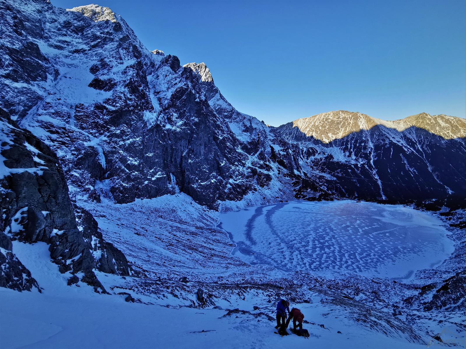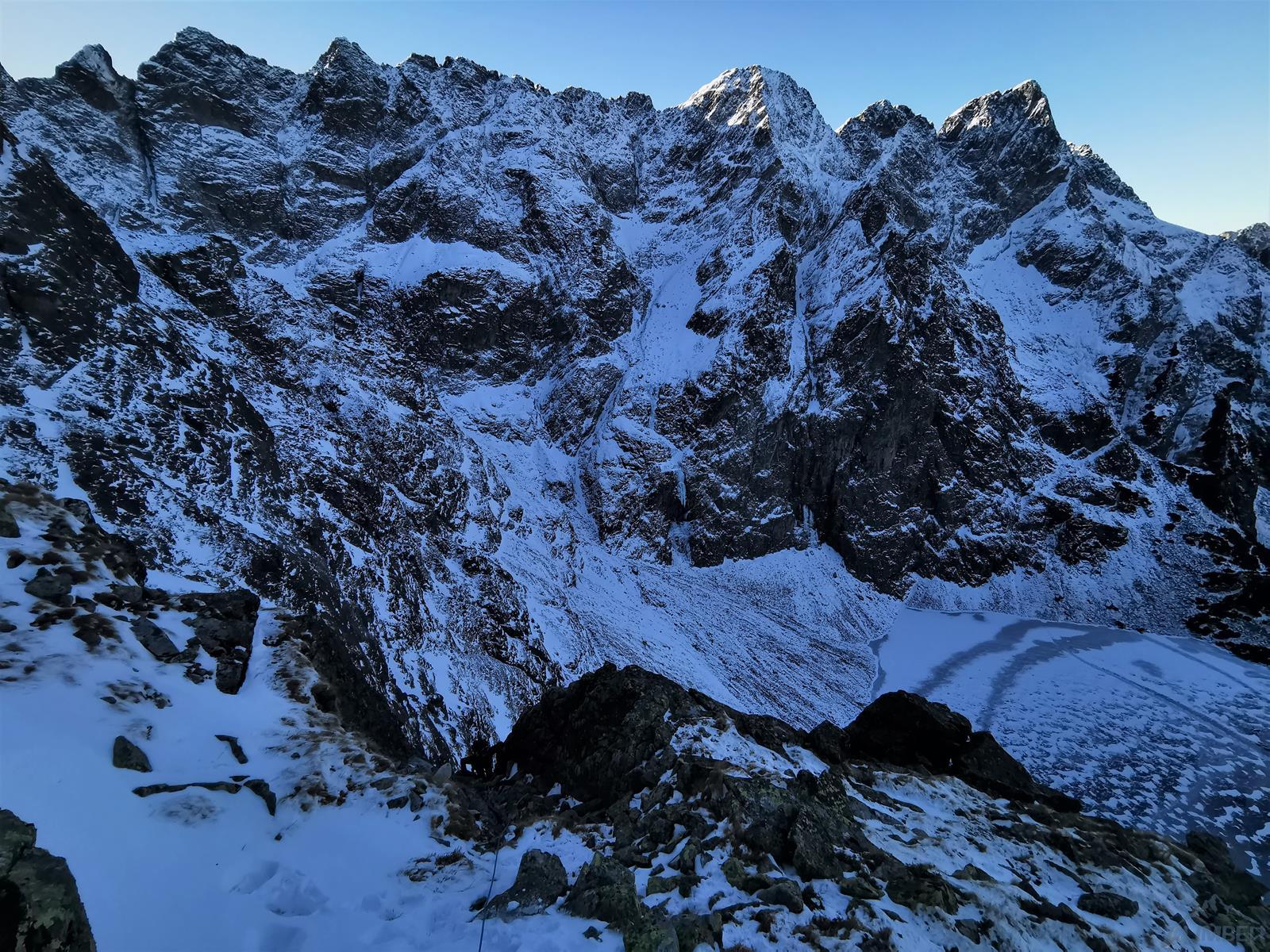 Filar Kopy Spadowej to ładna alpiniada z czterema trudniejszymi odcinkami skalnymi – z powodu dość skomplikowanego zejścia warto wybrać się na nią w dogodnych warunkach. Bardzo mała ilość śniegu oraz ograniczone możliwości działania (Słowacja zamknięta z powodu Covida) spowodowały, że w grudniu 2020 drogą zainteresowało się kilka zespołów 😉. Mimo krótkiego dnia i konieczności działania car-to-car (zamknięte schronisko), decydujemy się w 4-osobowym składzie również na nią wybrać – wybór okazuje się słuszny, linia jest ciekawa, a nieprzyjemne zejście wynagradzają kapitalne widoki na grań Morskiego Oka wraz z jej północnym murem. Zdecydowanie polecam.