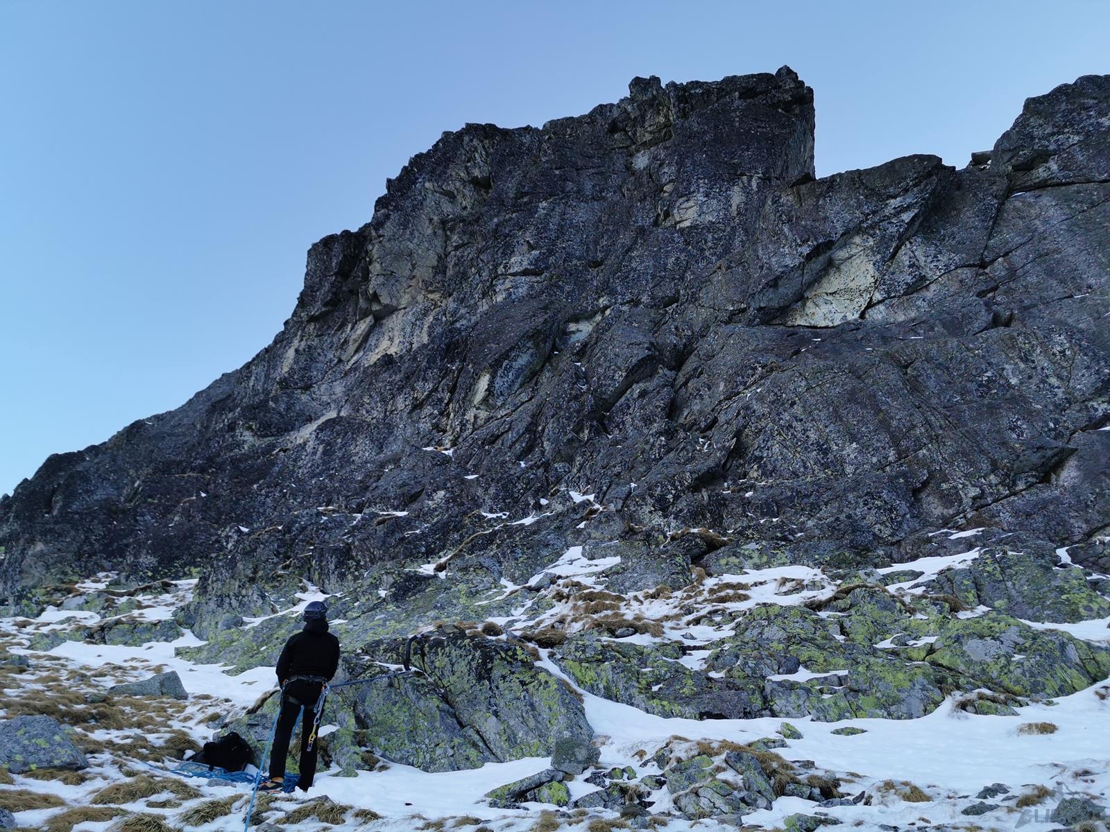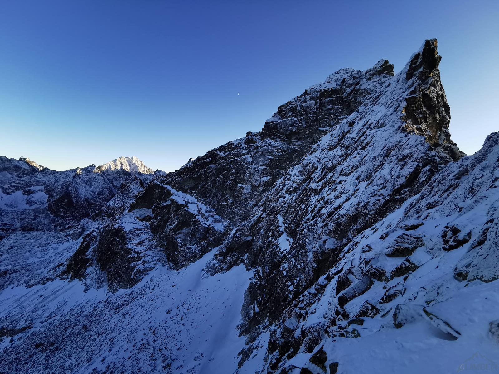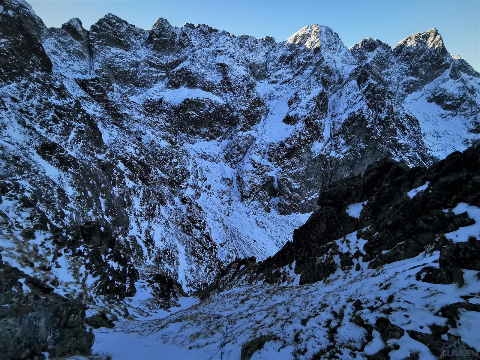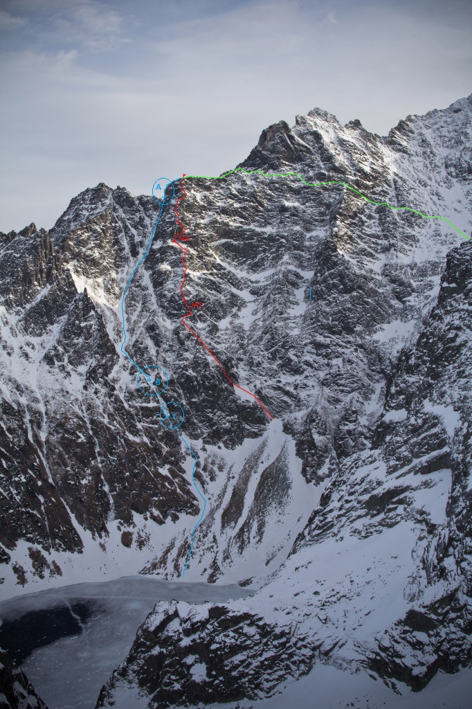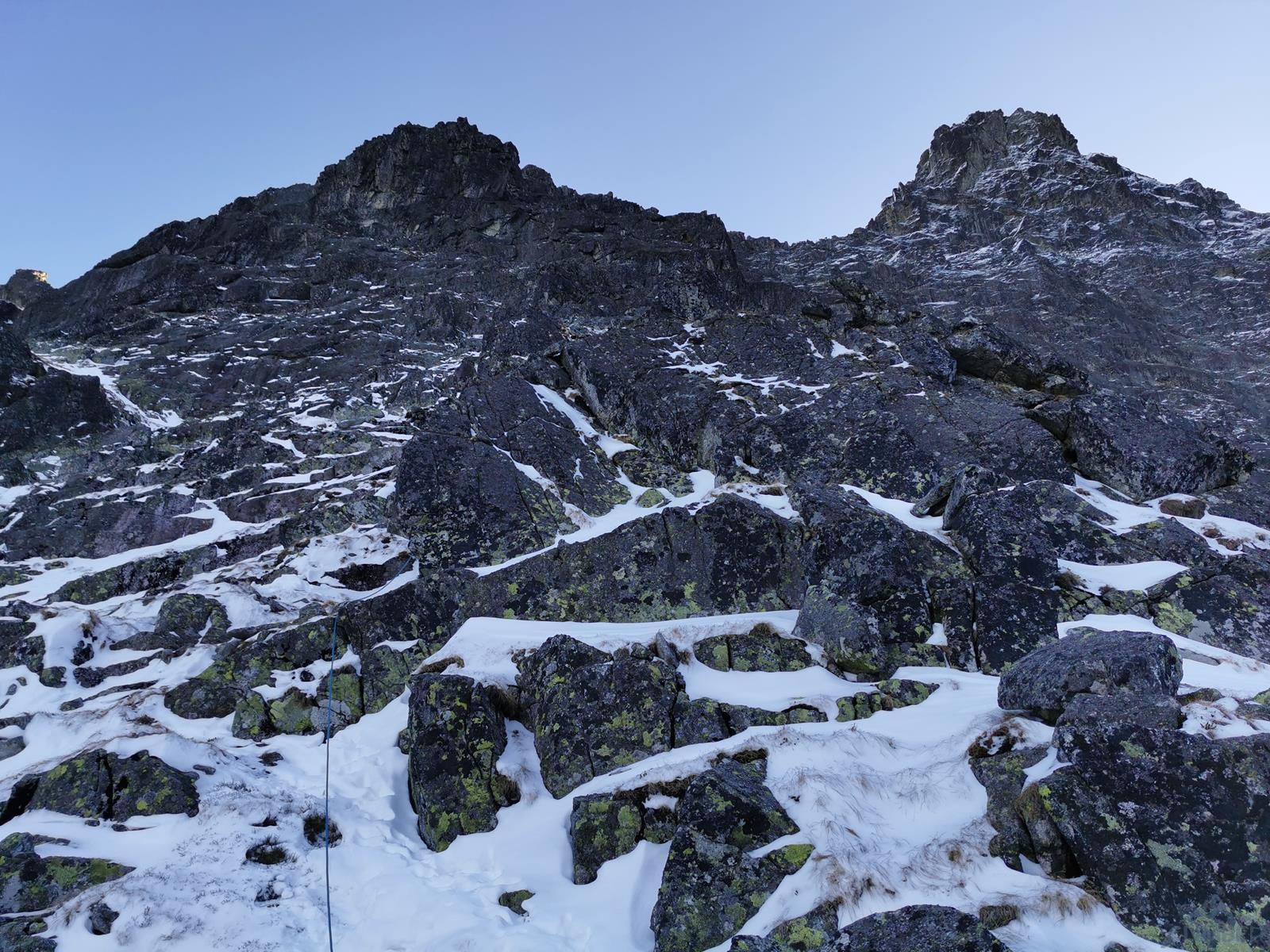 Filar Kopy Spadowej to ładna alpiniada z czterema trudniejszymi odcinkami skalnymi – z powodu dość skomplikowanego zejścia warto wybrać się na nią w dogodnych warunkach. Bardzo mała ilość śniegu oraz ograniczone możliwości działania (Słowacja zamknięta z powodu Covida) spowodowały, że w grudniu 2020 drogą zainteresowało się kilka zespołów 😉. Mimo krótkiego dnia i konieczności działania car-to-car (zamknięte schronisko), decydujemy się w 4-osobowym składzie również na nią wybrać – wybór okazuje się słuszny, linia jest ciekawa, a nieprzyjemne zejście wynagradzają kapitalne widoki na grań Morskiego Oka wraz z jej północnym murem. Zdecydowanie polecam.