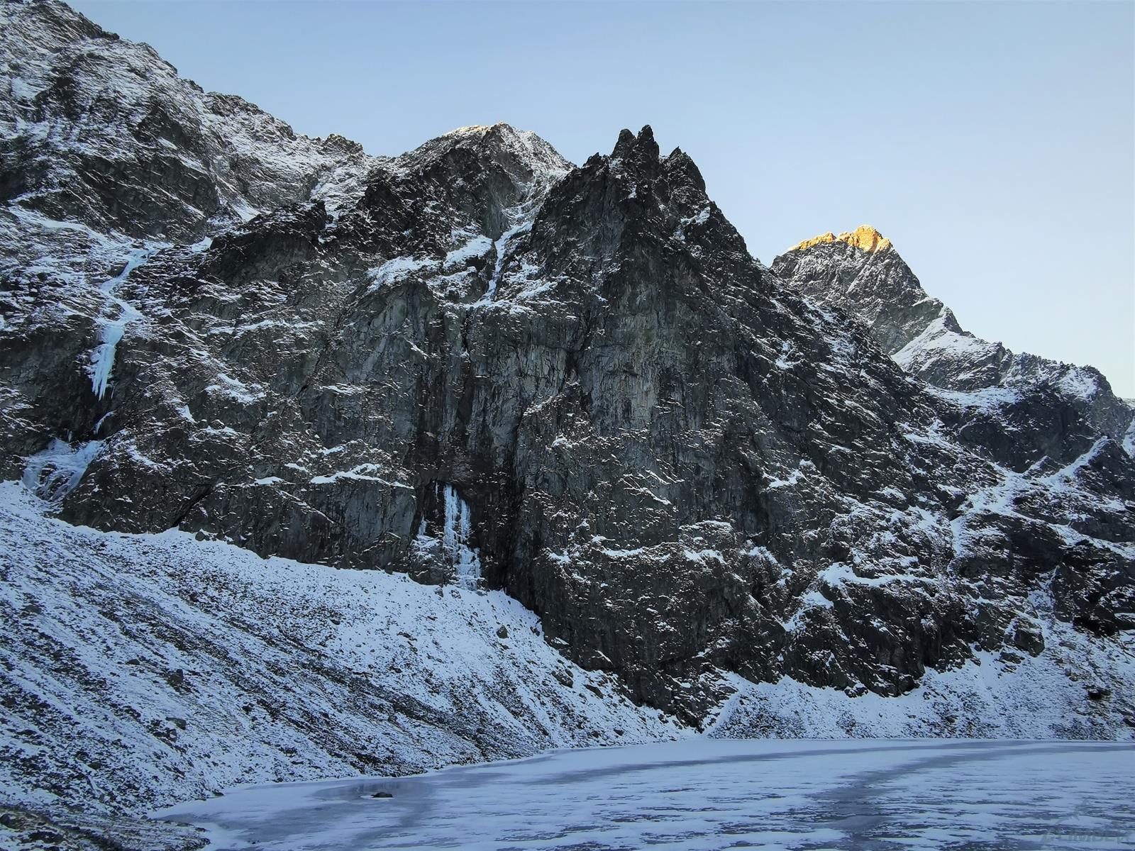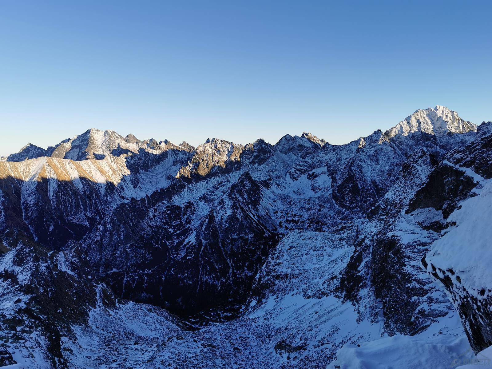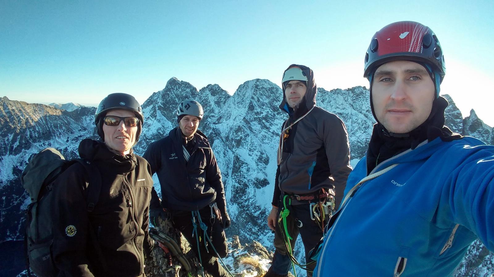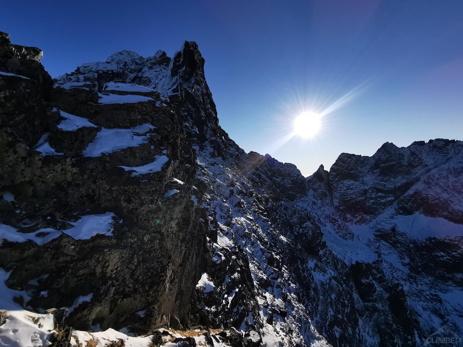 Filar Kopy Spadowej to ładna alpiniada z czterema trudniejszymi odcinkami skalnymi – z powodu dość skomplikowanego zejścia warto wybrać się na nią w dogodnych warunkach. Bardzo mała ilość śniegu oraz ograniczone możliwości działania (Słowacja zamknięta z powodu Covida) spowodowały, że w grudniu 2020 drogą zainteresowało się kilka zespołów 😉. Mimo krótkiego dnia i konieczności działania car-to-car (zamknięte schronisko), decydujemy się w 4-osobowym składzie również na nią wybrać – wybór okazuje się słuszny, linia jest ciekawa, a nieprzyjemne zejście wynagradzają kapitalne widoki na grań Morskiego Oka wraz z jej północnym murem. Zdecydowanie polecam.