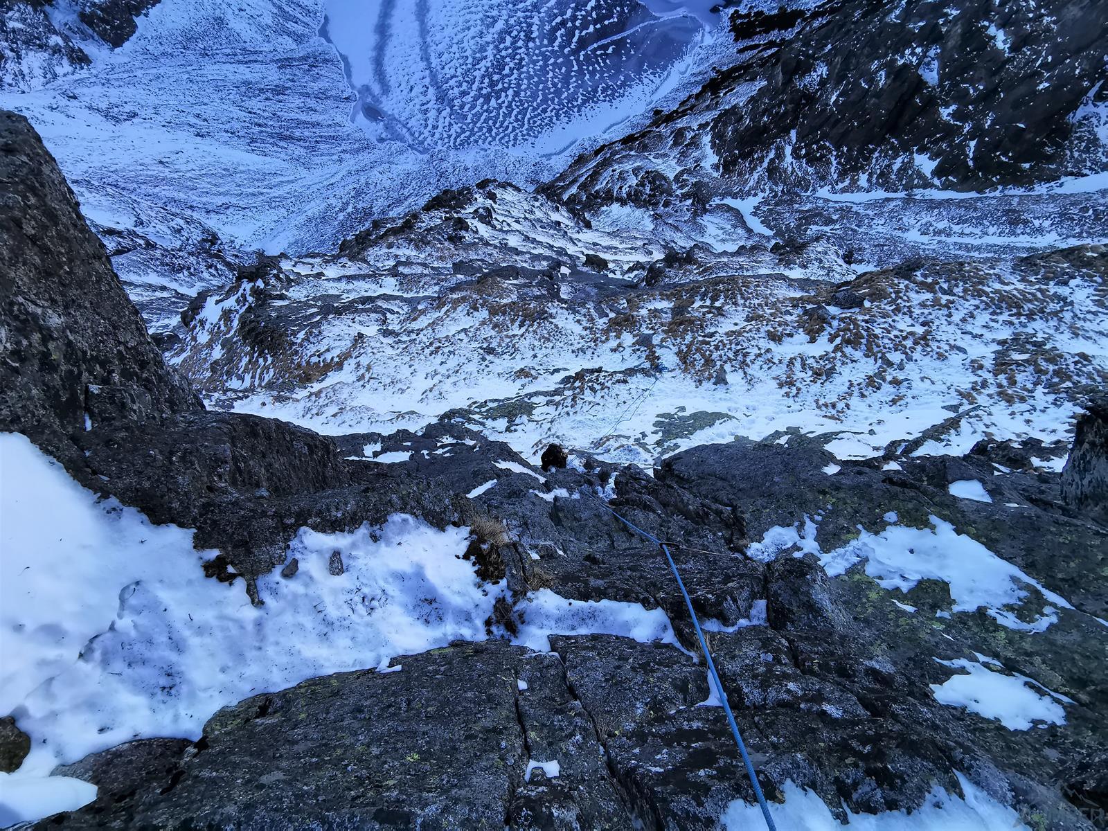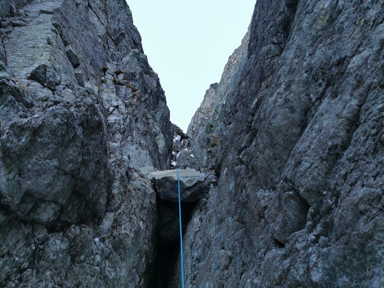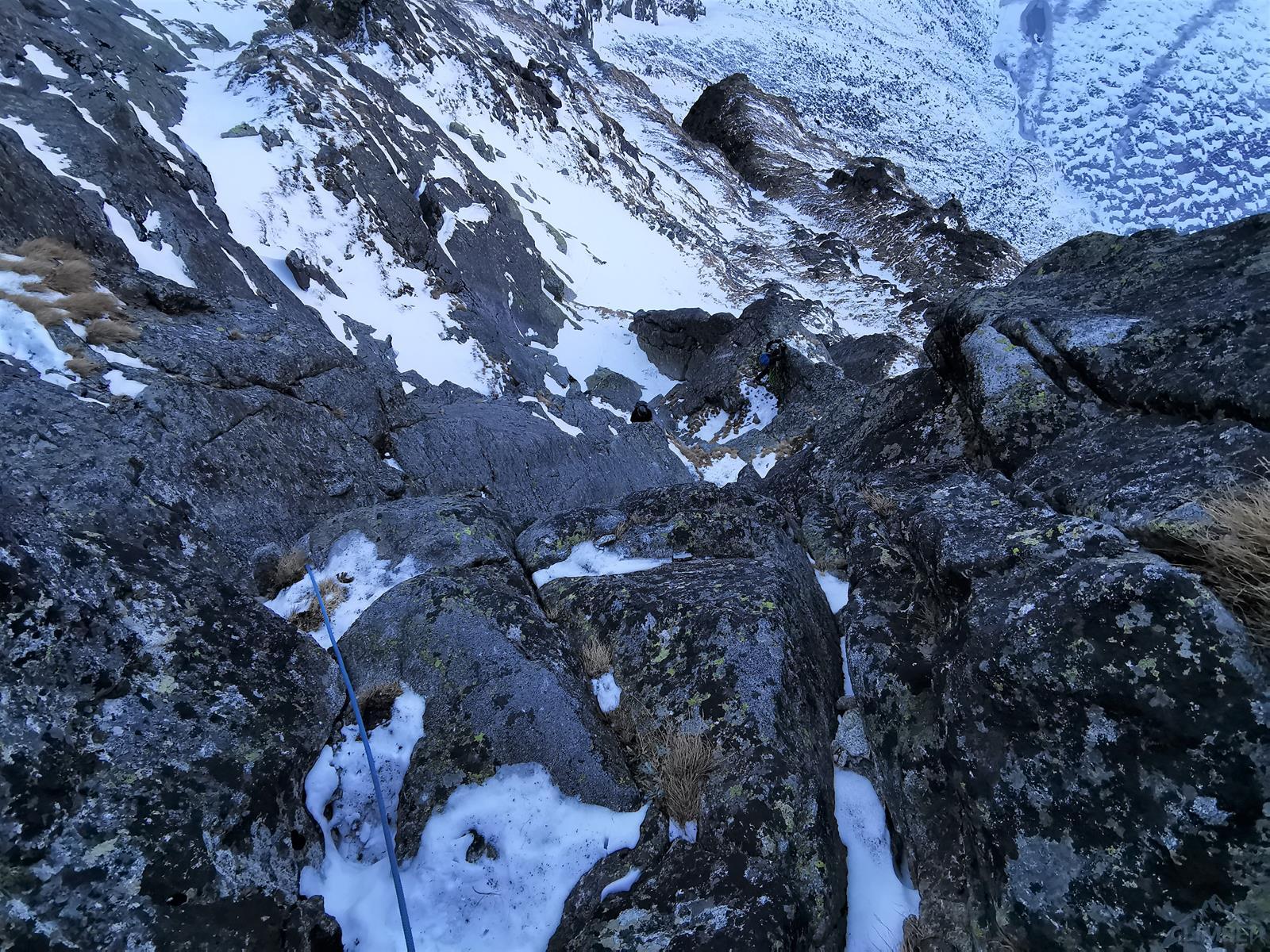 Tutaj spędzamy trochę czasu na rekonesansie – pod ścianą ślady się rozchodzą, a Mastertopo sugeruje by w uskok wchodzić w mało logicznym i wyglądającym na zapych miejscu. Widoczne kilka metrów na prawo haki i ślady raków na skale utwierdzają nas w przekonaniu, że to właśnie tędy prowadzi wariant zimowy za 6 – oryginalnie droga idzie za filar w lewo by w łatwiejszy sposób (IV) wydostać się nad uskok, część śladów prowadzi właśnie tam. Kluczowy wg topo odcinek okazuje się krótką, świetnie urzeźbioną ścianką z dużą ilością haków, wycena M6 z MT i Supertopo jest wg nas zdecydowanie na wyrost, zimowe 5/5+ byłoby bardziej na miejscu, choć duże obłe klamy sprzyjają raczej wspinaniu na rękach niż na dziabach. Po przejściu trudności robimy trawers w prawo ciasnym tunelem pomiędzy blokami skalnymi i docieramy do gotowego (2 haki i rep) stanowiska.