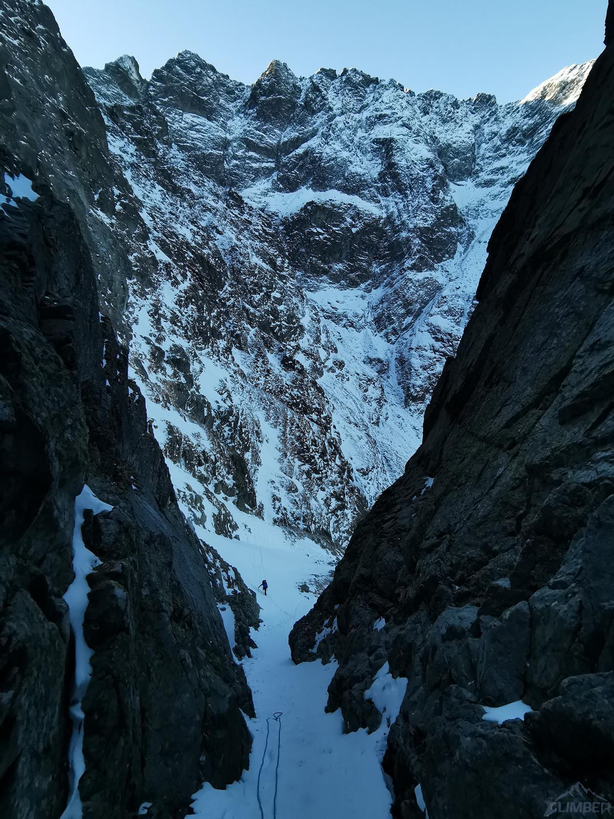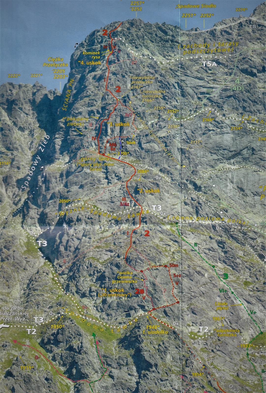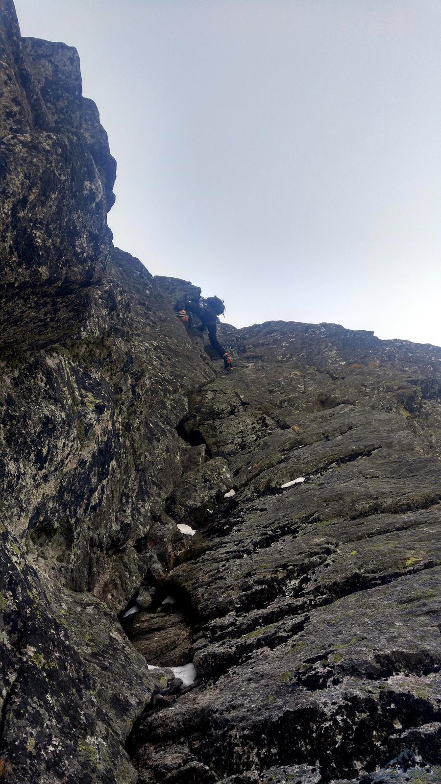 Po wyjściu z komina czeka nas podejście ok. 60 metrów na Pierwsze Siodełko łatwą Rynną Orłowskiego i około 20 metrowy trawers w prawo pod trudno wyglądające zacięcie – na Pierwszym Uskoku istnieje też Wariant Skoczylasów wprost (również letnie V). Zmieniamy się i ostrożnie wchodzę na trawiastą półeczkę, z której wchodzi się w zacięcie – tutaj czeka około 20 metrów czujnego drytoolowego wspinania (5+, haki i dobra własna), według nas jest to najtrudniejszy odcinek na całej drodze. Stanowisko warto założyć po wyjściu z trudności, dalej czeka nas bowiem spory odcinek łatwego terenu. Przechodzimy na lotną i idziemy najpierw żeberkiem, po czym środkiem Drugiego Uskoku (miejsce 3-4), po przejściu którego wychodzimy na taras pod Trzecim Uskokiem.