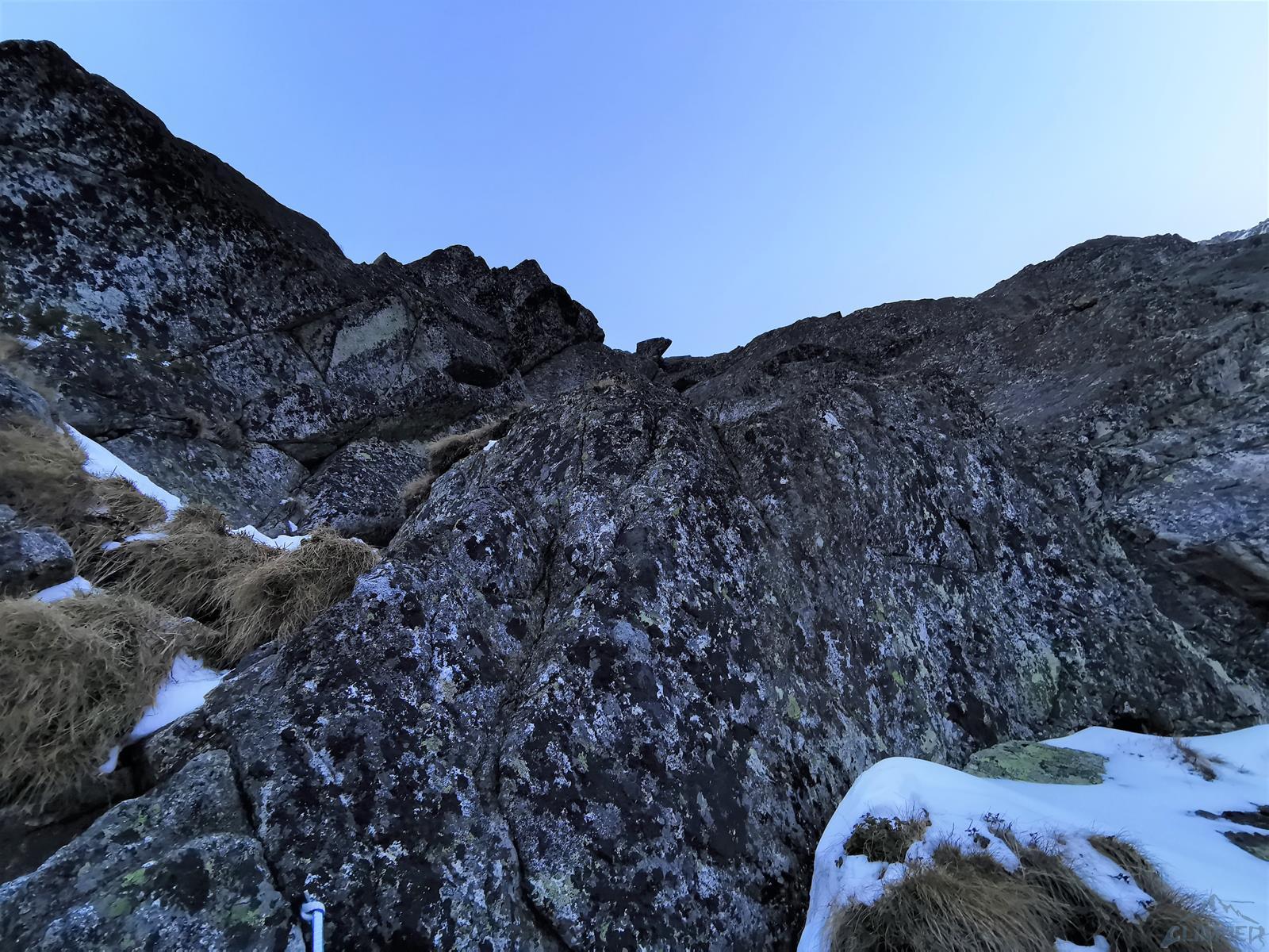 Startujemy później niż zakładaliśmy (przed 9-tą), wraz z Jackiem ruszamy jako pierwszy zespół, za nami podążają Michał z Szymonem. Widoczne ślady poprzedników i odkryte trawy zdecydowanie przyspieszają zadanie – łatwą Rynnę Sawickiego i Dolny Kocioł przechodzimy szybko na lotnej, zatrzymuję się dopiero gdy idący przodem Jacek dociera pod drugi próg w kominie – pod pierwszym jest dobre miejsce na stanowisko. Znikoma ilość śniegu powoduje, że progi nie są podsypane i o ile pierwszy jest łatwy, w drugim trzeba wykonać kilka sprężnych ruchów (zimowe 5). Kilka metrów powyżej po lewej stronie jest hak – dobre miejsce na stanowisko.