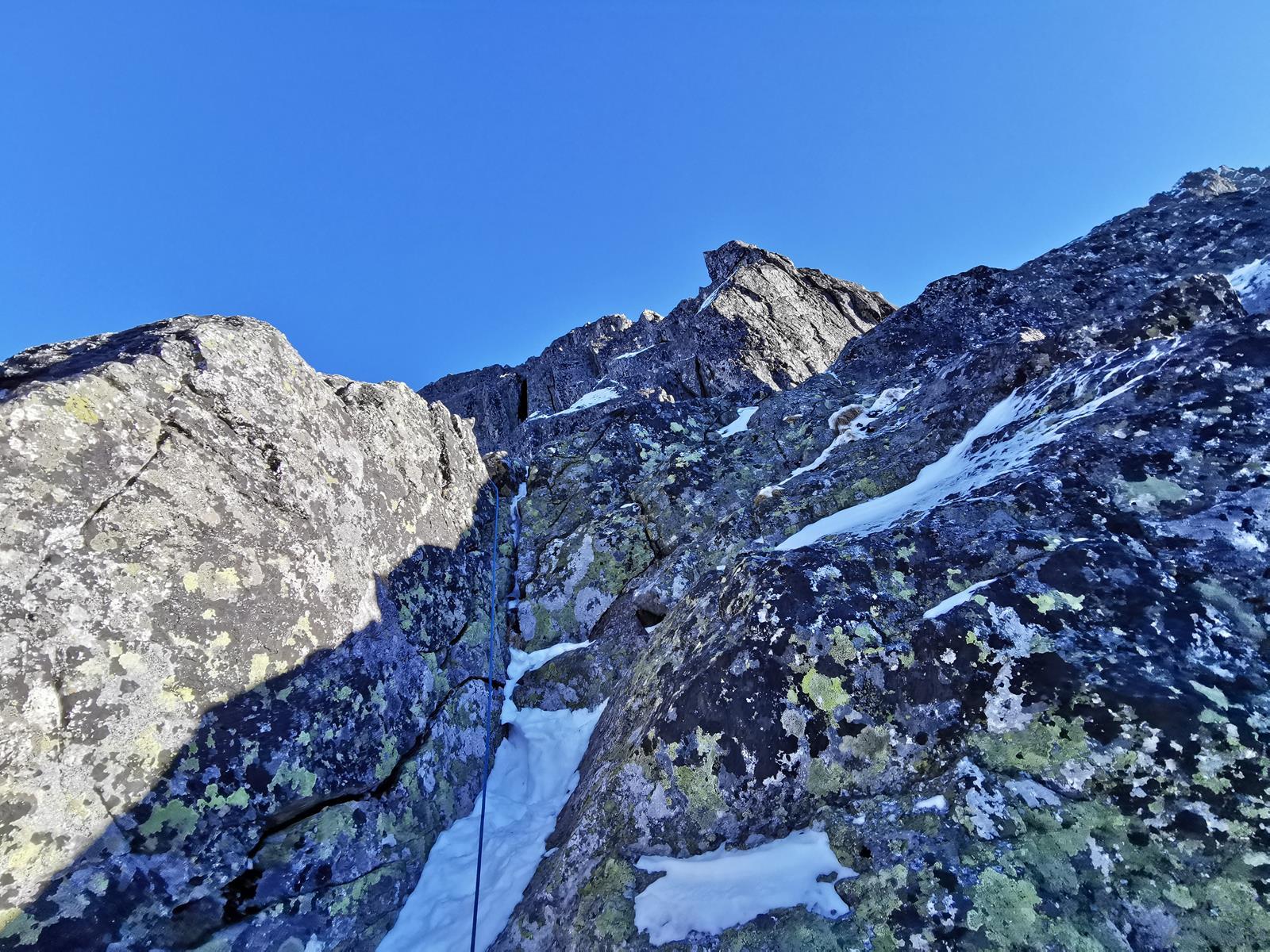 Ponownie przechodzimy na lotną – po przejściu rynny po lewej stronie docieramy do przełączki i „jak puszcza” kontynuujemy żeberkiem do góry – aż pod kolejny, Czwarty Uskok, pod którym robimy stanowisko. Dalej zdecydowanie lepiej iść oryginalnym, lewym wariantem – prawy jest niezbyt przyjemny i czeka nas po nim trawers powrotny pod ostatnią trudność na drodze – kilkumetrowe zacięcie z rysą, całkiem niebanalną (5) przy niskim stanie śniegu 😉. Po wyjściu z trudności idziemy ponownie na lotnej (warto skrócić) zygzakiem pomiędzy skałami, aż do samego szczytu Kopy Spadowej, na którym stajemy przed 14-tą. Podziwiamy widoki, grzejemy się (zachodnia wystawa więc po południu w górnej części drogi możemy liczyć na Słońce) i czekamy na chłopaków by wspólnie schodzić.