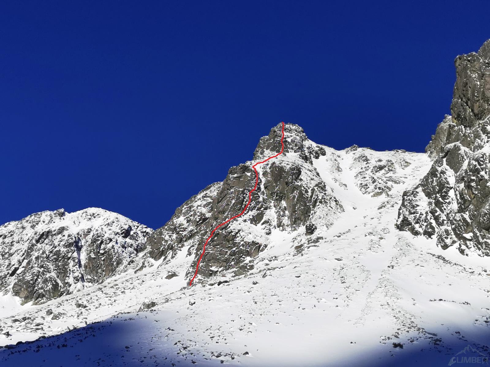 Pierwszy wyciąg jest całkowicie skalny (letnie III, w zimie ok. M4) – po dość czujnym starcie kierujemy się intuicyjnie do góry z odchyleniem w lewo (trafiliśmy na 1 haka, może jest więcej) by po ok. 45 metrach wyjść na trawiastą półkę ze stanowiskiem. Drugi odcinek jest już bardziej mikstowy i łatwiejszy (ok. M3, 45 metrów) – zaczynamy od trawersu za ostrze filara w prawo i trawami poprzetykanymi skałami kierujemy się do góry, do kolejnego stanowiska. Stąd wspinamy się skałami (wariant kominem po prawej w przypadku wylodzenia) około 20 metrów i wychodzimy w łatwiejszy teren – nie szukałem stanowiska po lewej ale od razu poszedłem do góry i przeszliśmy na lotną, gdy skończy się lina do przejścia jest jeszcze ok. 50 metrów pod kopułę szczytową.