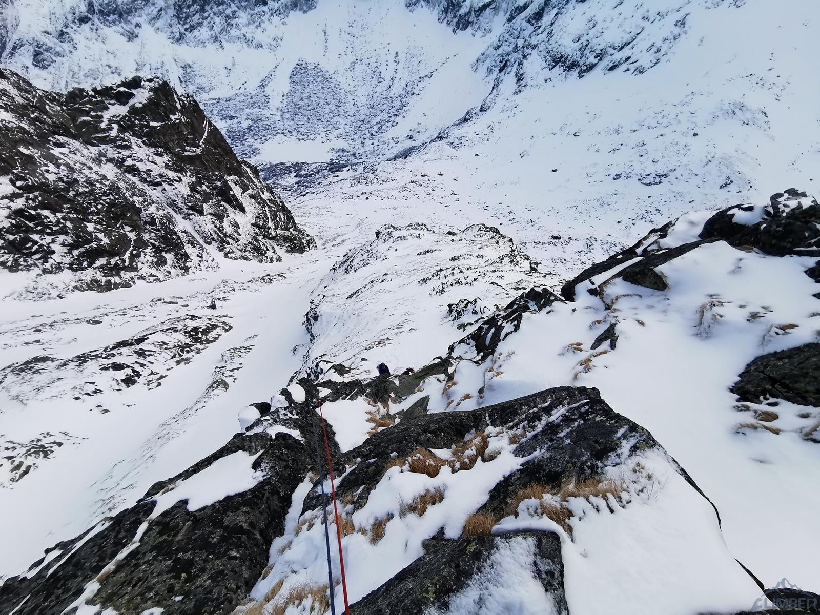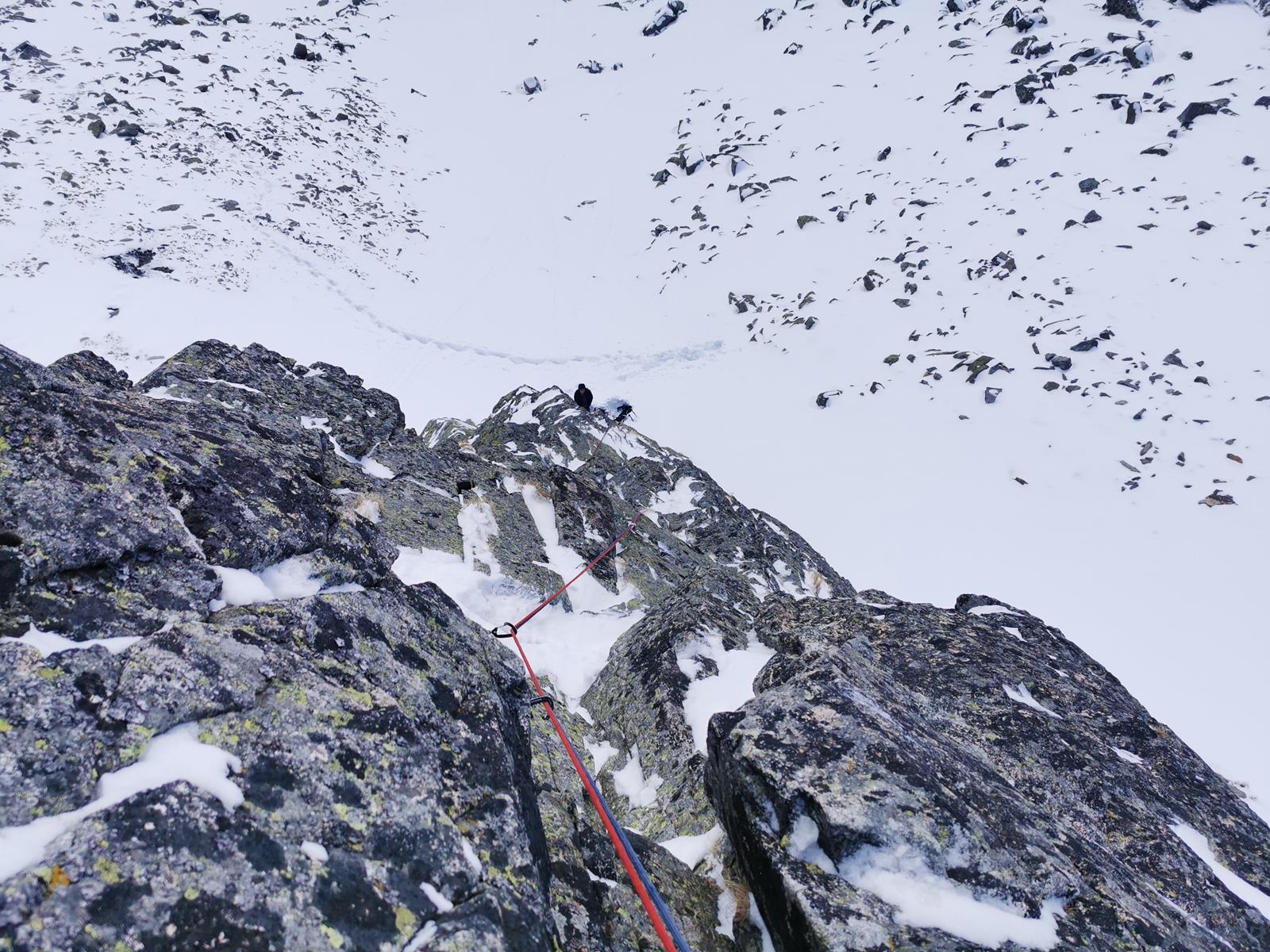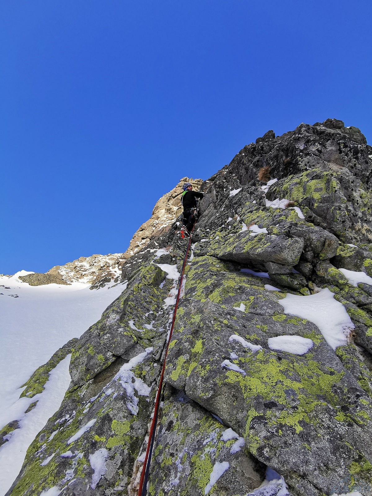 Górne spiętrzenie pokonaliśmy trochę na prawo od jej centralnej części, możliwości jest sporo – idąc bardziej na lewo będzie trudniej, jeszcze bardziej na prawo – łatwiej. Wybrany przez nas wariant prowadził krótką skalną ścianką (M3-M4), po której czekało jeszcze ok. 30 metrów mikstu aż do wyjścia z trudności (dobre miejsce na stan). Ostatnie 50 metrów to już deptanie po śniegu i trawach, na szczycie czekają na nas syczące kozice – w końcu to ich Kopka 😊. Cieszymy się kapitalnymi widokami m.in. na masyw Kieżmarskiego w oddali oraz piękne płyty Koziej Turni obok, robi się jednak ciemno oraz mocno mrozi, dlatego po chwili rozpoczynamy zejście. Śnieg w żlebie jest taki sobie, miejscami wybieramy więc odkrytą grzędę i schodzimy z asekuracją. Wracamy do opustoszałego schroniska, gdzie gorąca zupa wchodzi jak złoto.