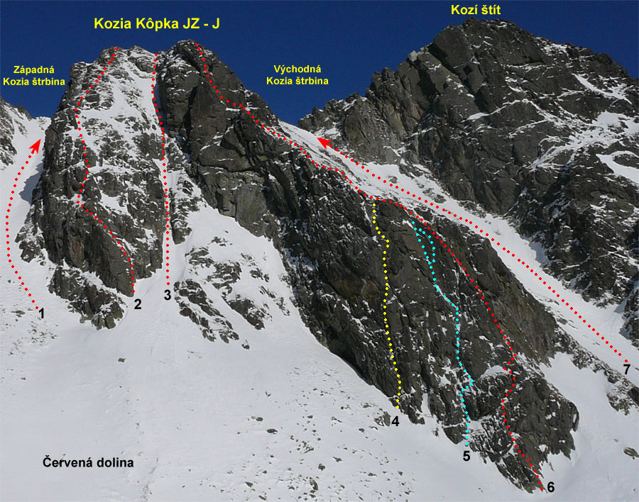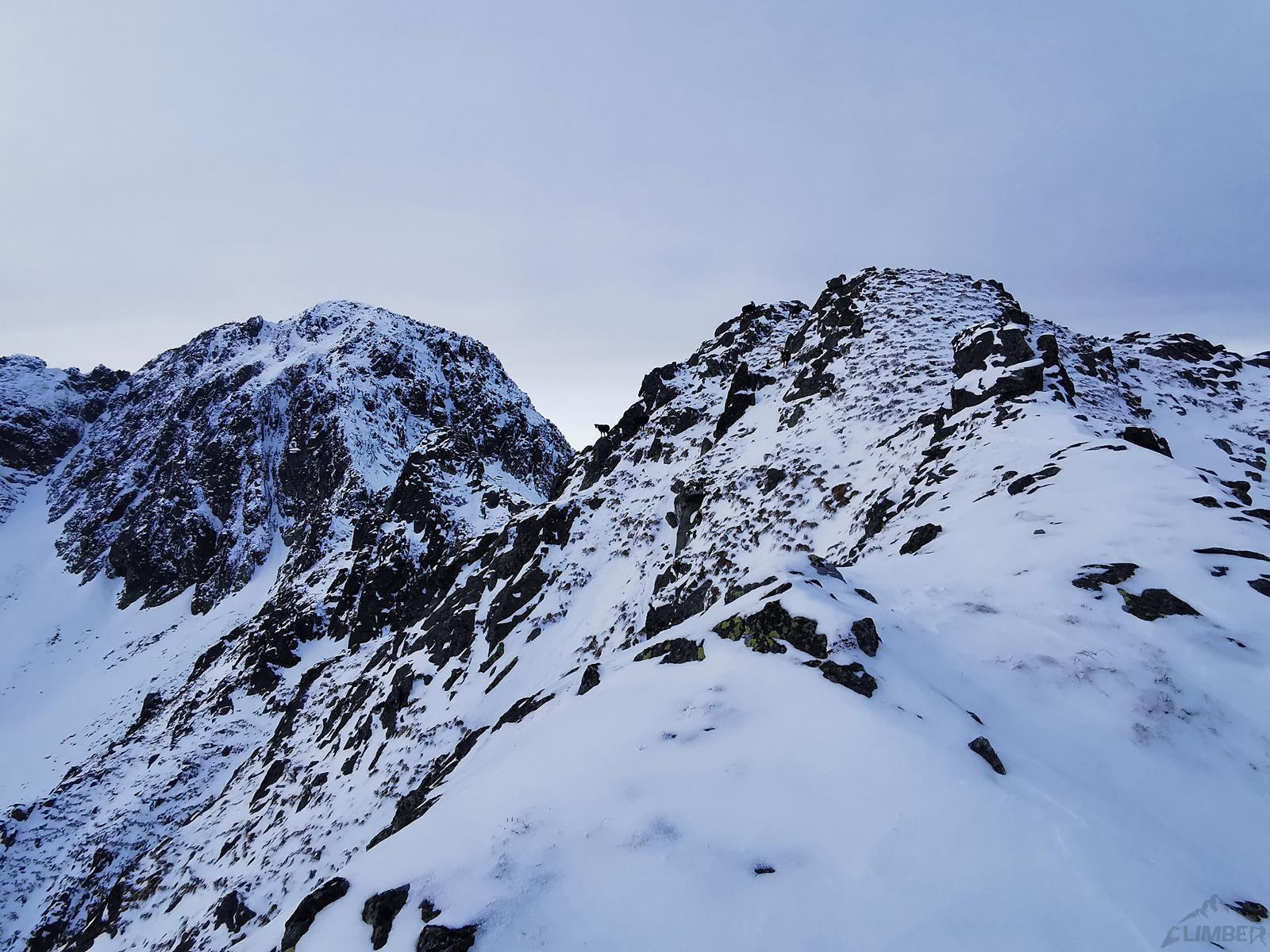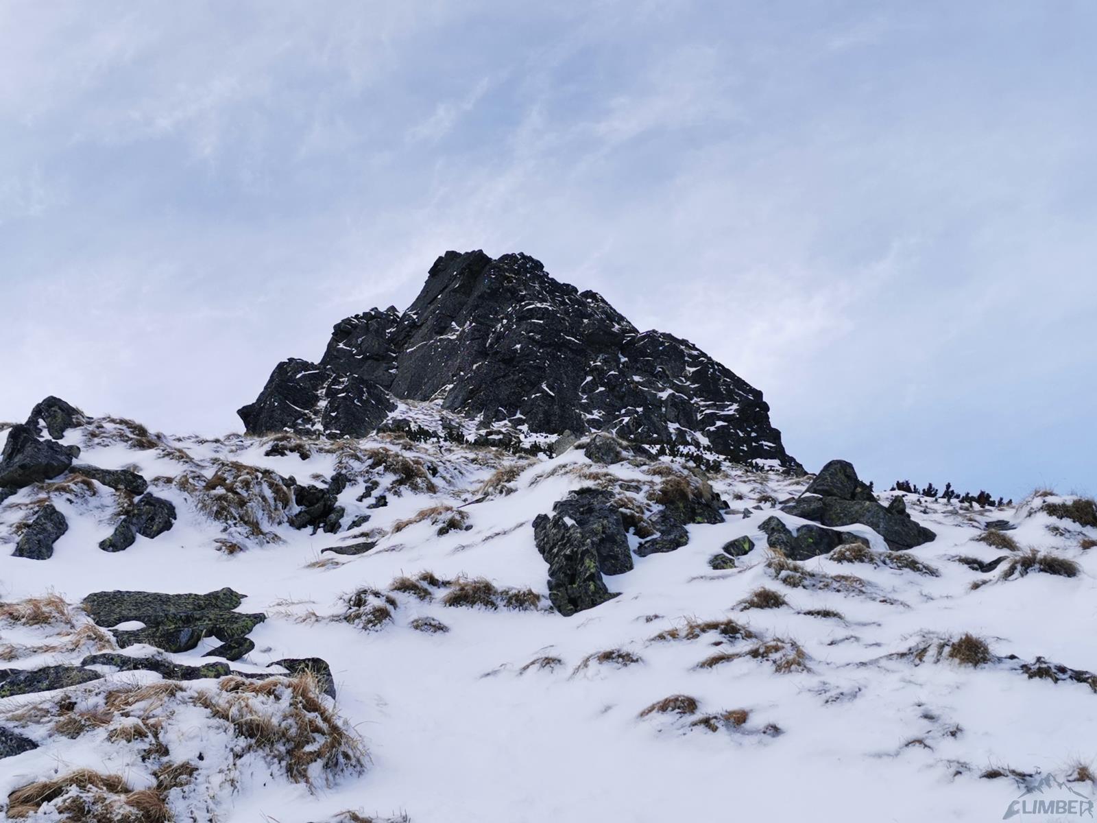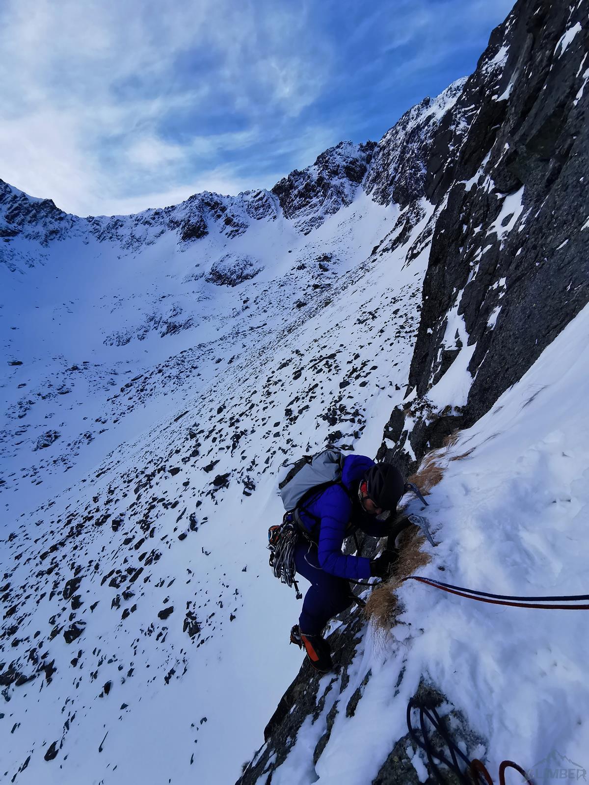 Górne spiętrzenie pokonaliśmy trochę na prawo od jej centralnej części, możliwości jest sporo – idąc bardziej na lewo będzie trudniej, jeszcze bardziej na prawo – łatwiej. Wybrany przez nas wariant prowadził krótką skalną ścianką (M3-M4), po której czekało jeszcze ok. 30 metrów mikstu aż do wyjścia z trudności (dobre miejsce na stan). Ostatnie 50 metrów to już deptanie po śniegu i trawach, na szczycie czekają na nas syczące kozice – w końcu to ich Kopka 😊. Cieszymy się kapitalnymi widokami m.in. na masyw Kieżmarskiego w oddali oraz piękne płyty Koziej Turni obok, robi się jednak ciemno oraz mocno mrozi, dlatego po chwili rozpoczynamy zejście. Śnieg w żlebie jest taki sobie, miejscami wybieramy więc odkrytą grzędę i schodzimy z asekuracją. Wracamy do opustoszałego schroniska, gdzie gorąca zupa wchodzi jak złoto.