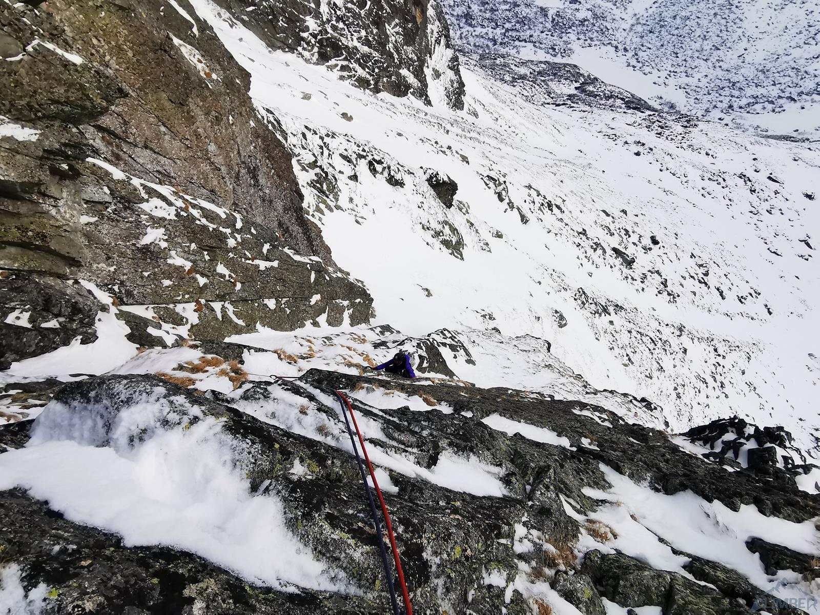 Podsumowując – droga robiona zimowo stanowi bardzo ciekawą alternatywę dla łatwych i krótkich oklepanych klasyków (np. na Hali), jest zróżnicowana oraz wyprowadza na szczyt w pięknej wysokogórskiej scenerii. W dolnej części ściany znajdują się stanowiska (po 2 ringi) z których w razie potrzeby można zjechać, wyżej istnieje z kolei możliwość łatwego wytrawersowania ze ściany jeżeli braknie czasu lub warunki będą słabe.