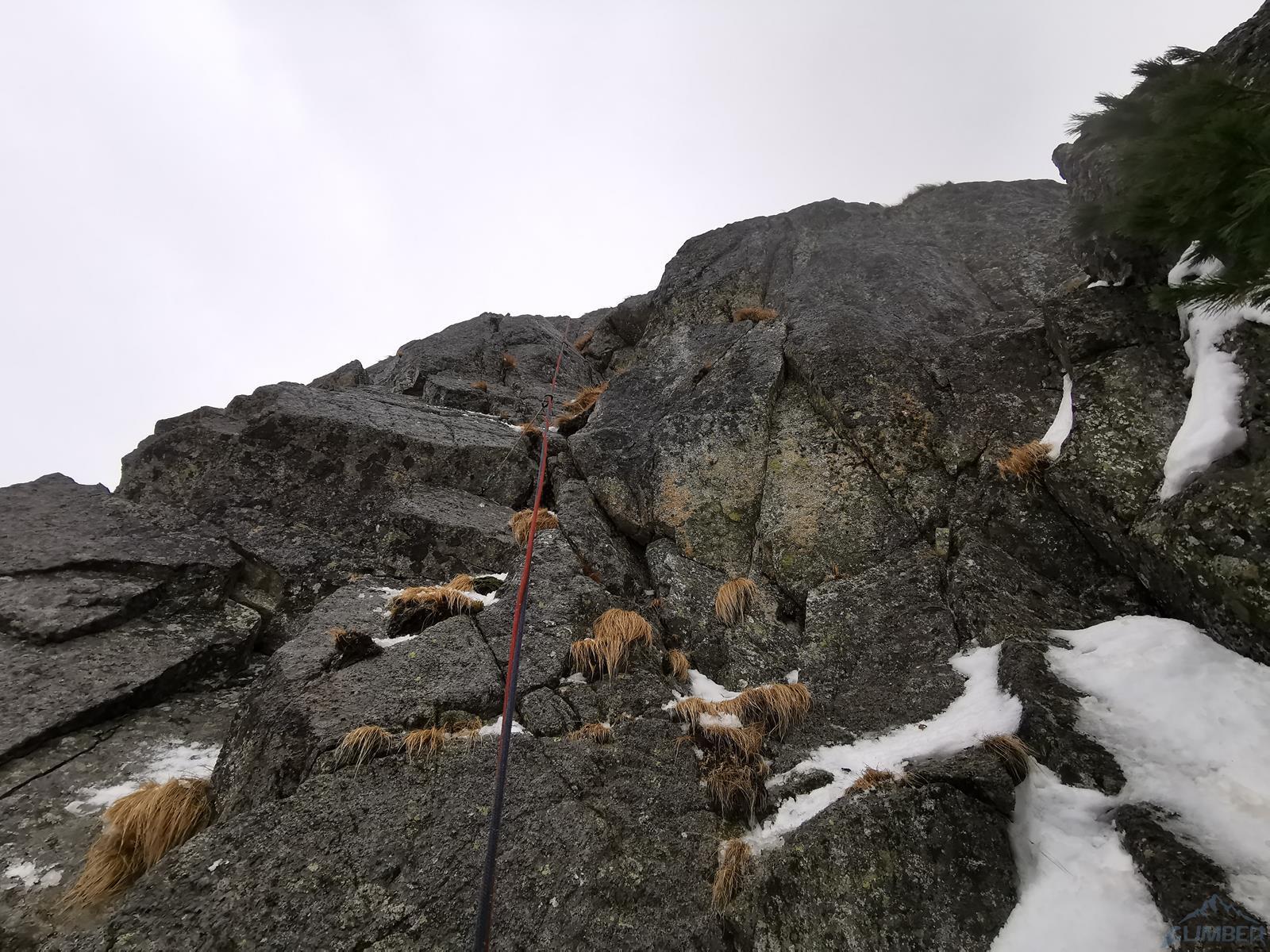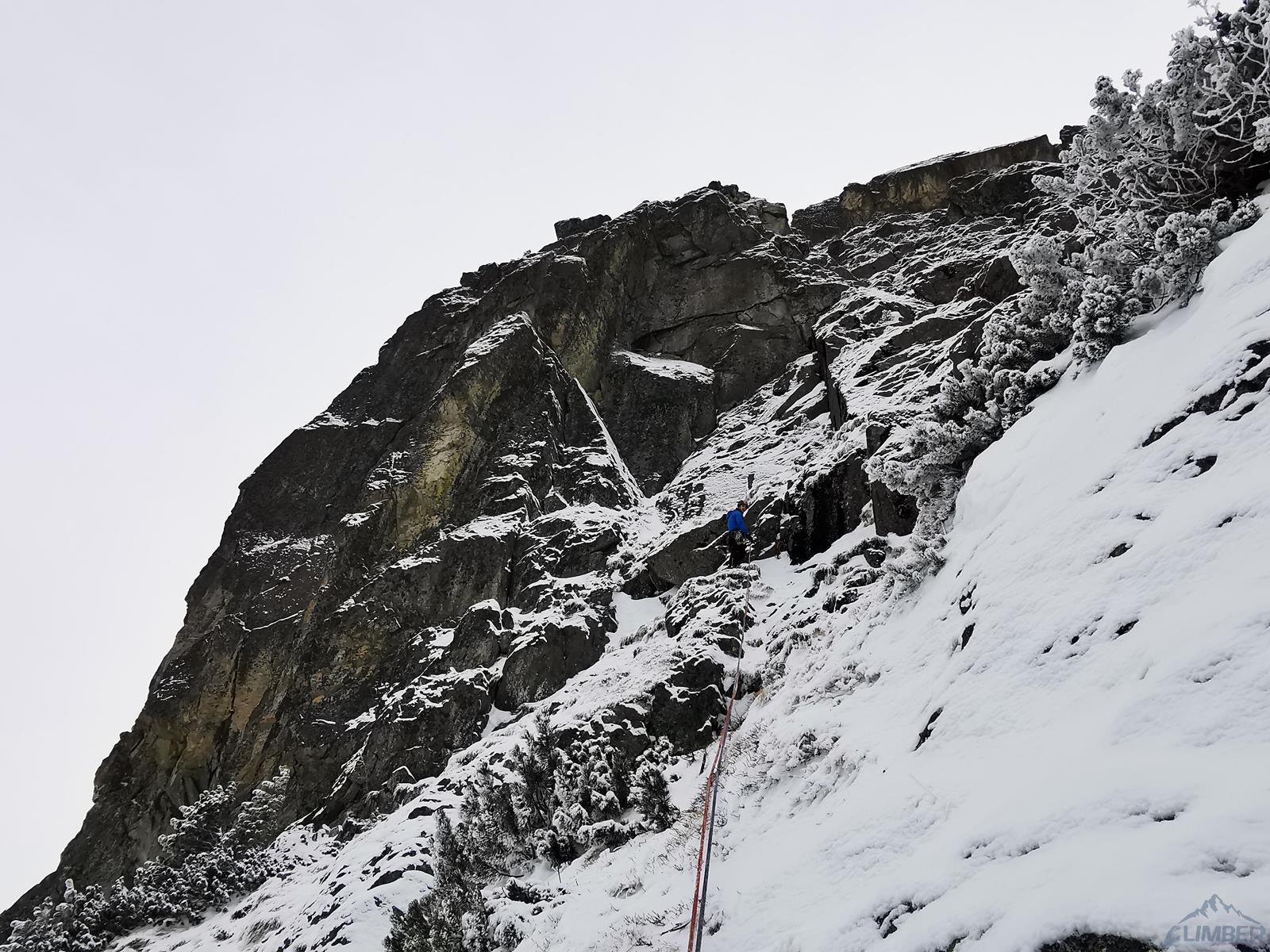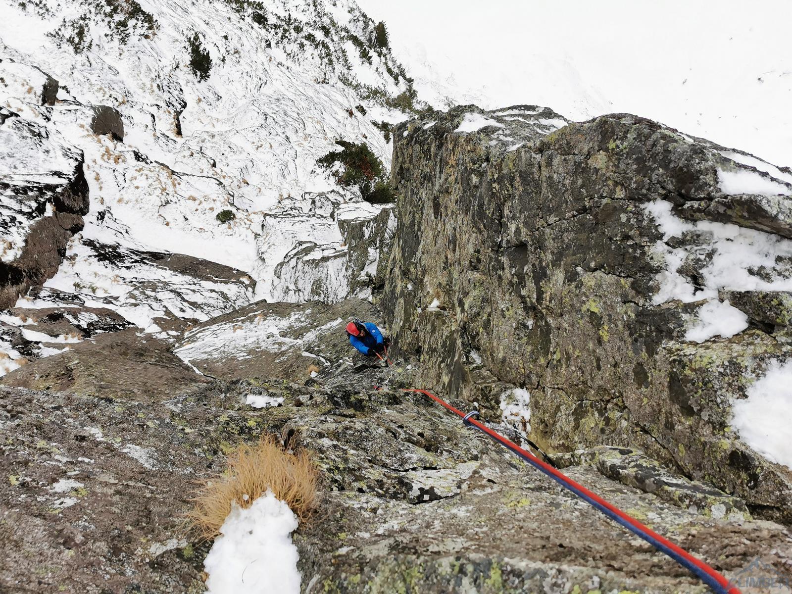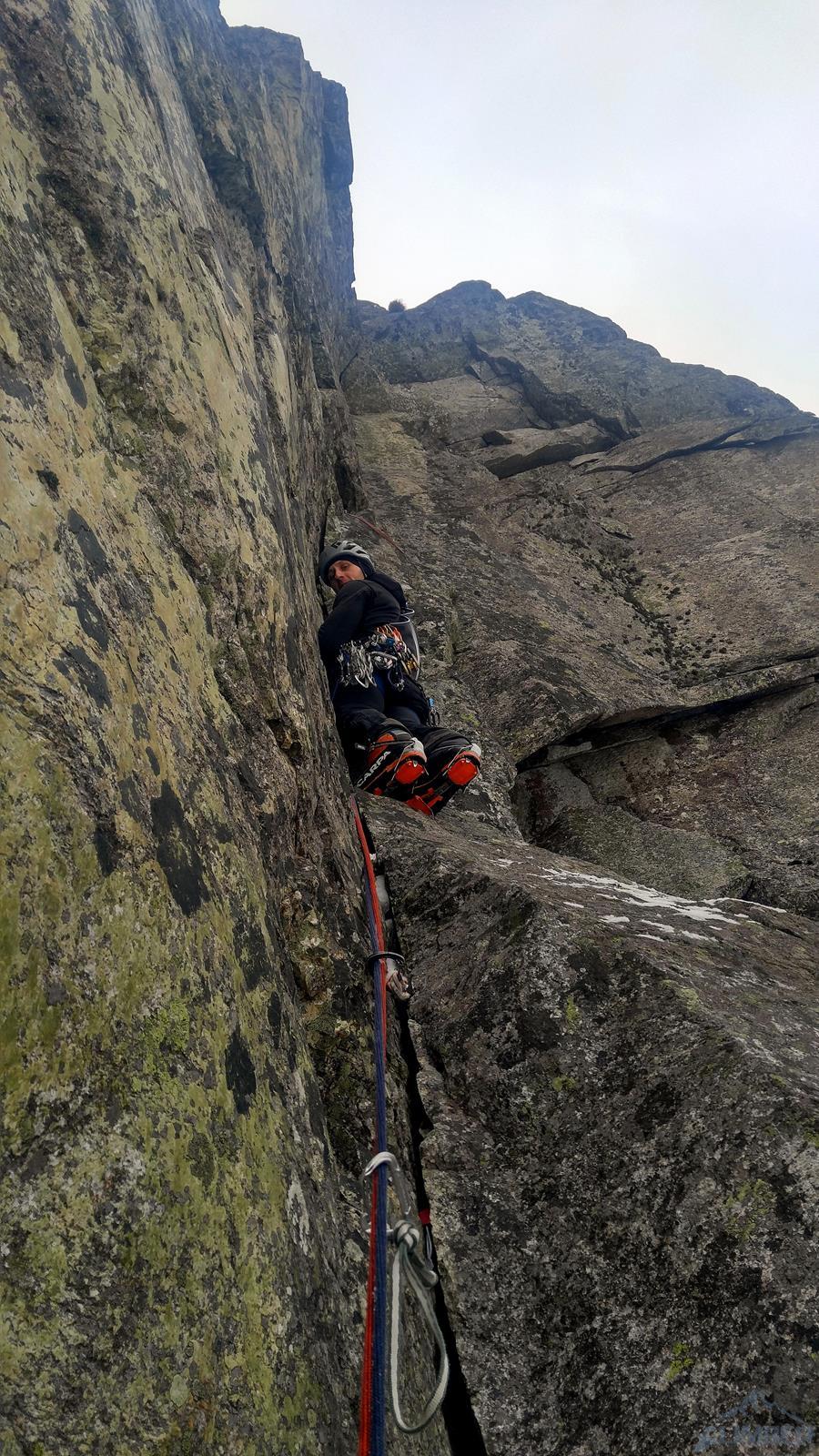 Pierwszy wyciąg zaczyna się z prawej strony ścianki, następnie idziemy „jak puszcza” łatwym (M3) trawiasto-skalnym terenem kierując się w stronę widocznego spiętrzenia skalnego i charakterystycznej skośnej płyty, którą prowadzi kolejny wyciąg. Mamy pod nią ok. 65 metrów więc możemy albo podejść na lotnej albo zatrzymać się pod skałami kilka metrów niżej – ten wariant jest dobry jeżeli kolejne stanowisko planujemy zgodnie ze schematem. Drugi wyciąg jest bowiem bardzo krótki i kończy się (hak pod stan) zaraz po przejściu sympatycznej płytki (M5), którą kolega musi trochę odśnieżyć. Stajemy pod kluczowym odcinkiem drogi (M7), który robi na nas spore wrażenie – nad głową wywiesza się 25-metrowe zacięcie z wąską rysą biegnącą przez prawie całą jego długość. Na patentowanie nie będzie czasu – zrywa się wiatr i nadciągają czarne chmury a wraz z nimi marznący deszcz, także albo OS albo AF…