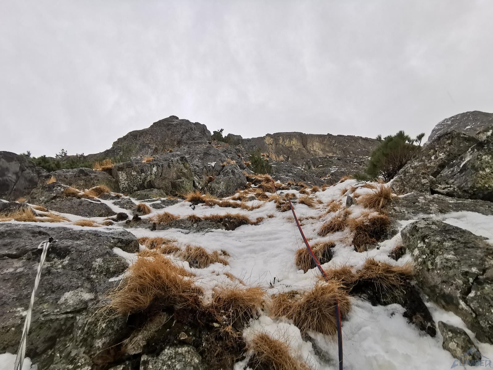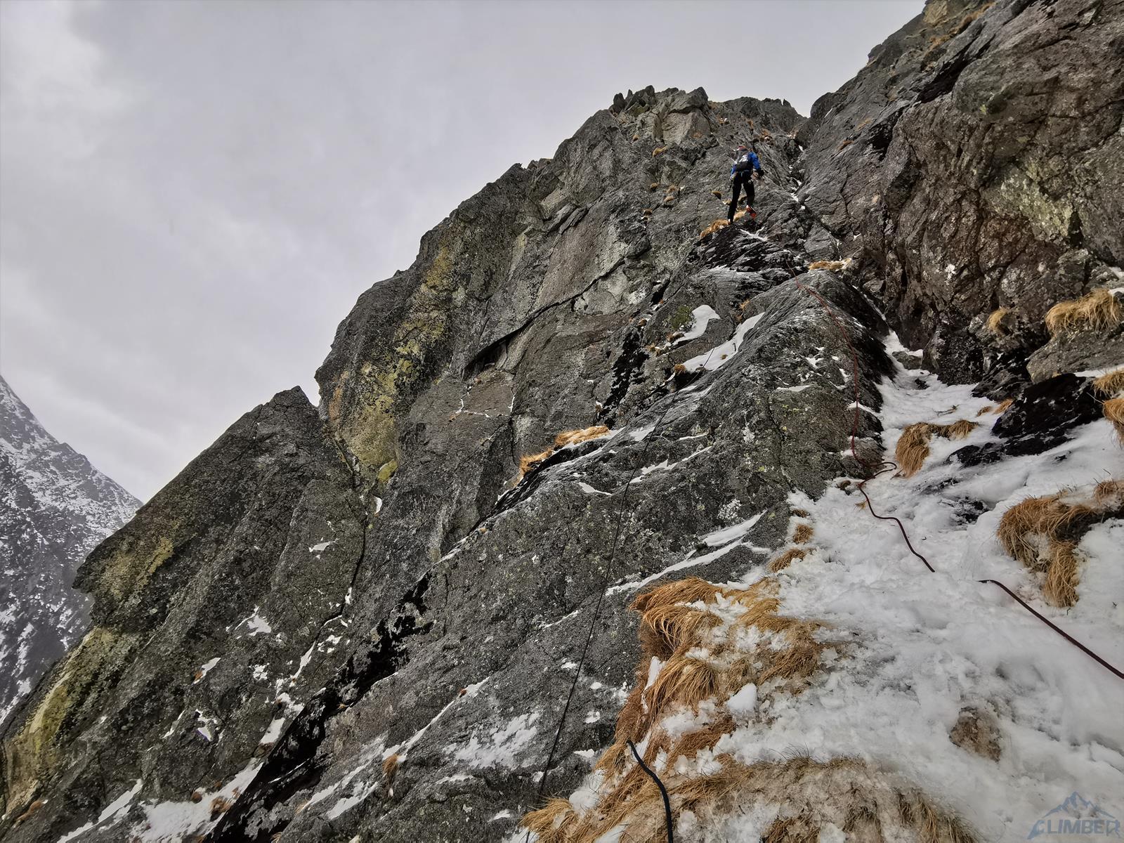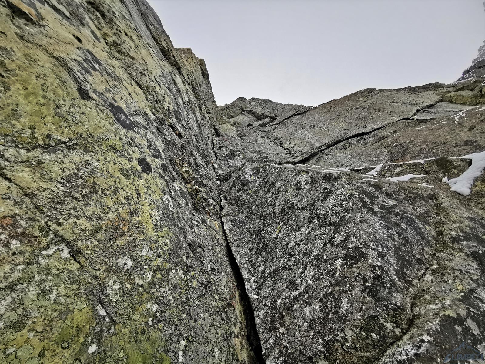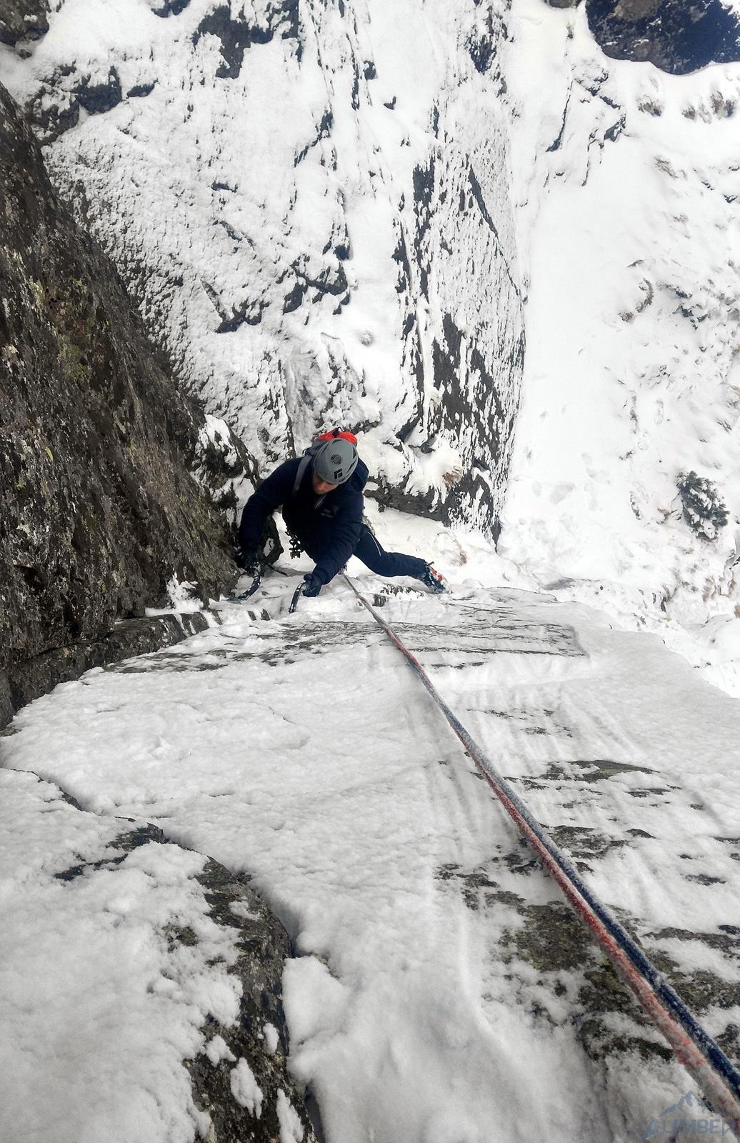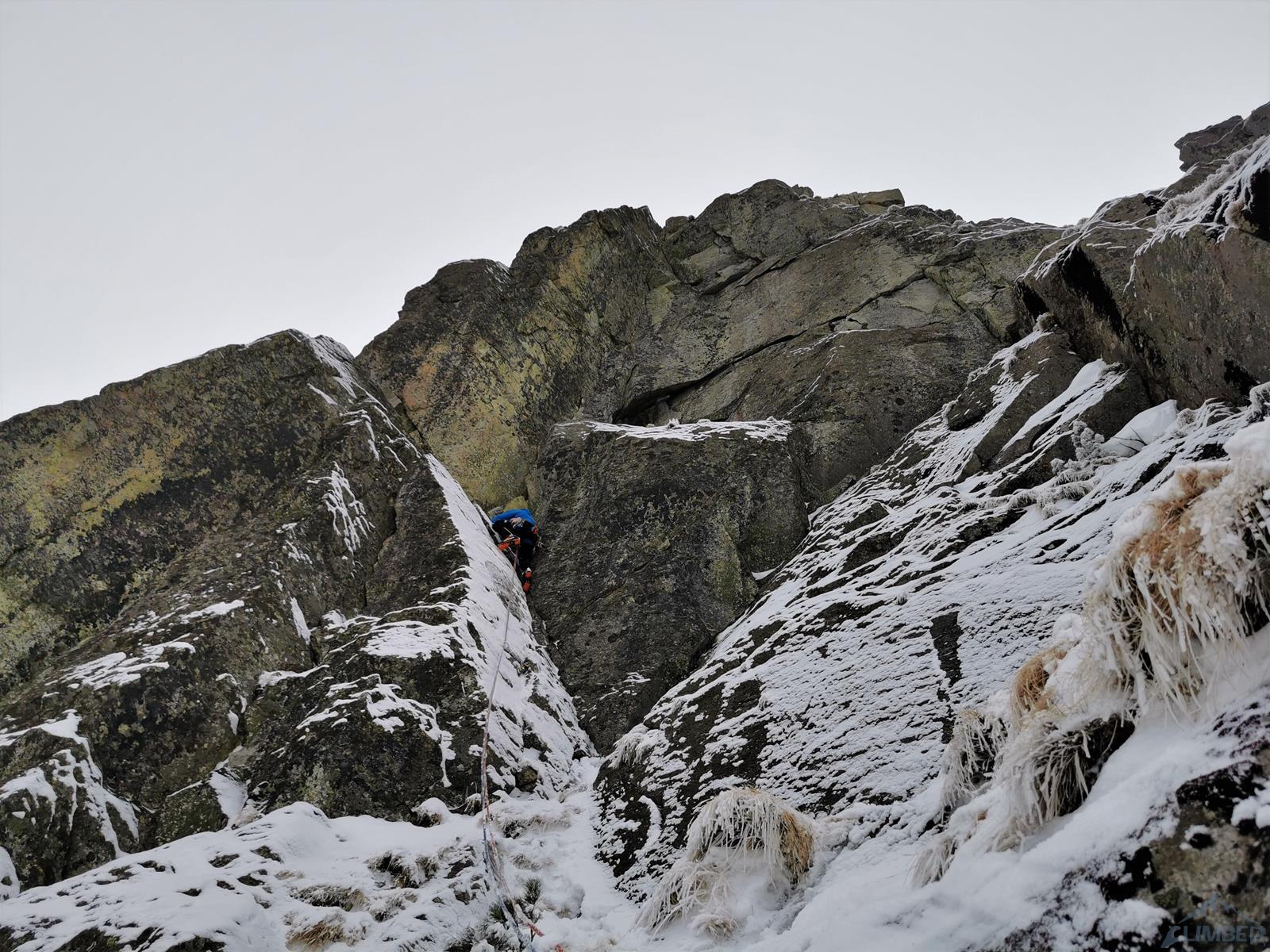Pierwszy wyciąg zaczyna się z prawej strony ścianki, następnie idziemy „jak puszcza” łatwym (M3) trawiasto-skalnym terenem kierując się w stronę widocznego spiętrzenia skalnego i charakterystycznej skośnej płyty, którą prowadzi kolejny wyciąg. Mamy pod nią ok. 65 metrów więc możemy albo podejść na lotnej albo zatrzymać się pod skałami kilka metrów niżej – ten wariant jest dobry jeżeli kolejne stanowisko planujemy zgodnie ze schematem. Drugi wyciąg jest bowiem bardzo krótki i kończy się (hak pod stan) zaraz po przejściu sympatycznej płytki (M5), którą kolega musi trochę odśnieżyć. Stajemy pod kluczowym odcinkiem drogi (M7), który robi na nas spore wrażenie – nad głową wywiesza się 25-metrowe zacięcie z wąską rysą biegnącą przez prawie całą jego długość. Na patentowanie nie będzie czasu – zrywa się wiatr i nadciągają czarne chmury a wraz z nimi marznący deszcz, także albo OS albo AF…