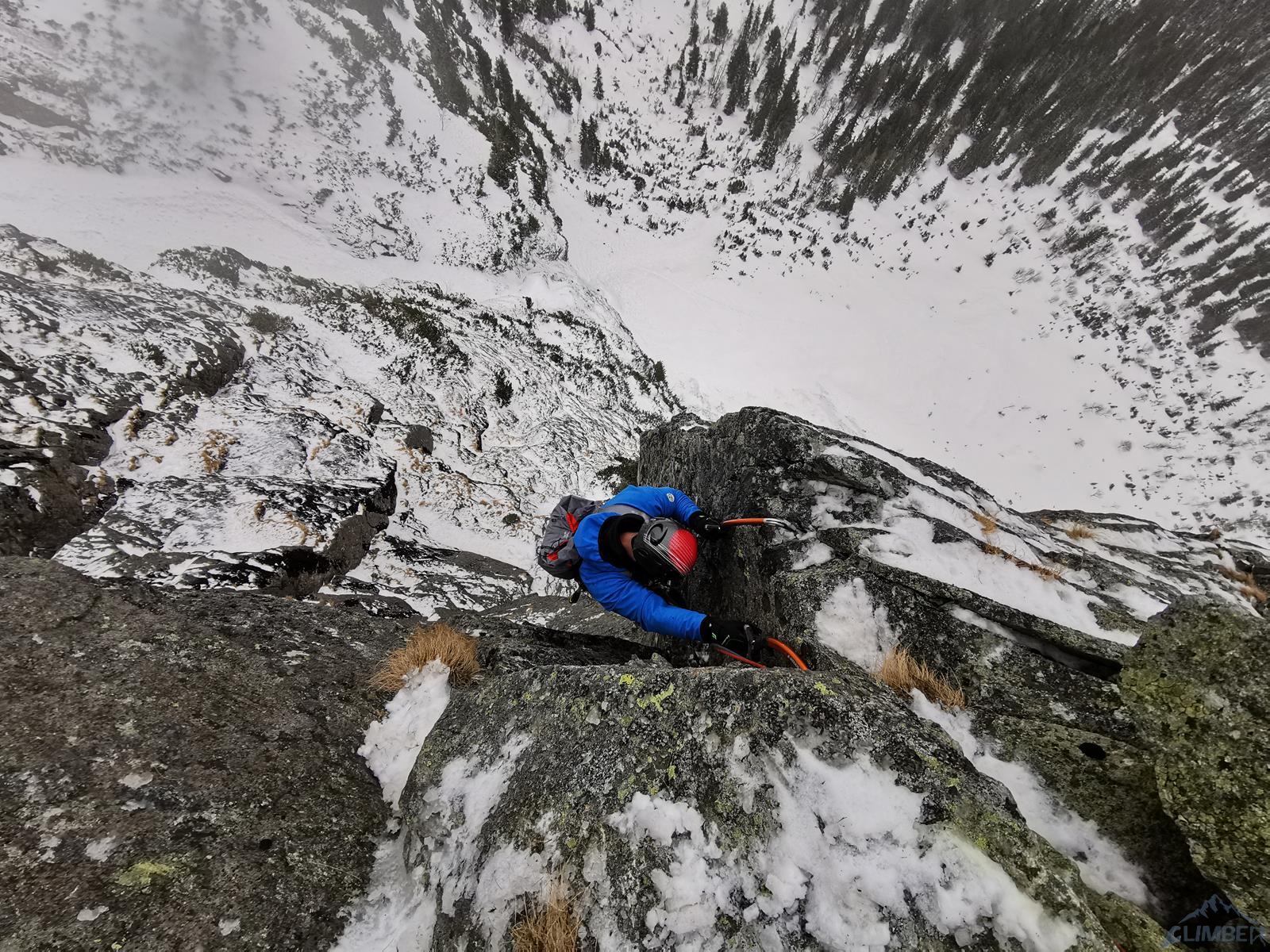Po zebraniu się w sobie startuję, a właściwie długo próbuje wystartować - wejście w zacięcia sprawia sporo problemów, pomaga dopiero wpięcia haka nad głową i wykonanie dwóch dynamicznych przechwytów. Kolejne kilka metrów (2 haki) oferuje świetne wspinanie z dobrymi chwytami pod dziabki, po ostatnim stałym punkcie czyli spicie przy niebezpiecznej odstrzelonej płycie (uwaga!) robi się jednak trudniej – drogę odgradza okapik. W tym miejscu spędzam sporo czasu próbując wyrestować i dobrze się przyasekurować, gdy to się udaje ruszam dalej. Na ostatnim fragmencie czeka jeszcze dość czujne wyjście z zacięcia, które robię już na oparach. Dodatkowo lonża od dziabki "złośliwie" wpina się w ekspres, co dodaje kilka niepotrzebnych ruchów - udaje się jednak dociągnąć do końca bez bloku. Śmieję się później, że bardziej była to walka o przetrwanie niż wspinanie 😉, nie robiłem jednak jeszcze takich trudności zimą w Tatrach więc trzeba sobie wybaczyć - dla wspinaczy z zapasem wyciąg może okazać się przystępny jak na M7.