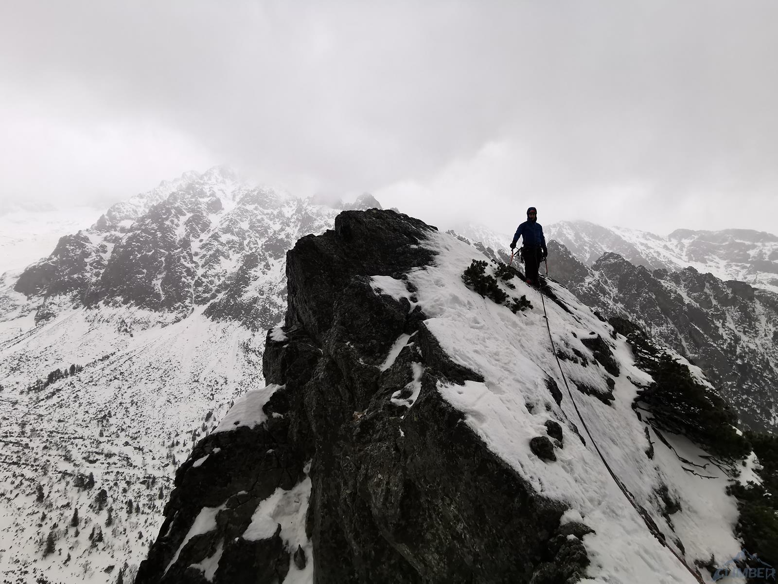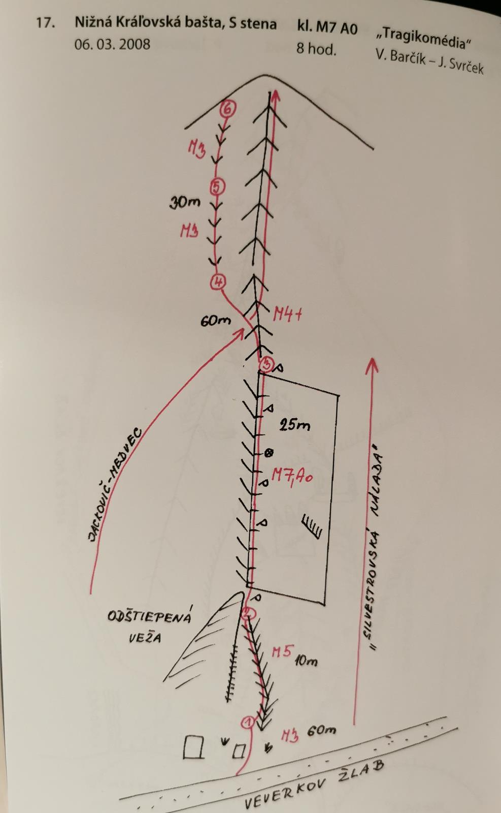 Od kilku tygodni w Tatrach mamy do czynienia z fatalnymi warunkami wspinaczkowymi. Nieliczne dni bez opadów, dużego mrozu i wiatru umożliwiają (niezbyt jednak efektowne) działanie na nisko położonych, niewysokich ścianach. Kolejny weekend zapowiada się podobnie, a okno pogodowe trwać ma zaledwie kilka godzin – postanawiamy spróbować je wykorzystać by zrobić jedną z planowanych na ten sezon dróg. Tragikomédia to krótka linia z jednym trudnym wyciągiem (M7), przewieszonym i czysto skalnym – śnieg się więc go nie ima. Dodatkowo powrót pod ścianę po zakończeniu wspinania umożliwiają zjazdy drogą Silvestrovské Blues. Jest to więc dobry cel również na gorsze warunki, niepewną pogodę lub gdy wyżej działać się nie da.